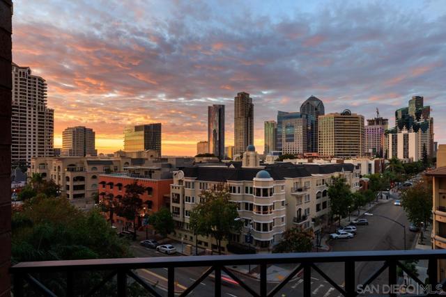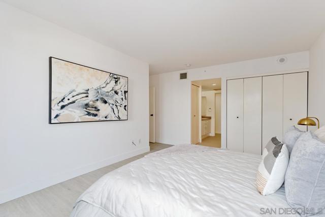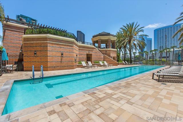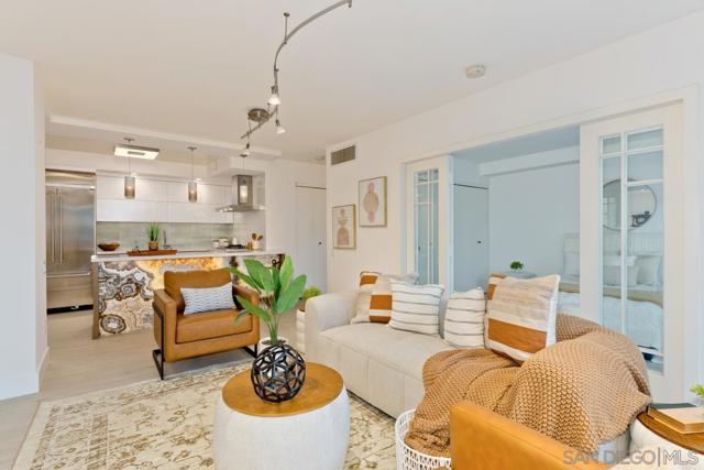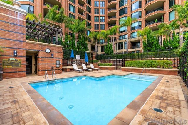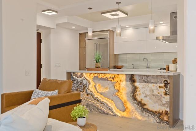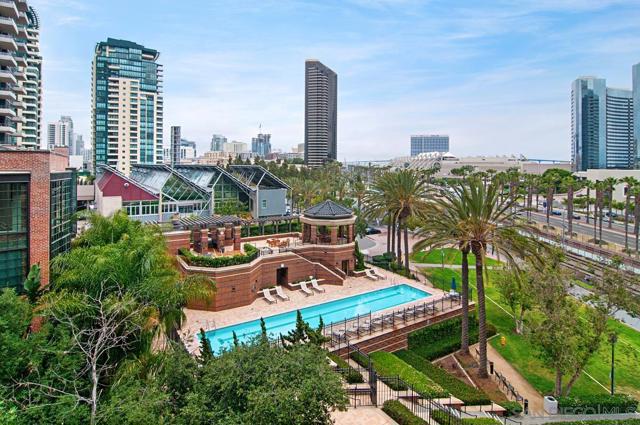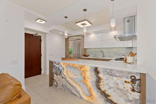 Welcome to Residence 713 at CityFront Terrace—an impeccably upgraded 2BR/2BA home perched on the 7th floor of one of Downtown San Diego’s most iconic buildings. Recently refreshed with brand new flooring and paint, this stunning home blends contemporary finishes with architectural charm. The kitchen has been completely opened up and reimagined with sleek, self-opening cabinetry, high-end appliances, and a dramatic backlit onyx slab under the bar seating—perfect for entertaining or everyday luxury. The open layout flows into a light-filled living space, with the guest bedroom that can double as an office and the primary suite boasts a truly massive closet rarely found in condo living. CityFront Terrace is a full-service luxury community in the heart of the Marina District, known for its historic brick facade and unparalleled amenities including valet parking, two pools (a 75’ lap pool and a splash pool), a 3,500 sqft fitness center with yoga room, the Citrus Room resident lounge, and an on-site staff of 30+. Just steps from the waterfront, Seaport Village, and the Gaslamp Quarter, this is Downtown living at its finest.