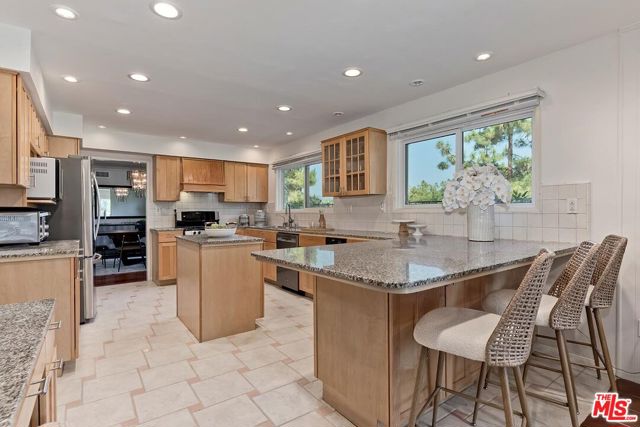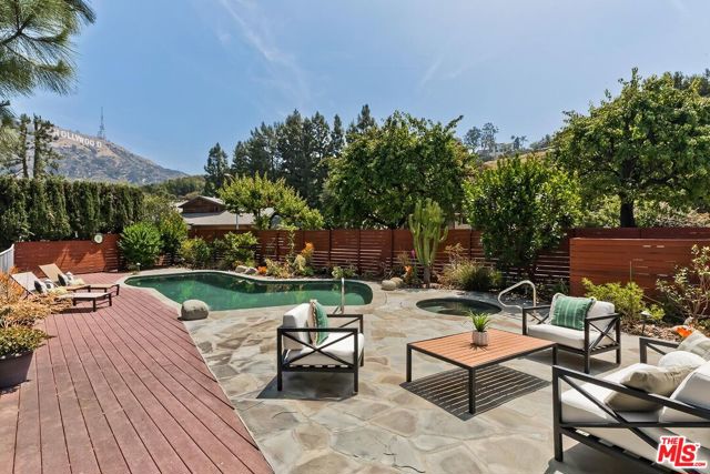 Amazing Opportunity!! This 4-bedroom, 3-bathroom home is located in the exclusive community of Lake Hollywood Estates, on a large 17,638-square-foot lot. The property offers unobstructed views of the Hollywood Sign from both inside and outside the home. It is bordered by a beautiful canyon of pine trees, providing a mountain resort feel. The interior features a large living room, a formal dining room, and a kitchen with extensive counter and cabinet space that opens to a family room with a fireplace, wet bar, and built-in desk. The main level also includes a powder room, a laundry room, and direct access to the garage. All four bedrooms are on the second level, offering views of the canyon and the Hollywood Sign. The spacious primary suite has a deck connecting to two other bedrooms overlooking the canyon. The primary bath includes a spa tub, separate shower, double vanity, and a large, custom walk-in closet. The three guest bedrooms are all good-sized and suitable for use as an office. The private backyard is designed for entertaining, featuring a large pool and a separate spa, with breathtaking views of the Hollywood Sign, the canyon, and Cahuenga Peak (Wisdom Tree hike). Newer custom windows, gorgeous hardwood flooring, and a Culligan water filtration system have been installed in the home. The property is conveniently located minutes from major studios, restaurants, shopping, downtown, and the Hollywood Bowl, and is within walking distance to the Lake, the park, and hiking trails. The property is easy to show.