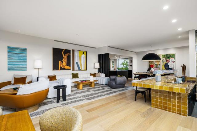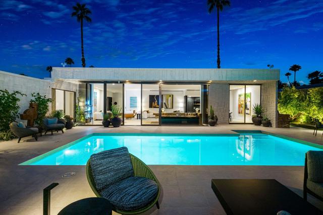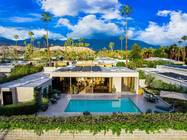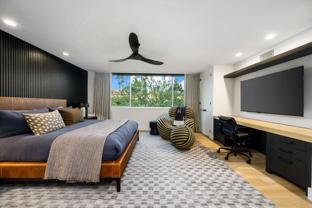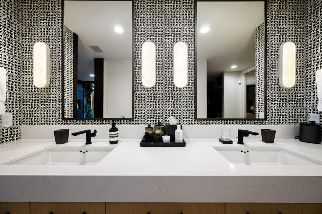 Sophisticated style, high-end appointments and an enviable sense of privacy define this newly reimagined and upgraded Rancho Mirage home. Now the preeminent residence at Tamarisk West, the detached single-level design was taken down to the studs and rebuilt as a modern showplace that is equally adept at accommodating grand entertaining and relaxed daily living. Illuminated by a skylight, the foyer introduces a free-flowing floorplan of approximately 2,958 square feet that presents two ensuite bedrooms, two- and one-half baths, and a retreat-caliber library with custom built-ins and private bath. Floor-to-ceiling windows and sliders create a wall of glass in the living room, where a step-down wet bar features a stylish countertop and built-in Sub-Zero beverage refrigerator. The dining room is impressively sized and opens to both the backyard and a new custom kitchen. Pro and novice chefs alike will appreciate an island with raised butcher-block prep center, a walk-in pantry, black wood cabinetry, large garden window, Caesarstone countertops, and top-tier appliances including a built-in cabinet-matched Sub-Zero refrigerator. Guests will appreciate the comforts of a large secondary bedroom with skylight, built-in desk, walk-in closet and private bath, and homeowners can escape to an elegantly modern primary suite. Enjoy two open walk-in closets with custom built-ins, and a seamless bath with freestanding tub, two sinks, quartz countertop, and a dual-head shower with slider to the backyard. Air conditioning and epoxy flooring enhance the attached two-car garage, and a brand-new custom laundry room boasts a sink and ample cabinetry. Owned solar helps power the home, which reveals interiors by Seattle-based Lucas, an award-winning design studio. Custom details include wide-plank white oak flooring, high ceilings, mitered corner windows in select locations, wood slat wall treatments, designer lighting and wallpaper, and preferred plumbing fixtures and hardware. All new plumbing and electrical systems ensure years of efficiency and convenience. Backing to the Tamarisk Country Club golf course, grounds are enriched with a new pool and spa, new large-format tile decking, a built-in BBQ station and modern landscape lighting. Mountain views embrace the home, which is located on fee land with no lease and close to hiking trails, golf, and fashionable dining and shopping destinations throughout Rancho Mirage, Palm Springs and Palm Desert.