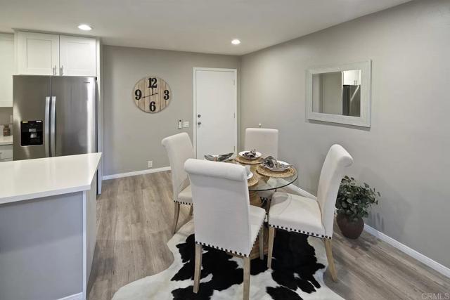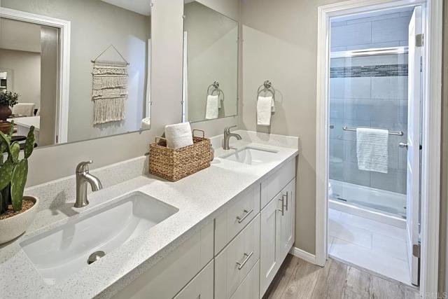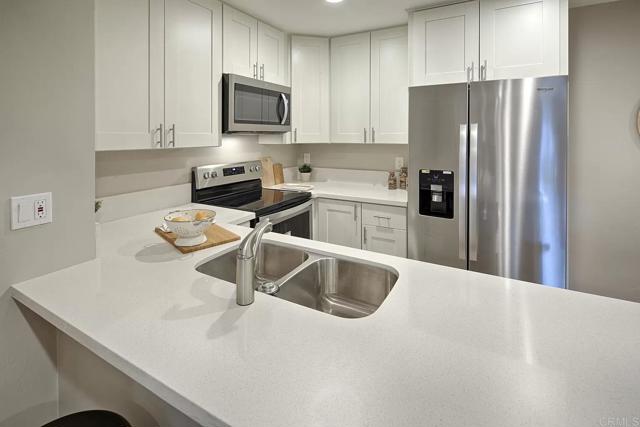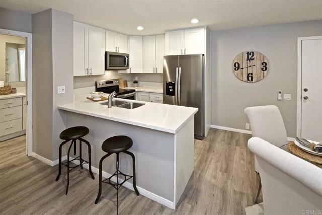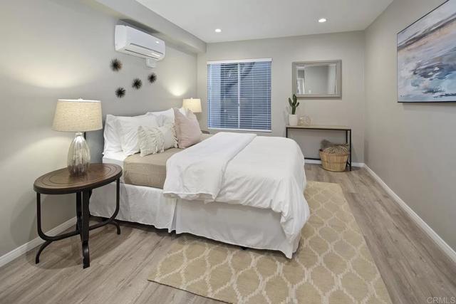 Full reno in 2019, the home features, new A/C, new plumbing, electrical panel & circuits, lighting, & finishes. The stunning kitchen showcases solid wood cabinetry, white quartz countertops, oversized deep sink & new stainless steel appliances. The bathroom is equally refined, with dual vanity sinks, mosaic-tiled shower walls & modern fixtures. Additional upgrades include new closets & doors, wood flooring, recessed lighting & drywall ceilings, giving the home a bright, contemporary feel. This first floor corner unit has exceptional privacy with no shared walls, & a quiet interior location free from street noise. From the private patio, take in serene lagoon & lush garden views—a tranquil setting that’s just steps from the main lobby, gym, package room, library, & pool. A rare highlight, this home includes a dual mini-split A/C & heating system with separate zones for the living & bedroom—a premium comfort upgrade found in very few units at The Plaza. Your prime reserved garage parking space is located on the lower level, offering one of the widest stalls in the complex, large enough to fit a full-size vehicle such as a Ford Raptor. Residents of The Plaza Condominium Association enjoy four pools / hot tubs, a fully equipped gym & sauna, tennis courts, clubhouse & beautifully landscaped courtyards with a tranquil lagoon. Just minutes from the beach, bays, Garnet Ave, and iconic Pacific Beach dining & nightlife, the home has unmatched walkability—making this the ultimate beach-city lifestyle destination.