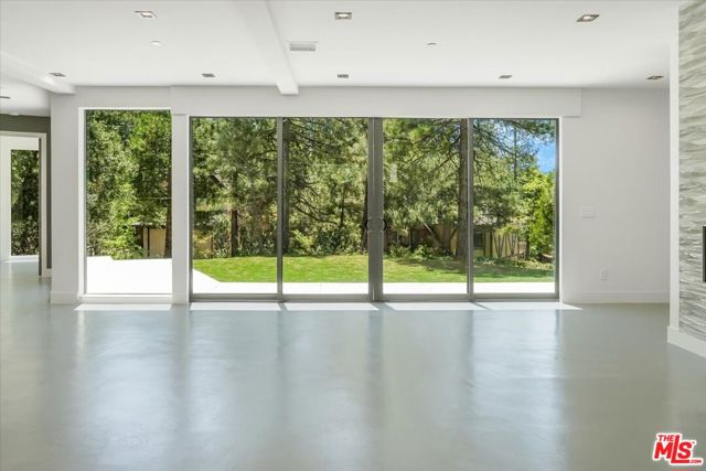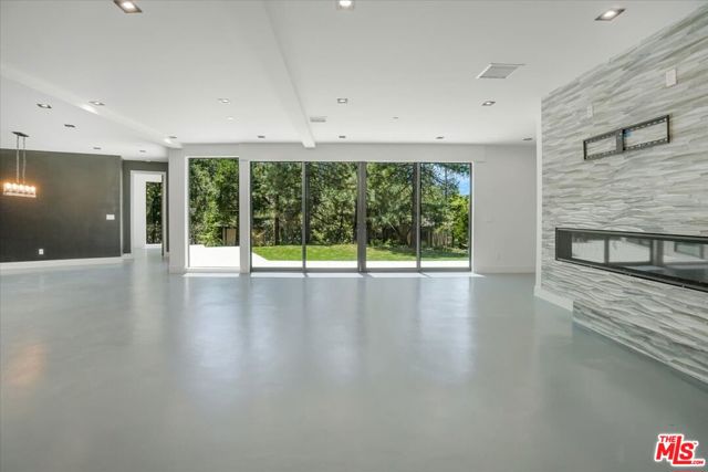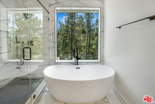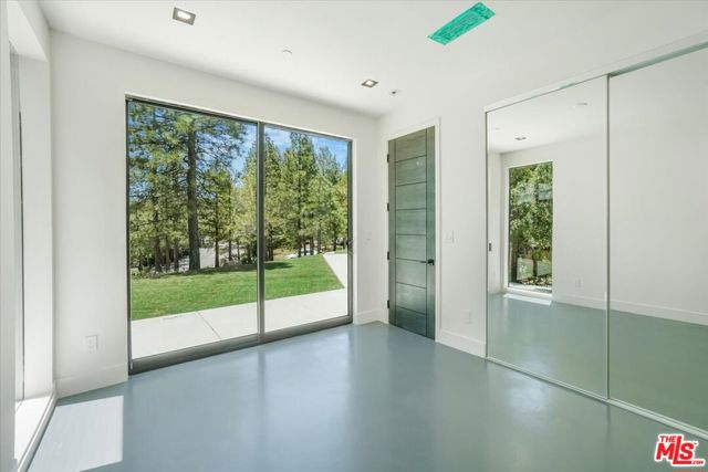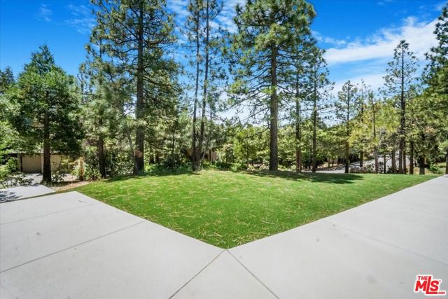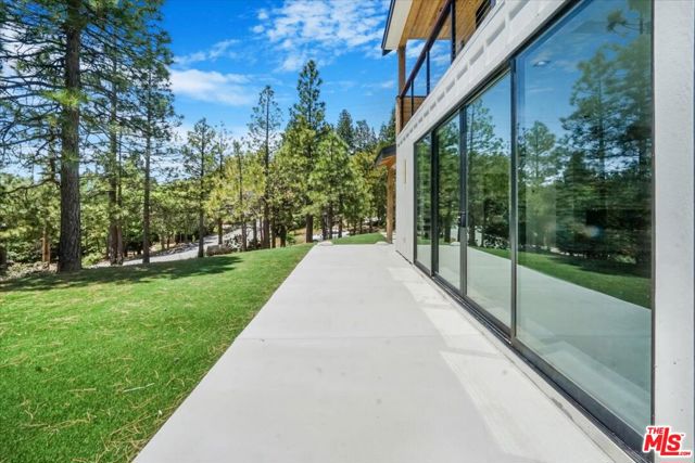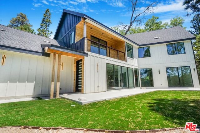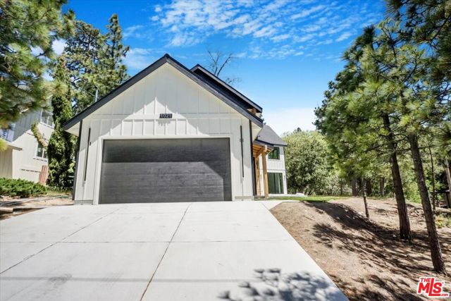 Discover this newly built, stylish two-story contemporary home in the esteemed North Bay area, offering a fresh and inventive approach to mountain living. Positioned on a level corner lot at the end of a cul-de-sac, the home enjoys seclusion under a canopy of immaculate trees. Expansive sliding doors define the entire open-concept design, creating the street-level facade. Features include high beamed ceilings, custom 8-foot doors, a sleek 8-foot wide horizontal fireplace, and a floating staircase, along with a spacious street-level bedroom and full spa bathroom. A natural stone-embedded concrete patio stretches the length of the home's exterior, featuring a Zen garden and a pad for a jacuzzi at the end.Upstairs, four additional bedrooms and two baths offer breathtaking mountain and forest views, complemented by expansive decks. The unique primary bedroom boasts an open floor plan with a custom "loft" style wall separating the bedroom area from a vast walk-in/open closet. The exterior walls, constructed from reclaimed wood, are paired with state-of-the-art products and building materials, including solar panels and automated temperature control. Additional features include an electronic front door and an electric car charger. This energy-efficient smart home stands out as a rare gem in the Mountain Resort Communities of Lake Arrowhead.