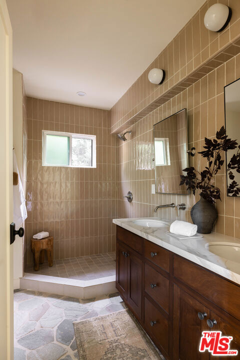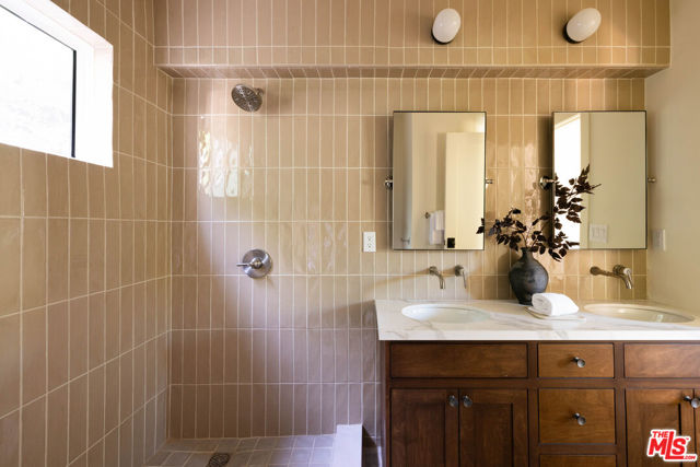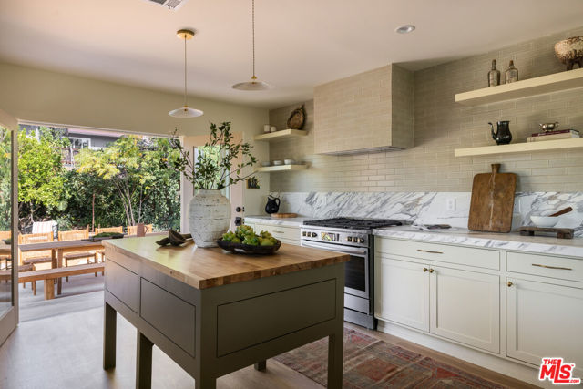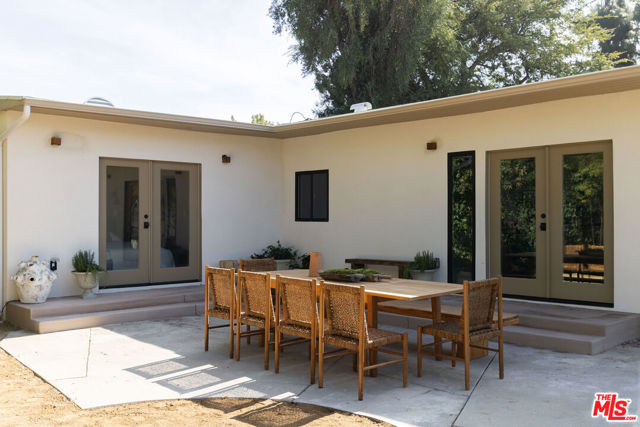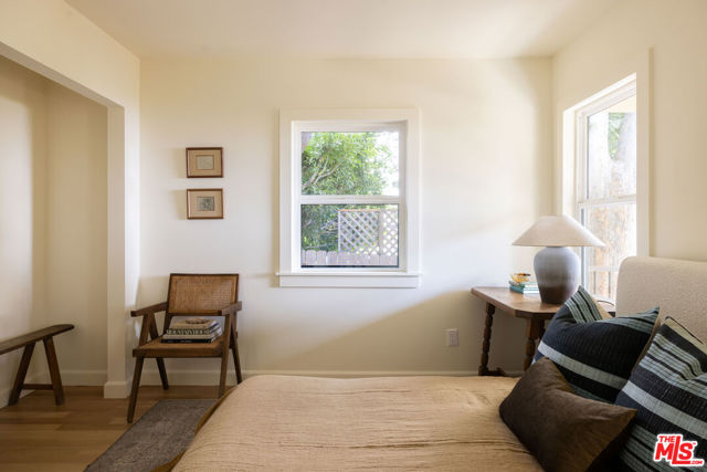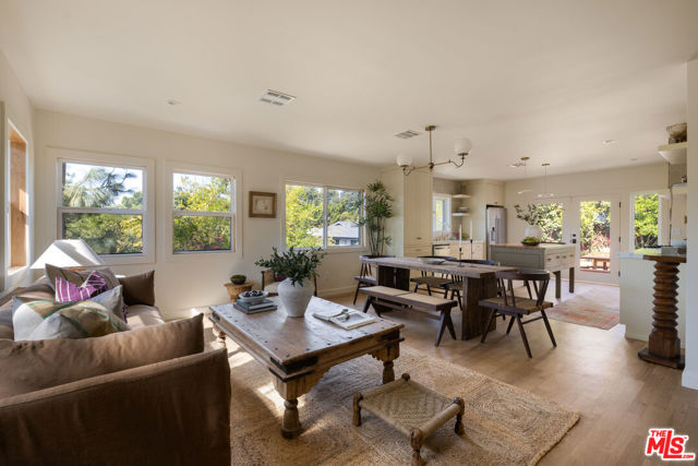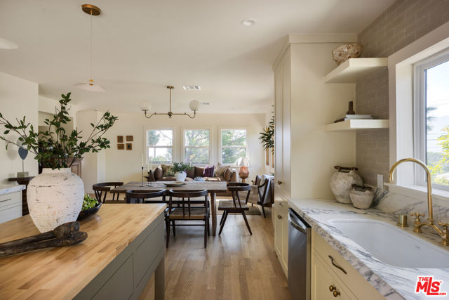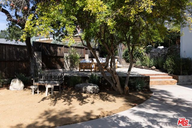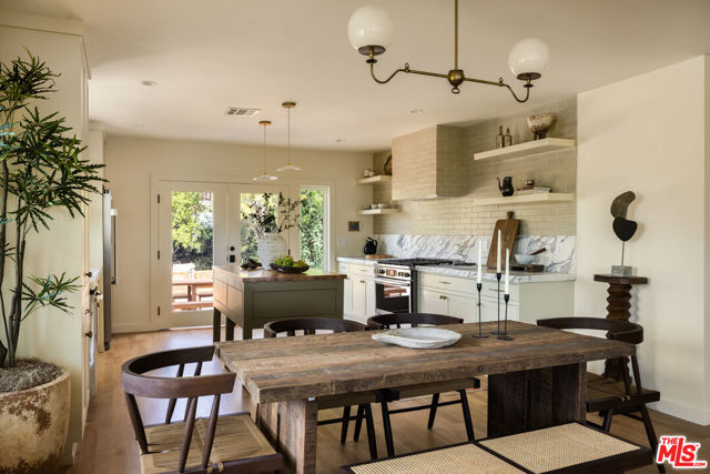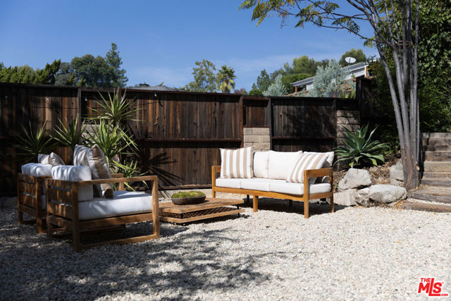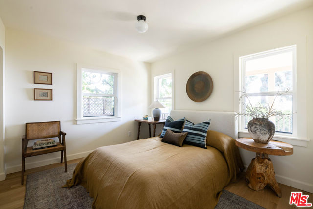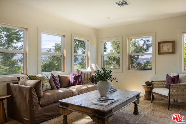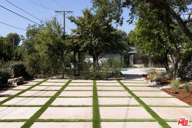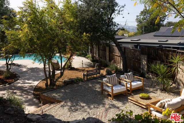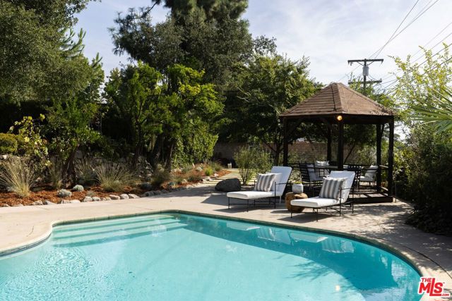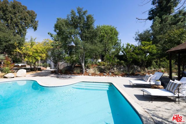 Private Gated Compound with Pool, Bonus Room & Mountain Views. At the end of a peaceful cul-de-sac, this fully re-imagined home sits on a private gated lot with a new large concrete driveway, meandering pathways, mature multi-level gardens and a sparkling pool framed by sweeping mountain vistas. Inside, expansive new windows, white-oak wood floors and warm organic finishes evoke a serene tree-house feel surrounded by greenery. The kitchen features custom built cabinets, a butcher-block island and Calacatta Viola marble countertops. Baths highlight Calacatta quartz, travertine and zellige tile, plus a spa-style wet-room primary bath with flagstone flooring and custom bead-board millwork in the primary bedroom. Extensive structural and mechanical upgrades include a new roof, new windows, new exterior doors (including French doors off the primary suite and kitchen to an upper patio), new water lines throughout, new HVAC, new plumbing and electrical, new stucco/paint, and native drought-tolerant landscaping. A large bonus room on the lower level and generous storage under the house complete the offering.