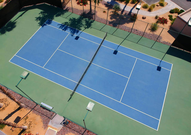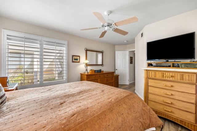 Dramatic lake, fairway and views of the Santa Rosa Mountains from the patio of this luxury condo. The 7th fairway pond and waterfall are visible from the private south facing patio. Private patio features an awning and ceiling fan. Interior is highly upgraded. Kitchen has been reconfigured and extensively upgraded. Features newer cabinetry with a built-in buffet and lazy Susan turnstile corner cabinets. A bonus of slab granite counters and upgraded appliances. Bath upgrades include newer vanities with slab granite counters, walk in custom tile showers, and linen closet storage. Ceramic plank tile flooring throughout. Bedrooms and closets have upgraded raised panel doors. Energy efficient upgrades include Milgard vinyl windows and patio door, and ceiling fans which combine luxury with sustainability. Decorated in warm neutral colors. Furnishings available. Garage features built in storage and is larger than the standard garage. to accommodate storing a larger than average vehicle. The inclusion of a 1-car garage adds practicality to the package. The complex's amenities include 6 community pools and spa areas, to provide ample opportunities for relaxation and recreation. The added perk of UNLIMITED golf on a Ted Robinson designed par 3 course. Featuring tennis and pickleball courts that are well maintained. Now the area headquarters for Helix Disc Golf, enhances the lifestyle appeal. Low HOA dues covering essential services, cable, and internet make for worry-free living, while convenient access to shopping, dining, and transportation adds to the property's allure. Situated across from the Indian Wells Tennis Gardens, home of the Paribas Open, this property is perfect for either full-time residence or a luxury seasonal home. Overall, it truly offers a lifestyle of convenience and luxury, appealing to those seeking the ultimate in comfort and relaxation.