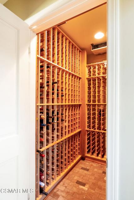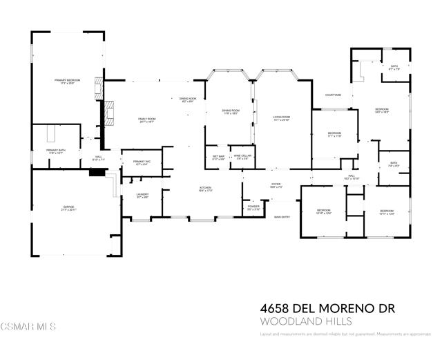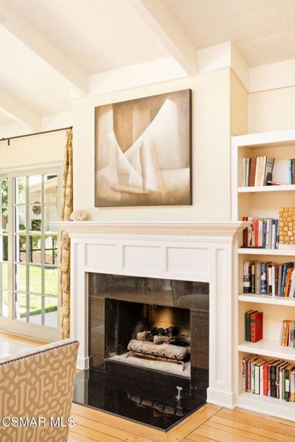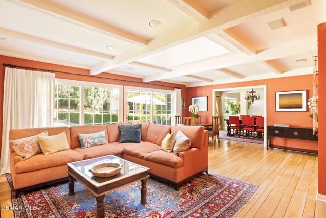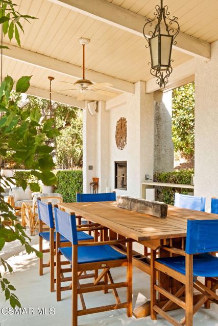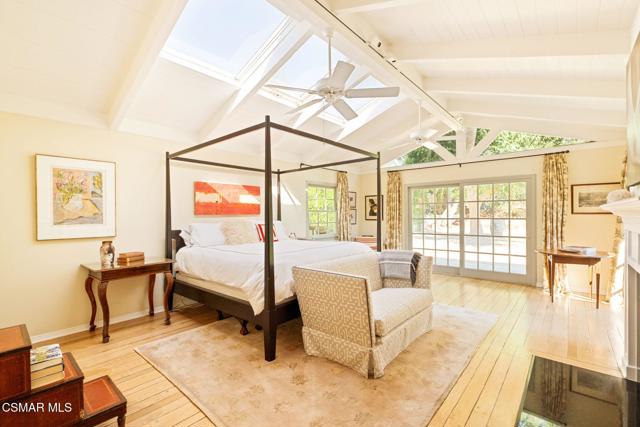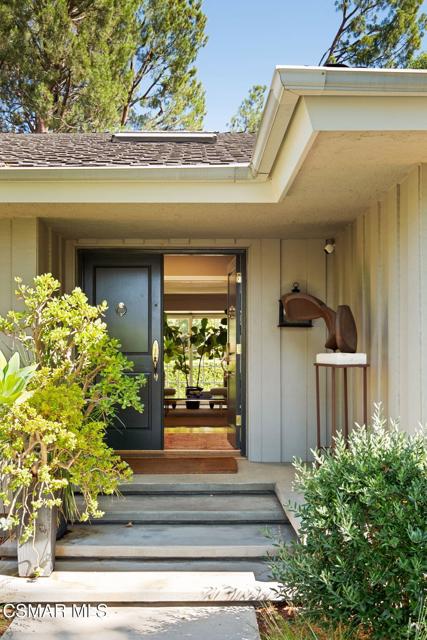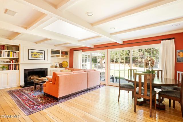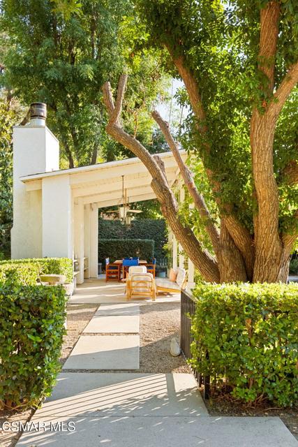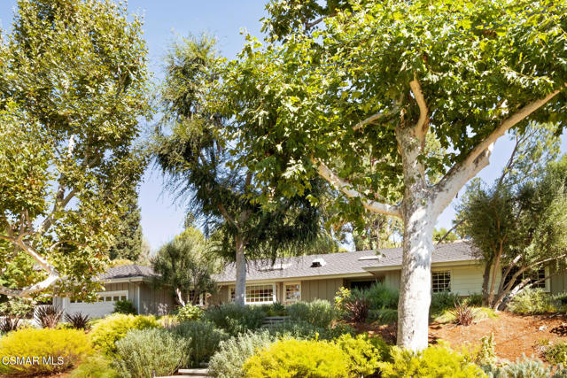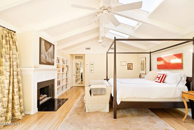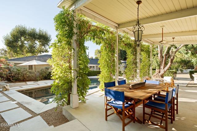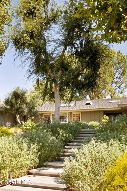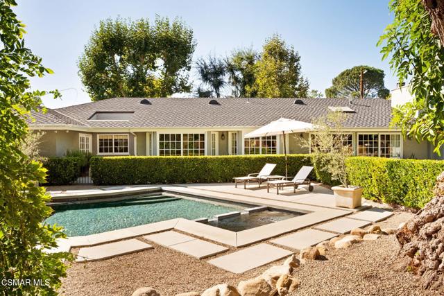 Welcome to this remarkable five-bedroom, four-bathroom California Ranch retreat, ideally located south of the Boulevard in Woodland Hills' coveted Vista De Oro neighborhood. Offering more than 3,200 square feet of timeless living space, the home is surrounded by mature trees and lush landscaping. A classic facade, double-door entry, and gracefully designed garden pathways create an inviting first impression. Inside, the design emphasizes comfort, flow, and enduring style. The primary suite is a one-of-a-kind retreat, blending luxury with warmth. A wall of library-style built-in bookshelves brings character, while an exquisite wood-and-marble fireplace serves as a striking focal point. Classic French doors open to the outdoors, creating a light-filled indoor-outdoor experience. Overhead, oversized skylights flood the space with natural light, making the suite an inspiring sanctuary. The retreat is complete with a walk-in closet featuring custom built-ins and a spa-like bathroom with a marble soaking tub, glass shower, and dual vanities. Three additional bedrooms share a hallway bathroom, while a large en-suite bedroom at the end of the hall enjoys its own private courtyard with views of the pool--ideal for guests or extended family. A convenient powder room is also located off the main hallway. Throughout the home, classic details shine: rustic wood floors, custom built-ins, multiple fireplaces, and abundant natural light. Skylights are thoughtfully placed, enhancing the bright and airy feel while highlighting the timeless finishes. The family room flows seamlessly into the formal living and dining areas, creating connected spaces ideal for entertaining or everyday living. For the wine enthusiast, a custom climate-controlled wine cellar offers floor-to-ceiling storage for a curated collection, while the adjoining wet bar provides an elegant space for serving beverages and cocktails and also added storage. Outdoors, the backyard is designed as an extension of the home. The expansive outdoor pavilion with a wood-burning fireplace overlooks the pool and spa, while a spacious lawn and decomposed granite area provide versatility for gatherings, outdoor dining, lawn games, or play. Mature trees and lush landscaping enhance the setting, with the sparkling pool and spa serving as the centerpiece for relaxation. This residence embodies classic California Ranch living with timeless quality--from its welcoming curb appeal to its light-filled interiors and resort-style grounds. It is a truly special property you won't want to miss.