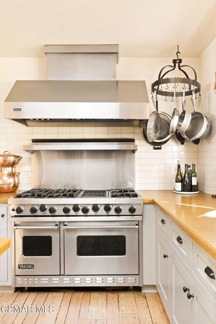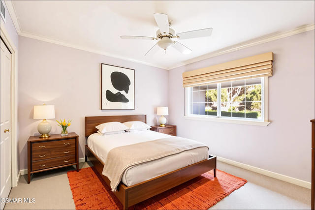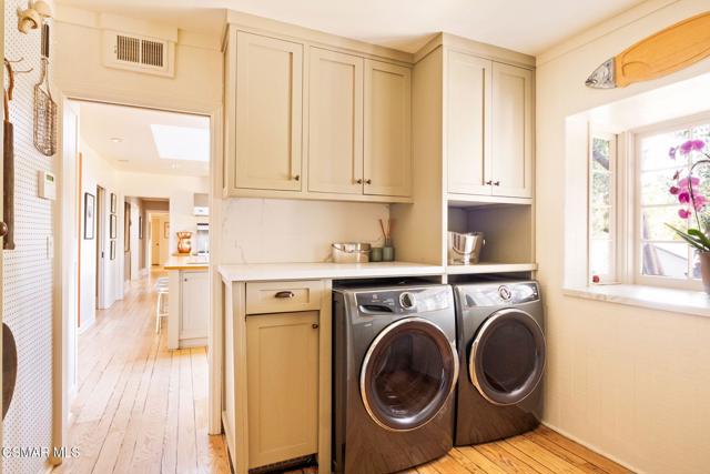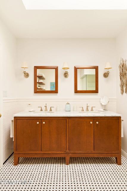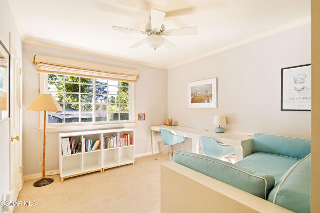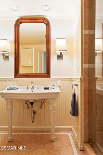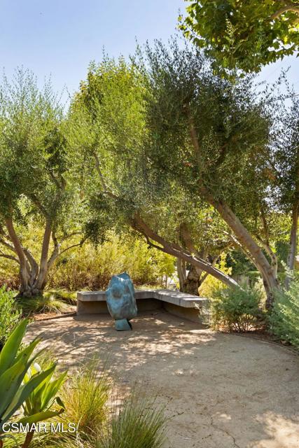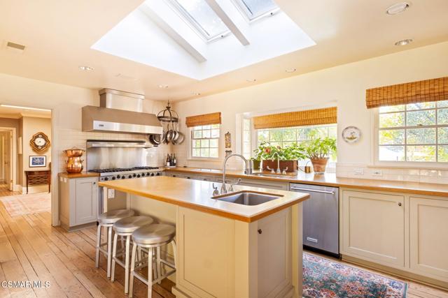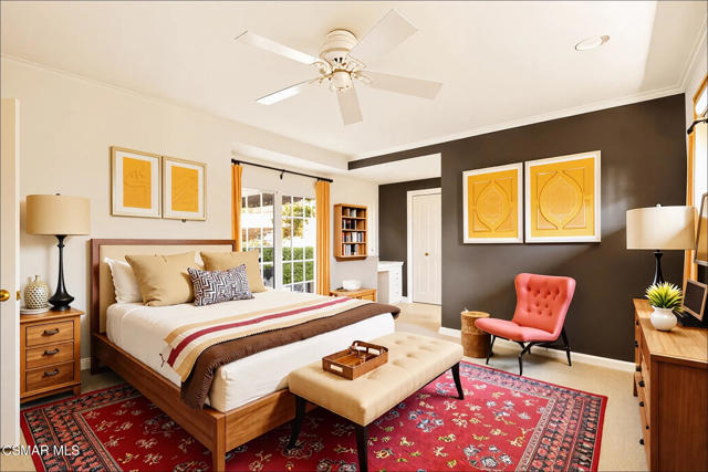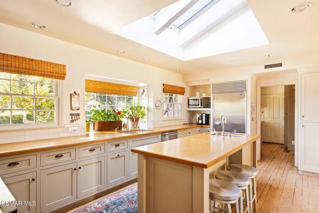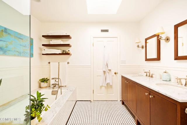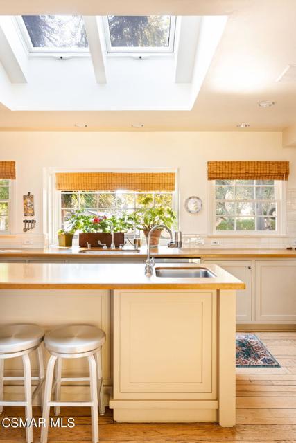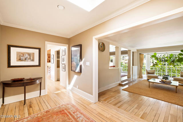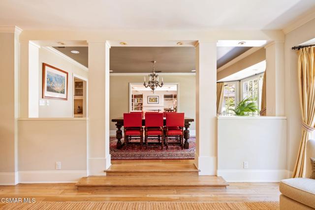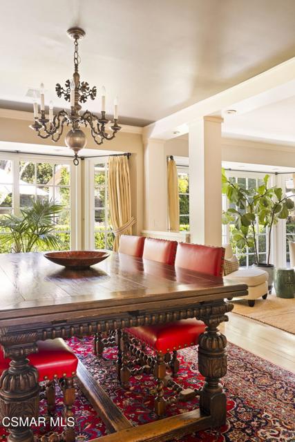 Welcome to this remarkable five-bedroom, four-bathroom California Ranch retreat, ideally located south of the Boulevard in Woodland Hills' coveted Vista De Oro neighborhood. Offering more than 3,200 square feet of timeless living space, the home is surrounded by mature trees and lush landscaping. A classic facade, double-door entry, and gracefully designed garden pathways create an inviting first impression. Inside, the design emphasizes comfort, flow, and enduring style. The primary suite is a one-of-a-kind retreat, blending luxury with warmth. A wall of library-style built-in bookshelves brings character, while an exquisite wood-and-marble fireplace serves as a striking focal point. Classic French doors open to the outdoors, creating a light-filled indoor-outdoor experience. Overhead, oversized skylights flood the space with natural light, making the suite an inspiring sanctuary. The retreat is complete with a walk-in closet featuring custom built-ins and a spa-like bathroom with a marble soaking tub, glass shower, and dual vanities. Three additional bedrooms share a hallway bathroom, while a large en-suite bedroom at the end of the hall enjoys its own private courtyard with views of the pool--ideal for guests or extended family. A convenient powder room is also located off the main hallway. Throughout the home, classic details shine: rustic wood floors, custom built-ins, multiple fireplaces, and abundant natural light. Skylights are thoughtfully placed, enhancing the bright and airy feel while highlighting the timeless finishes. The family room flows seamlessly into the formal living and dining areas, creating connected spaces ideal for entertaining or everyday living. For the wine enthusiast, a custom climate-controlled wine cellar offers floor-to-ceiling storage for a curated collection, while the adjoining wet bar provides an elegant space for serving beverages and cocktails and also added storage. Outdoors, the backyard is designed as an extension of the home. The expansive outdoor pavilion with a wood-burning fireplace overlooks the pool and spa, while a spacious lawn and decomposed granite area provide versatility for gatherings, outdoor dining, lawn games, or play. Mature trees and lush landscaping enhance the setting, with the sparkling pool and spa serving as the centerpiece for relaxation. This residence embodies classic California Ranch living with timeless quality--from its welcoming curb appeal to its light-filled interiors and resort-style grounds. It is a truly special property you won't want to miss.