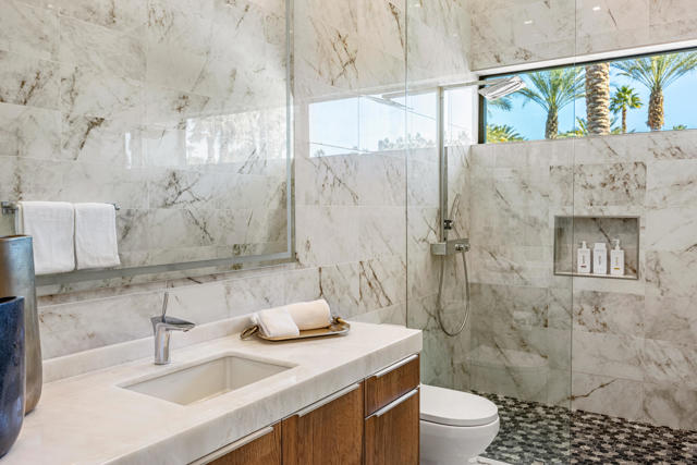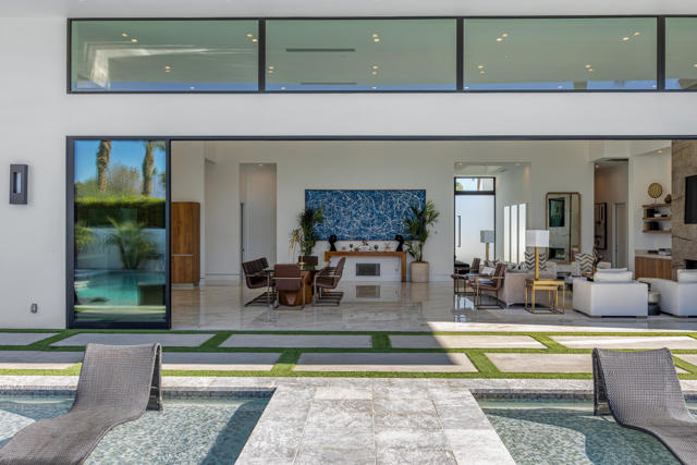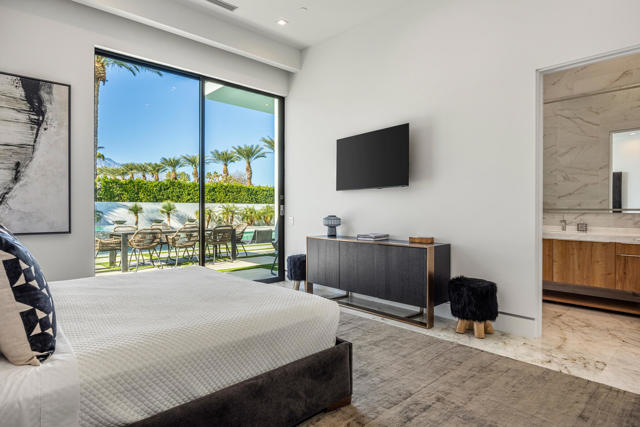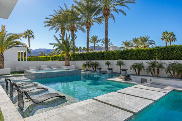 Welcome to Bravo 7, located in the heart of Tamarisk, in Rancho Mirage. This private enclave of seven curated luxury homes by architect James M. McEachern and Developer Bravo Development is now hitting the market for the first time. This luxury residence at Bravo 1 boasts an oversized pool with two tiled Baja shelves and a step-down bar area with a fire pit. Upon entering through the pivoting glass door, you will be greeted by an impressive interior featuring soaring ceilings, fold-away glass doors, imported polished marble from Spain, and sleek custom cabinetry imported from Germany. The bathrooms and kitchen are adorned with high-quality Hansgrohe fixtures. The spacious great room, complete with a linear fireplace, is perfect for hosting grand-scale gatherings and seamlessly connects to the kitchen, backyard, and pool area. The estate offers 5 ensuite bedrooms and 5.5 baths, equipped with Fleetwood doors and windows, Miele appliances, smart-home lighting and communication systems, and luxurious Italian cabinetry in the primary suite's walk-in closets. Other notable features include illuminated bath mirrors, solar power, and a 3-car garage with epoxy flooring. This prestigious residential collection is conveniently located near The Ritz-Carlton Resort & Spa, Sunnylands, Palm Springs International Airport, luxury shopping, and fine dining. It presents an unparalleled opportunity to live a grand lifestyle that many can only dream