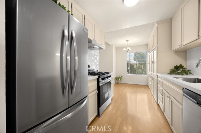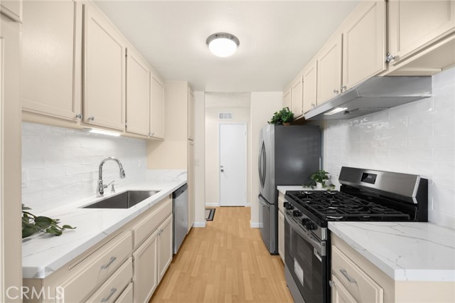 Freshly updated and priced to sell! This La Veta Monterey condo offers approximately $30,000 in upgrades (completed 10/2025) and is truly move-in ready. Bright and airy with vaulted beam ceilings, fresh paint, and new flooring, this home blends style and function with modern updates throughout. The kitchen and dining area shine with quartz countertops, glossy subway tile backsplash, and brand-new stainless steel refrigerator, five-burner gas range, dishwasher, and directly vented hood. A deep farm-style stainless sink, freshly painted cabinetry with chrome hardware, new lighting, blinds, and a pantry closet complete the space. The dining area also includes a full wall of custom cabinets with a pull-out workspace, ideal for a home office or study nook. Bathrooms feature new vanities, mirrors, and lighting, quartz countertops, Travertine-style porcelain tile floors, new toilets, and reglazed tubs/showers for a clean, modern finish. Both bedrooms include new carpet, ceiling fans, lighting, and blinds; the primary suite offers mirrored closets, while the secondary bedroom has a walk-in. Additional upgrades include new 4” baseboards, updated electrical outlets and switches, central air conditioning, recent re-piping, and a spacious balcony with treetop views. Assigned one covered and one open parking space. Community amenities include adult and family pools, a clubhouse, laundry facilities, and a playground. Ideally located near the 5, 22, and 55 freeways, St. Joseph’s and CHOC Hospitals, Old Towne Orange, shopping, and dining. First time on the market since 1985—don’t miss this beautifully updated home in one of Orange’s most desirable communities!