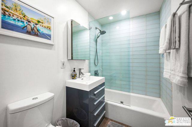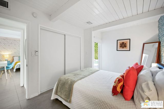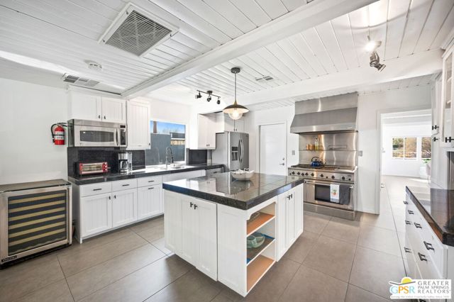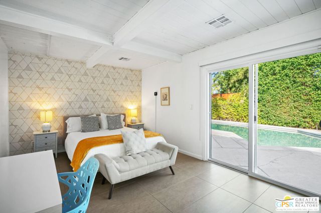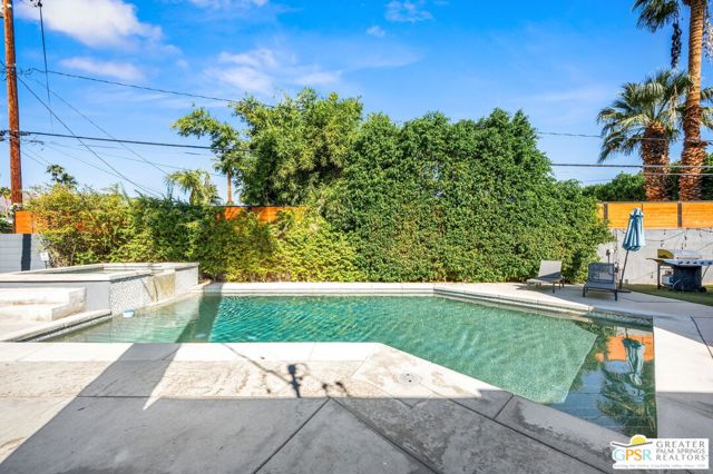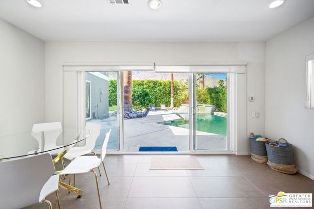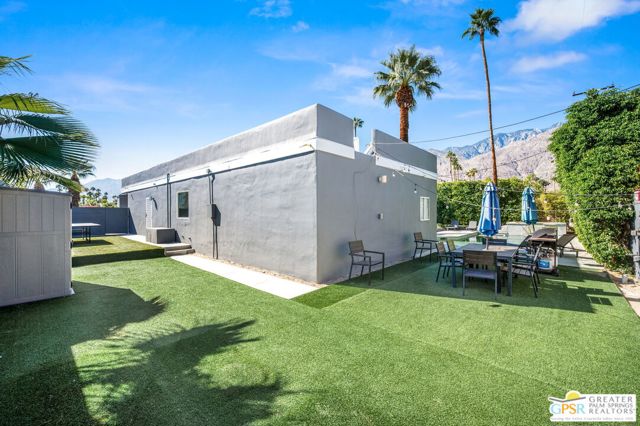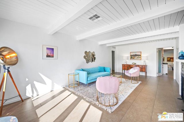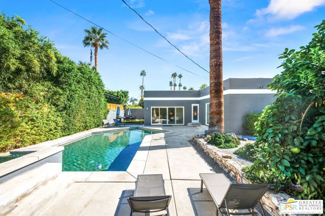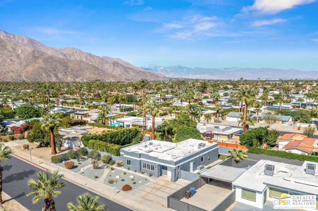 This contemporary home in the desirable Tahquitz River Estates neighborhood of South Palm Springs features three bedrooms, two bathrooms, a saltwater pool and spa in a private backyard, and sweeping mountain views. The entry opens to a spacious living room with a gas fireplace, flowing into a kitchen equipped with a commercial-style range and generous storage and counter space. A den and dining area sit just beyond, completing a layout that's ideal for both everyday living and entertaining. A converted one-car garage houses the washer and dryer and provides flexible space for an office, gym, or storage. The roof has recently been upgraded with 1.5 inches of foam, and the exterior has been freshly painted. Drought-tolerant landscaping and synthetic turf complete the clean, low-maintenance outdoor setting. The home offers convenient access to Downtown Palm Springs, shopping, dining, and essential services.