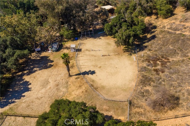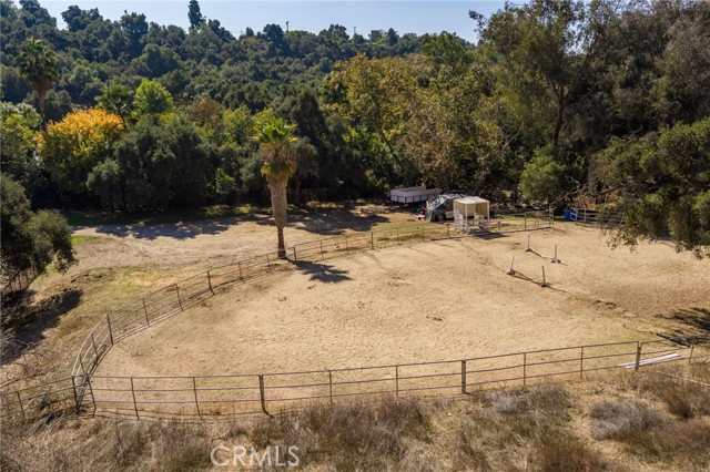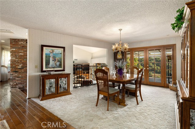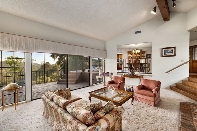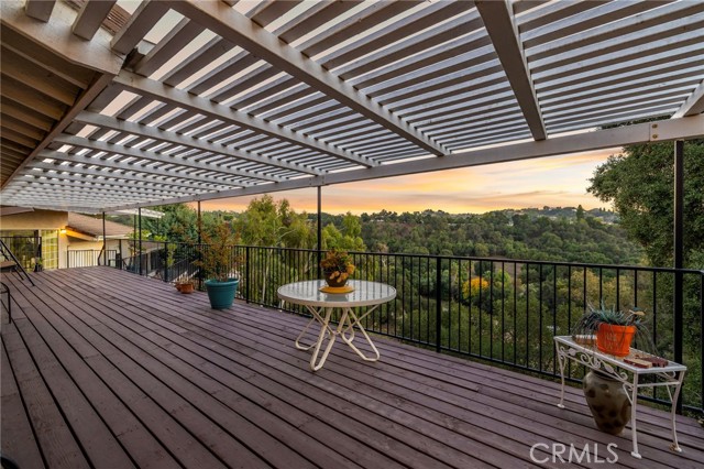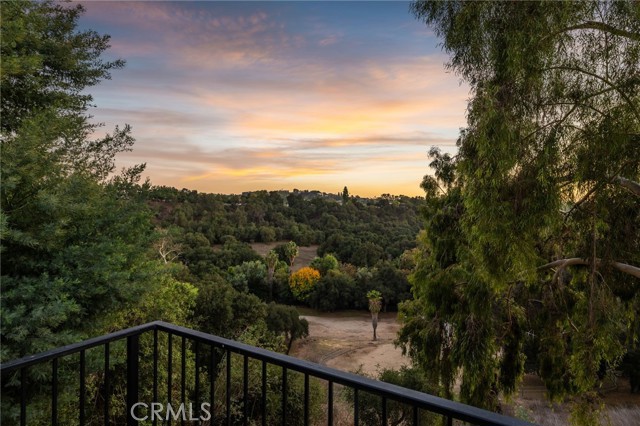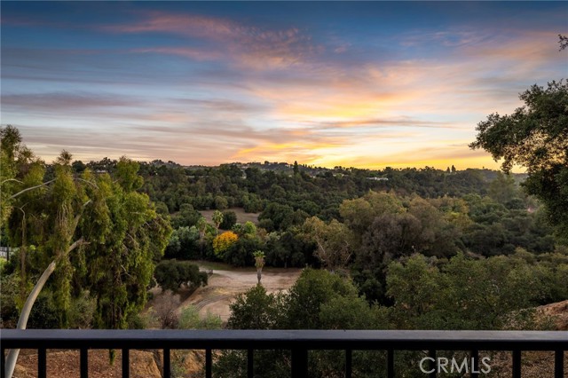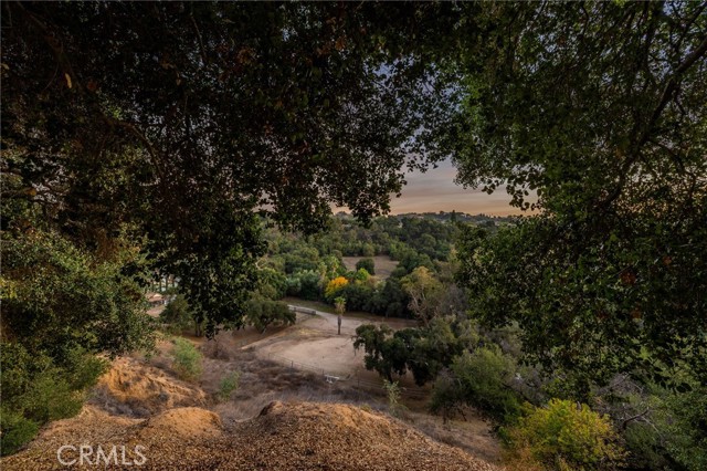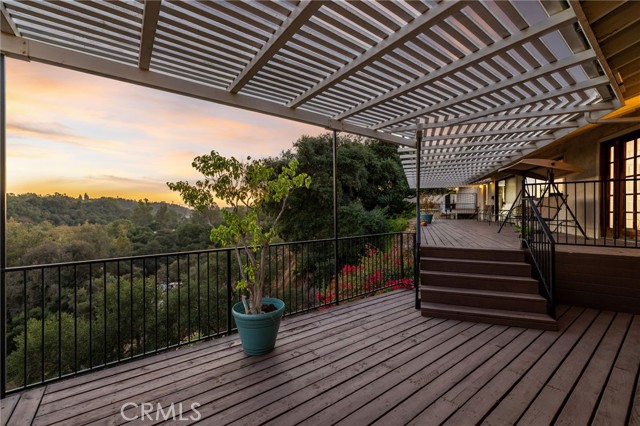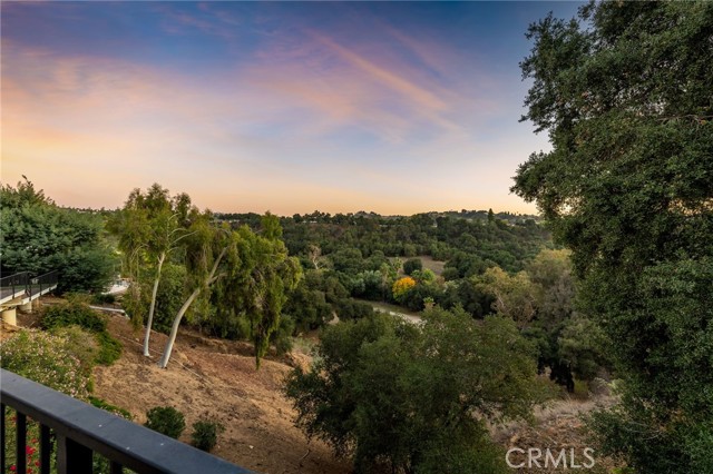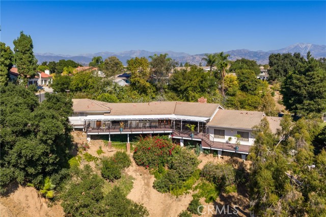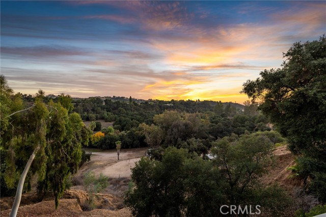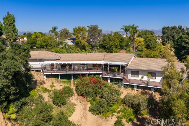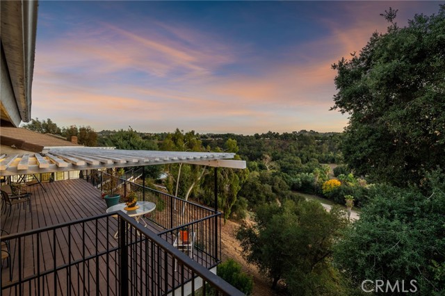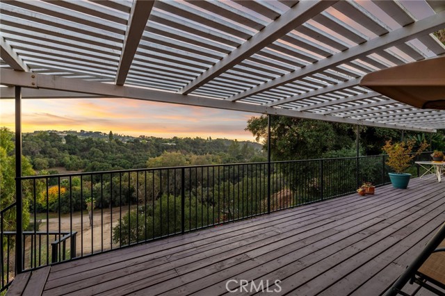 Custom-built home on a prime street with panoramic views and an oversized, horse-zoned lot. Exceptional curb appeal includes a sprawling brick façade, manicured lawn and landscaping, mature trees, and concrete steps to a covered brick porch with a wood-and-glass front door. Inside, hardwood floors lead to a formal dining room and a view-filled living room; the dining room opens through French doors to the back deck and overlooks the living room via an open wrought-iron railing. The living room showcases a full wall of glass framing sweeping vistas, a floor-to-ceiling brick fireplace, and a vaulted ceiling with exposed-beam detail. The spacious kitchen offers solid wood cabinetry, tiled counters and backsplash, stainless steel appliances, a view-facing garden window, and a peninsula with counter seating, while a breakfast nook sits at a bay window overlooking the front yard. A separate family room features a 12-foot sliding door to the deck, more views, a built-in bar, and a vaulted ceiling with an exposed beam. Two convenient half baths serve guests. Down the hall, the primary bedroom includes a ceiling fan, sliding door to the deck and views, a walk-in closet, and an ensuite bath with dual sinks, a tub with tile surround, and a separate glass-enclosed shower. Three additional bedrooms (one with built-ins, currently used as an office) share a full hall bath. An indoor laundry/mudroom with ample cabinetry opens to the backyard and connects to the attached three-car garage. Outside, a deck spans the width of the home to take in unobstructed views of the horse ring below, the canyon, hills, and beyond, while the side yards provide additional space with a rolling lawn and oak trees.