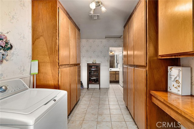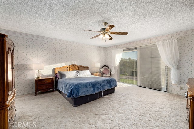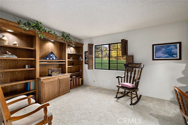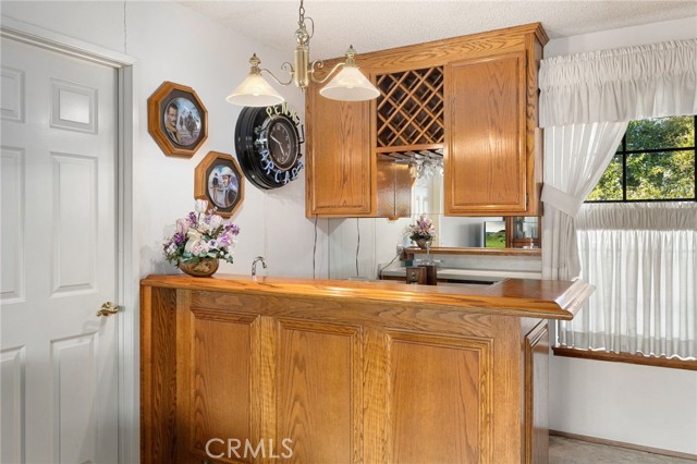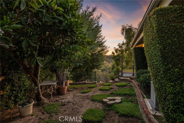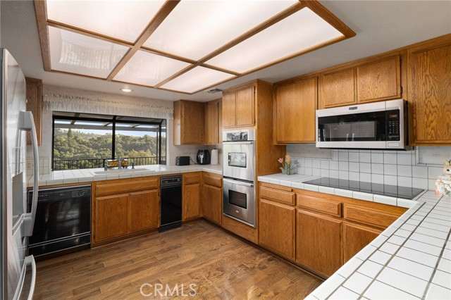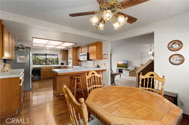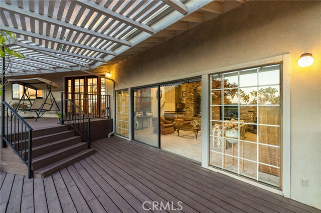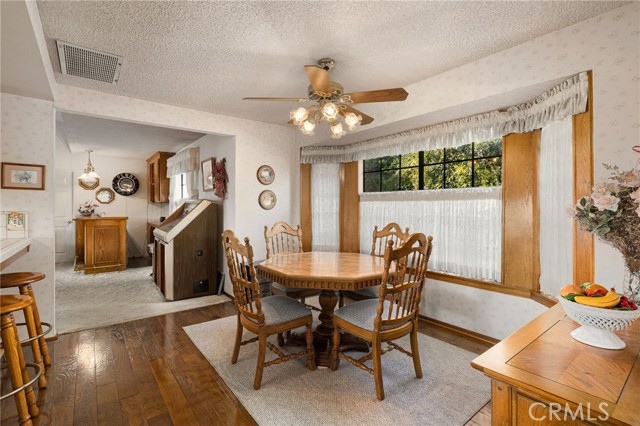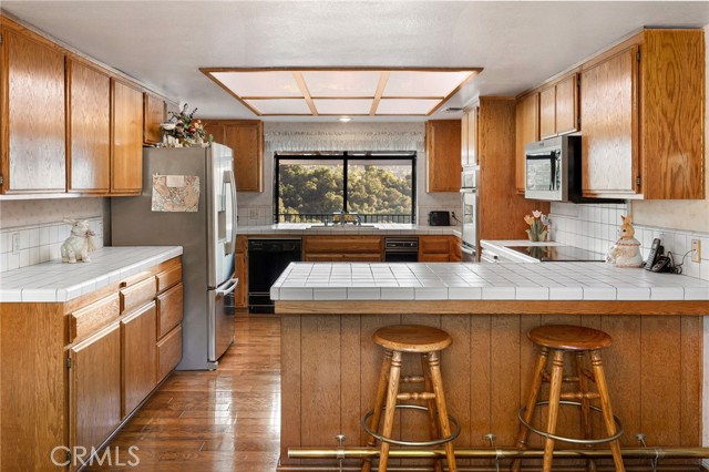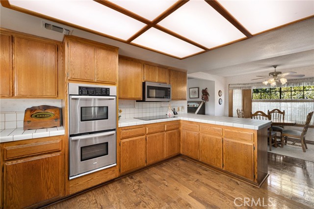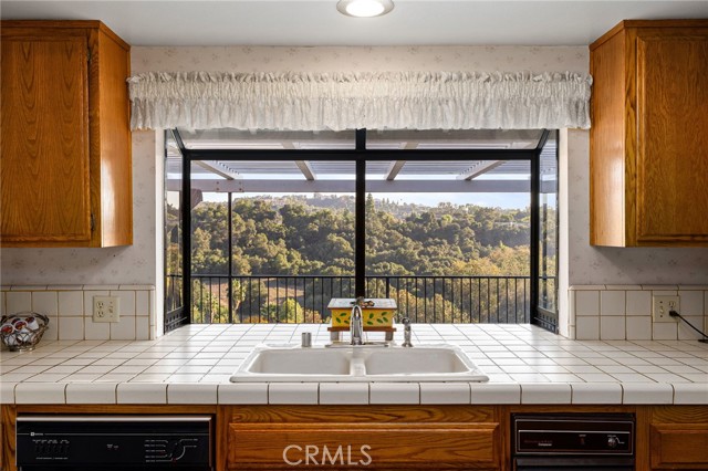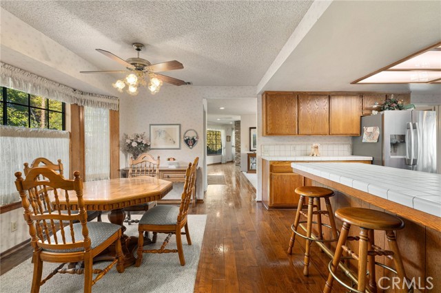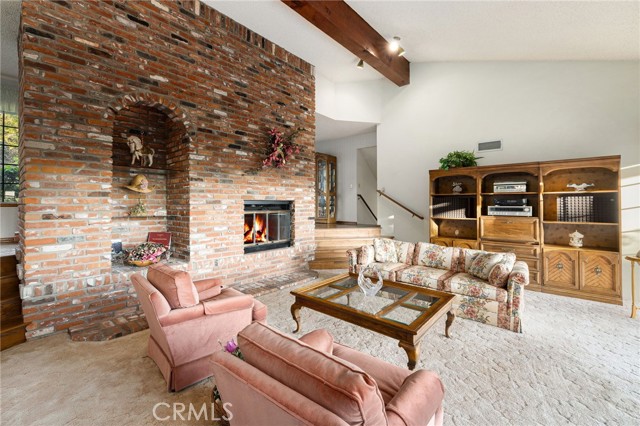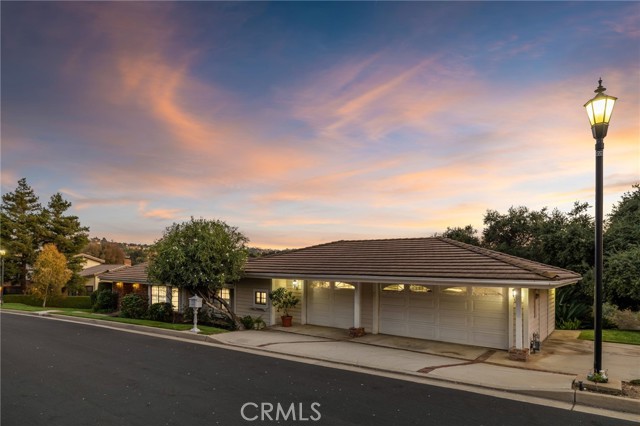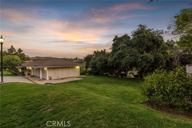 Custom-built home on a prime street with panoramic views and an oversized, horse-zoned lot. Exceptional curb appeal includes a sprawling brick façade, manicured lawn and landscaping, mature trees, and concrete steps to a covered brick porch with a wood-and-glass front door. Inside, hardwood floors lead to a formal dining room and a view-filled living room; the dining room opens through French doors to the back deck and overlooks the living room via an open wrought-iron railing. The living room showcases a full wall of glass framing sweeping vistas, a floor-to-ceiling brick fireplace, and a vaulted ceiling with exposed-beam detail. The spacious kitchen offers solid wood cabinetry, tiled counters and backsplash, stainless steel appliances, a view-facing garden window, and a peninsula with counter seating, while a breakfast nook sits at a bay window overlooking the front yard. A separate family room features a 12-foot sliding door to the deck, more views, a built-in bar, and a vaulted ceiling with an exposed beam. Two convenient half baths serve guests. Down the hall, the primary bedroom includes a ceiling fan, sliding door to the deck and views, a walk-in closet, and an ensuite bath with dual sinks, a tub with tile surround, and a separate glass-enclosed shower. Three additional bedrooms (one with built-ins, currently used as an office) share a full hall bath. An indoor laundry/mudroom with ample cabinetry opens to the backyard and connects to the attached three-car garage. Outside, a deck spans the width of the home to take in unobstructed views of the horse ring below, the canyon, hills, and beyond, while the side yards provide additional space with a rolling lawn and oak trees.