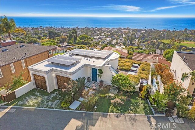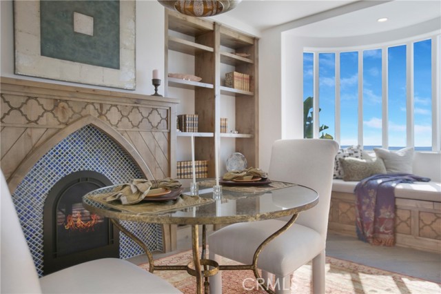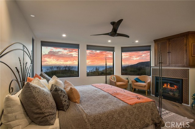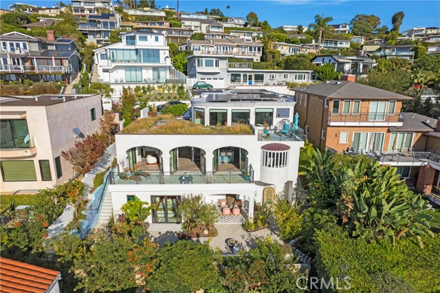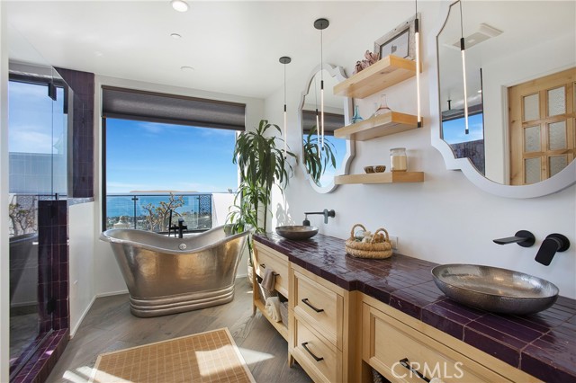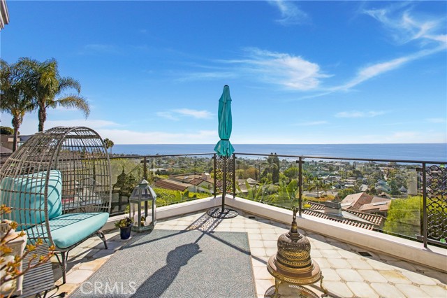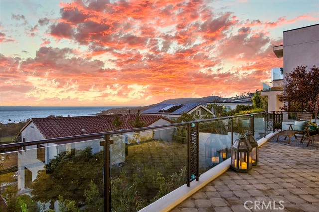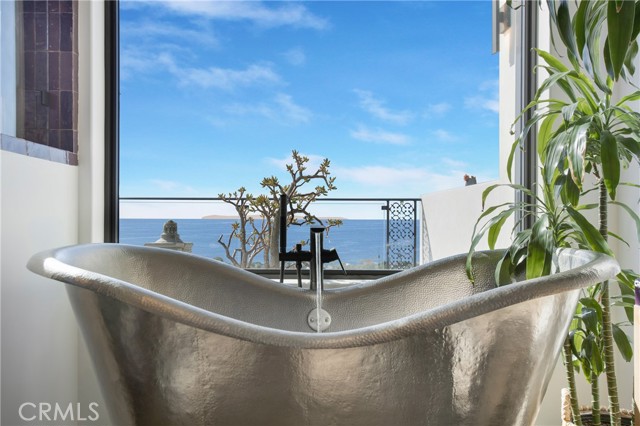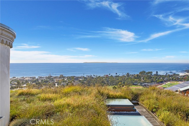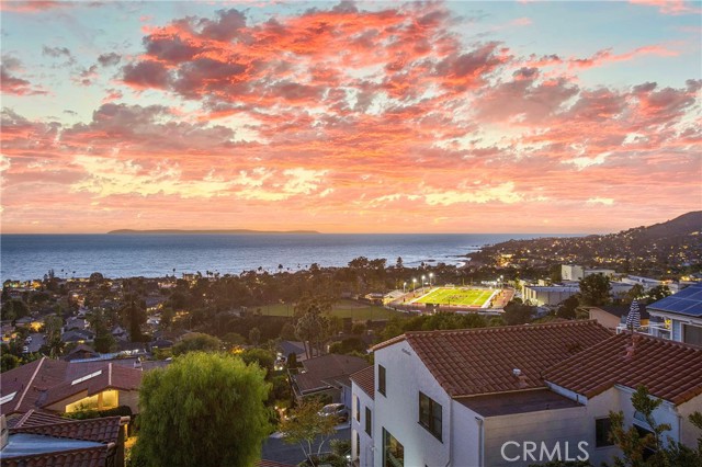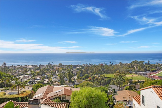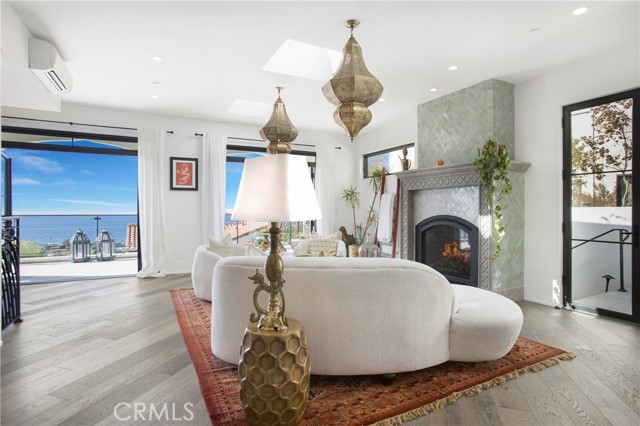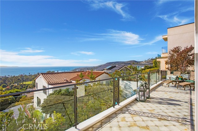 Incredible opportunity for this stunning ‘newer’ construction residence, perfectly positioned to capture panoramic ocean views & offering a wonderful blend of contemporary design with Moroccan-inspired elegance. Designed to maximize indoor/outdoor living, the residence offers multiple outdoor spaces perfect for year-round enjoyment. Enter at street level & be drawn to breathtaking views of the ocean, Catalina Island and Main Beach Laguna through oversized picture windows. The ‘retreat style’ Primary suite crowns the top floor and features a fireplace, spa-like ensuite with walk-in shower, freestanding tub & balcony to enjoy panoramic views. The main level, accessed by a graceful curved staircase adorned with custom ironwork & hand-blown glass by a local artisan, is designed for entertaining. Hardwood oak flooring, smooth stucco walls, and Moroccan-inspired light fixtures create a space with skylights and a fireplace clad in handmade Zellige tile. The bright living area opens through French doors to a spacious ocean-facing balcony. The adjacent chef’s kitchen impresses as the centerpiece of the main living space with leathered soapstone countertops, copper accents including hammered range hood & farm sink, a 48” ILVE range, walk-in pantry, prep sink, and generous counter space make this kitchen both functional and beautiful. A unique library/den space off the main living includes a bespoke fireplace with mosaic tiles and carved wood surround, custom millwork, and an ocean-facing bay window seat offering a perfect spot to relax while enjoying the view. This space could also serve as a home office or bedroom, with ensuite access to a full bathroom. A main-level bedroom affords the option as a primary suite with walk-in closet and ‘Jack & Jill’ bathroom featuring a soapstone vanity, dual copper sinks, and custom tiled shower. On the lower level, a 3rd bedroom with ensuite offers a private oasis, with outdoor access to the secluded covered patio/sundeck with Arto tile flooring, Zellige tile fountain, gas fire-pit, custom mosaic ‘art’ wall, fruit trees, herbs, seasonal Morel mushrooms & vibrant, water-wise landscaping. No detail has been overlooked in this exceptional home, incorporating eco-conscious features such as owned solar power, two EV charging stations, extra-dense insulation, a green roof and ductless mini-split systems for energy-efficient climate control. This residence offers an unparalleled opportunity to experience coastal living at its finest.