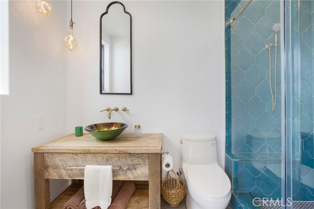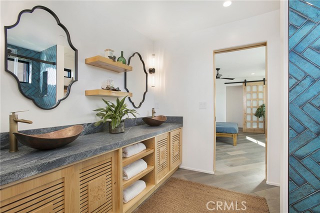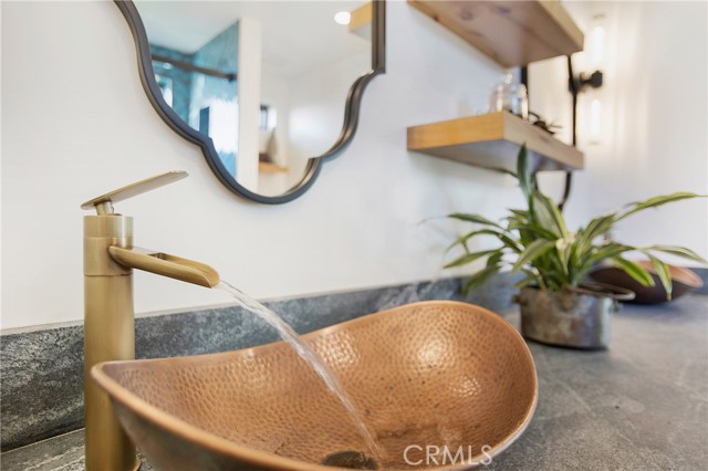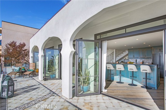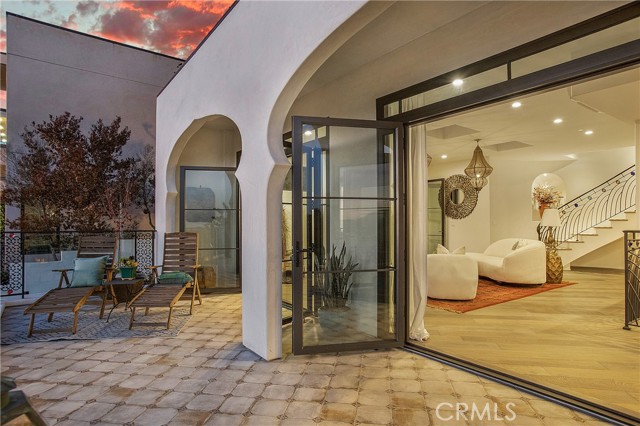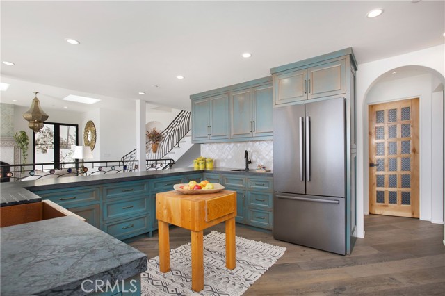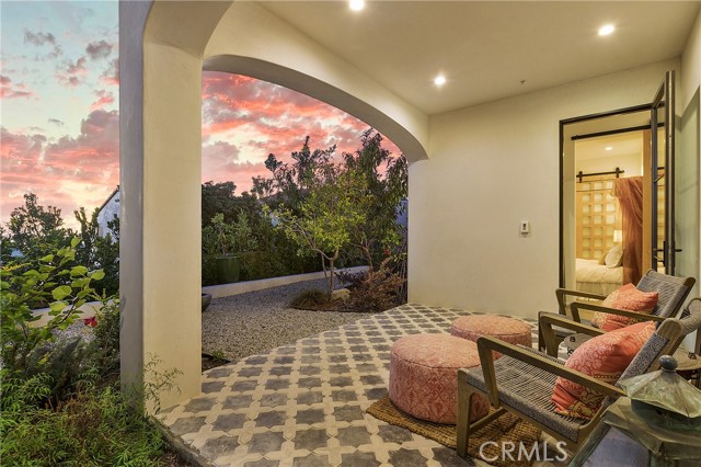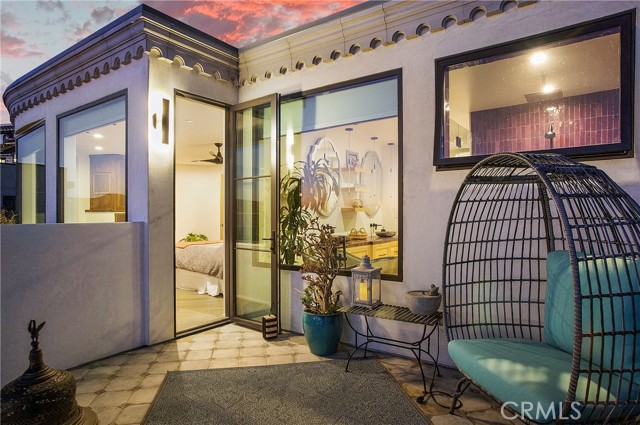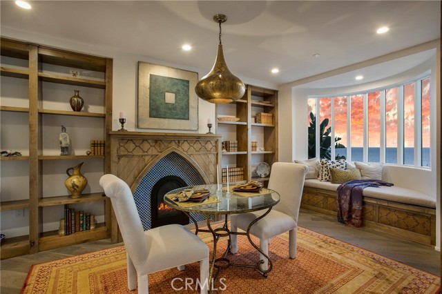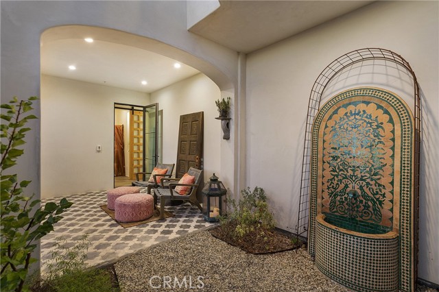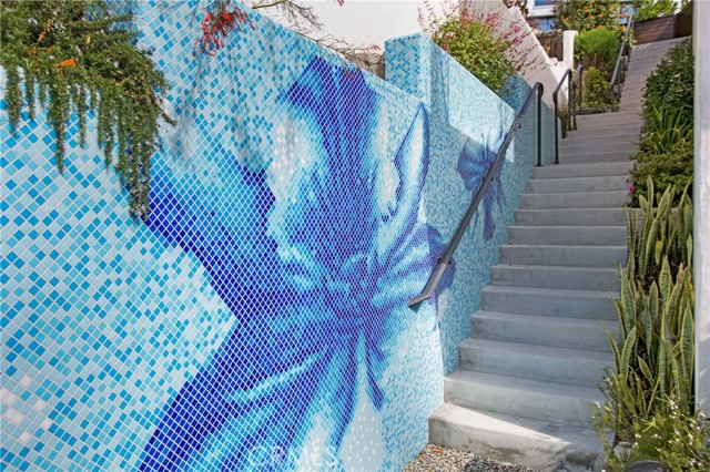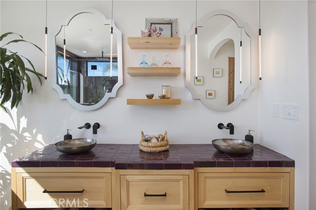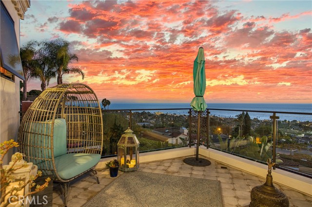 Incredible opportunity for this stunning ‘newer’ construction residence, perfectly positioned to capture panoramic ocean views & offering a wonderful blend of contemporary design with Moroccan-inspired elegance. Designed to maximize indoor/outdoor living, the residence offers multiple outdoor spaces perfect for year-round enjoyment. Enter at street level & be drawn to breathtaking views of the ocean, Catalina Island and Main Beach Laguna through oversized picture windows. The ‘retreat style’ Primary suite crowns the top floor and features a fireplace, spa-like ensuite with walk-in shower, freestanding tub & balcony to enjoy panoramic views. The main level, accessed by a graceful curved staircase adorned with custom ironwork & hand-blown glass by a local artisan, is designed for entertaining. Hardwood oak flooring, smooth stucco walls, and Moroccan-inspired light fixtures create a space with skylights and a fireplace clad in handmade Zellige tile. The bright living area opens through French doors to a spacious ocean-facing balcony. The adjacent chef’s kitchen impresses as the centerpiece of the main living space with leathered soapstone countertops, copper accents including hammered range hood & farm sink, a 48” ILVE range, walk-in pantry, prep sink, and generous counter space make this kitchen both functional and beautiful. A unique library/den space off the main living includes a bespoke fireplace with mosaic tiles and carved wood surround, custom millwork, and an ocean-facing bay window seat offering a perfect spot to relax while enjoying the view. This space could also serve as a home office or bedroom, with ensuite access to a full bathroom. A main-level bedroom affords the option as a primary suite with walk-in closet and ‘Jack & Jill’ bathroom featuring a soapstone vanity, dual copper sinks, and custom tiled shower. On the lower level, a 3rd bedroom with ensuite offers a private oasis, with outdoor access to the secluded covered patio/sundeck with Arto tile flooring, Zellige tile fountain, gas fire-pit, custom mosaic ‘art’ wall, fruit trees, herbs, seasonal Morel mushrooms & vibrant, water-wise landscaping. No detail has been overlooked in this exceptional home, incorporating eco-conscious features such as owned solar power, two EV charging stations, extra-dense insulation, a green roof and ductless mini-split systems for energy-efficient climate control. This residence offers an unparalleled opportunity to experience coastal living at its finest.