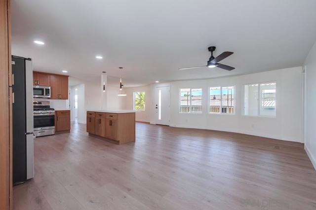 Exquisitely remodeled 3-bedroom home with a versatile California room, showcasing a stunning open-concept design. The centrally positioned kitchen, a true centerpiece, seamlessly connects the living and dining areas, featuring elegant pendant lighting, subway tile backsplash, and new stainless steel appliances. Luxury vinyl flooring flows throughout, complemented by all-new doors, hardware, electrical outlets, switches, ceiling fans, and energy-efficient Green World vinyl windows. The state-of-the-art AC Pro system ensures quiet, powerful cooling. Both bathrooms are beautifully updated with modern finishes. The low-maintenance yard boasts palm trees. Major savings! This home is not on the tax rolls and rent is low at $686 per month.