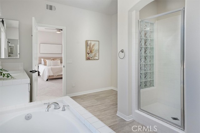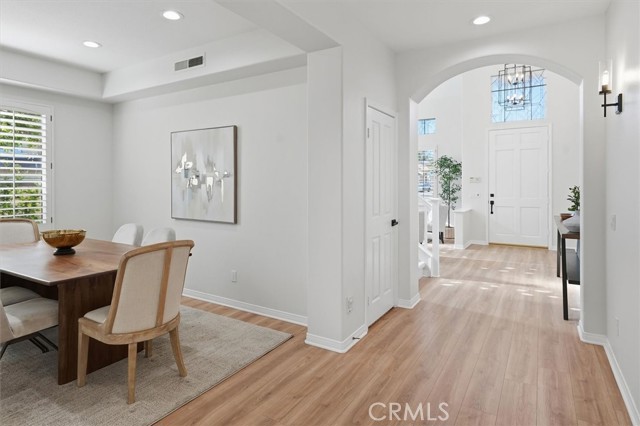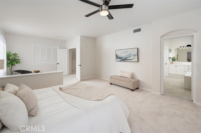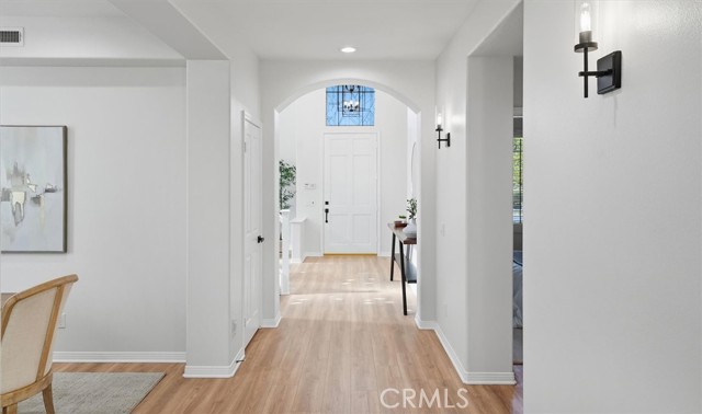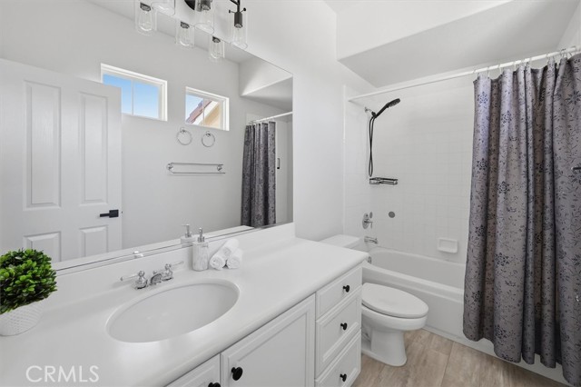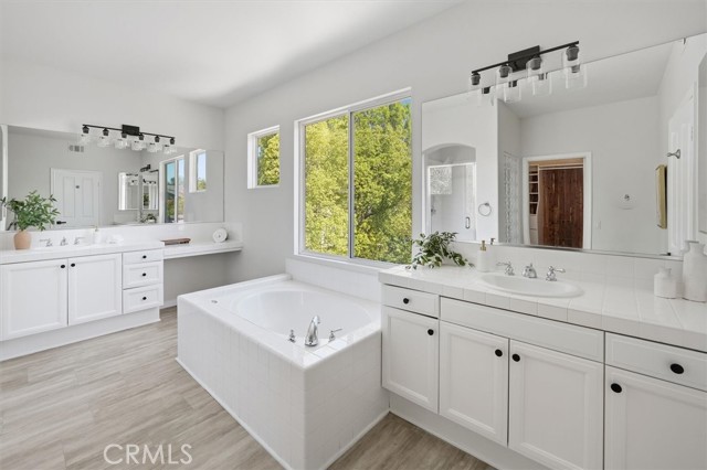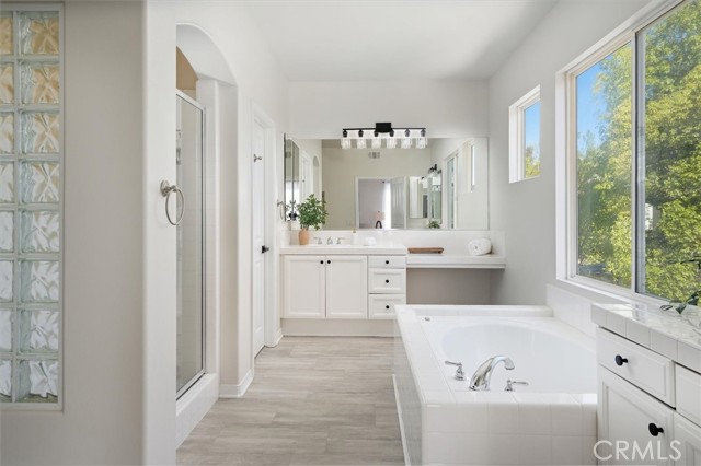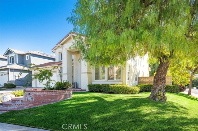 Beautiful Northbridge Point home in Valencia with 5 bedrooms, 4 bathrooms, and a 3-car garage- just down the street from one of the HOA pools and playground. This corner-lot property includes a high-power owned solar system and has been beautifully updated throughout with new flooring, fresh interior paint, updated light fixtures, and new door and cabinet hardware. The kitchen features a large center island, white cabinetry, stainless steel appliances, and a walk-in pantry, and it opens to the family room with a corner fireplace and dinette area. There is a bedroom and full bathroom downstairs, perfect for guests or extended family. Upstairs, the spacious primary suite includes a retreat, cedar-lined walk-in closet, and large en-suite bath with soaking tub, walk-in shower, and dual sinks. Additional bedrooms include one with a private bath and two with a shared bath. Other highlights include recessed LED lighting, dual-zone HVAC, a central vacuum system, a laundry chute, and a backyard filled with fruit trees including guava, loquat, jujube, fig, pomegranate, and grapevines. As a corner lot, it offers extra parking and privacy. The garage is a generous 3+ car garage and space can be used to make a bigger family room or 6th bedroom and still have a 3 car tandem garage. Enjoy Northbridge Point amenities including community pools, a clubhouse, playground, and scenic paseos connecting to Helmers Elementary and Bridgeport Lake. Low HOA dues, no Mello Roos, and convenient access to Rio Norte Junior High and Valencia High School.