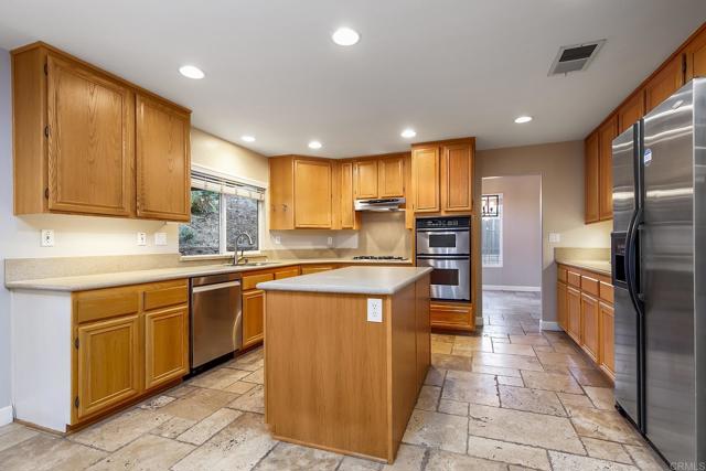 5 BEDROOM, 3 BATH 2868 SQ FT HOME ON A .27 ACRE LOT WITH NO HOA AND THIS HOME FEATURES A FRESHLY PAINTED INTERIOR, NEWER CARPETING WITH TRAVERTINE FLOORING, BEDROOM AND FULL BATH ON THE 1ST FLOOR, VAULTED CEILINGS, SPACIOUS LIVING ROOM AND FAMILY ROOM WITH FIREPLACE, HUGE EAT IN KITCHEN WITH CORIAN COUNTERS, STAINLESS APPLIANCES, CENTER ISLAND ALONG WITH WALK IN PANTRY, PAID FOR SOLAR, WHOLE HOUSE FAN, RAISED PANEL DOORS, RECESSED LIGHTING, DUAL PANE WINDOWS AND SLIDERS, INSIDE LAUNDRY ROOM, LARGE PRIMARY BEDROOM, PRIMARY BATH HAS DUAL VANITY, SEPARATE TUB/SHOWER, DUAL WALK IN CLOSETS WITH ORGANIZERS, BIG GUEST BEDROOMS, PROFESSIONALLY LANDSCAPED YARD WITH STAMPED CONCRETE, FIREPIT, GRASSY AREA, INCREDIBLE COVERED PATIO WITH OUTDOOR KITCHEN, BUILT IN BBQ WITH SIDE BURNER AND BEVERAGE FRIDGE, 3 CAR GARAGE, RV PARKING AND MUCH MORE.