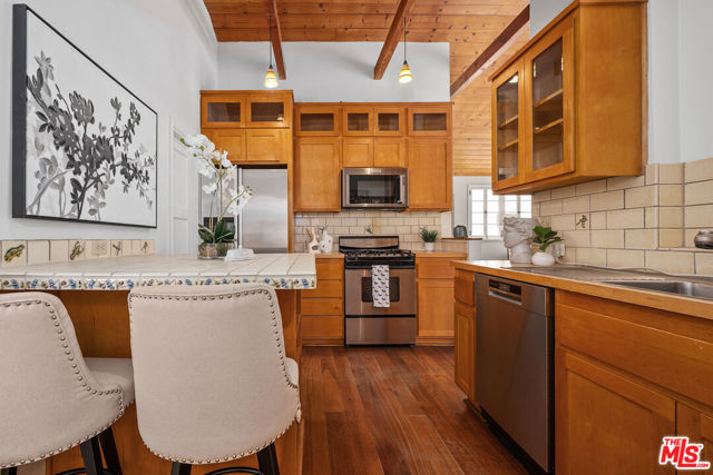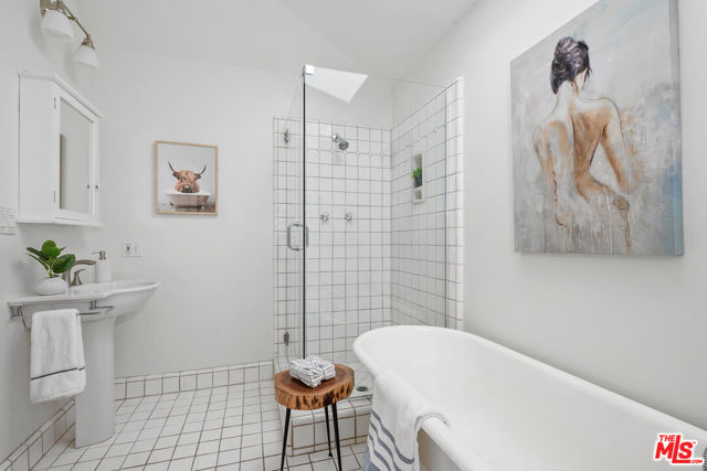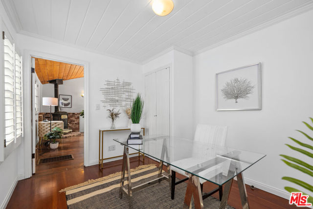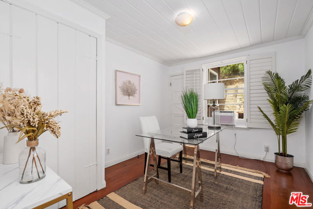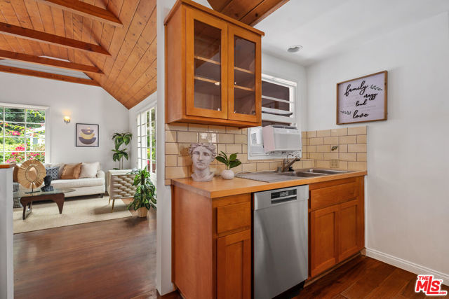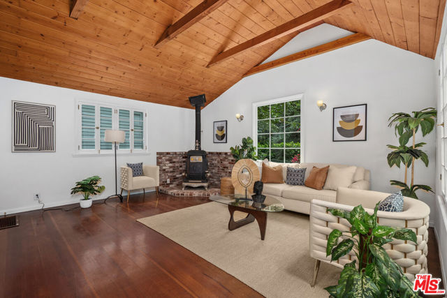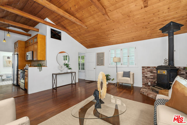 Tucked in the Bel Air hills, this storybook cottage oozes character and charm. Vaulted wood-beam ceilings and wide plank floors set the vibe, while the living room steals the show with its antique wood-burning stove and warm, rustic feel. Set on a quiet cul-de-sac just minutes from Sunset, it feels like a hidden escape, close to everything, yet totally its own world. A brick patio and front garden are made for slow afternoons in the sun, and the kitchen's cozy breakfast nook is basically begging for morning coffee hangs. The skylit bathroom with a clawfoot tub and pitched ceiling brings serious vintage magic. Romantic, private, and full of soul, this is one of those rare homes that just feels different.