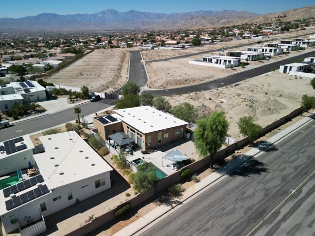 Perched on an elevated lot at the end of a quiet cul-de-sac, this modern mid-century home showcases breathtaking mountain panoramas and some of the best views in the neighborhood. Located near the Spa District, the 2017-built 2,054 sq ft residence combines striking architecture, soaring ceilings, and walls of glass that frame the desert landscape.The open-concept kitchen stands out with a dramatic island, sleek cabinetry, and under-counter lighting--flowing effortlessly into bright living and dining areas ideal for entertaining. Durable tile floors ground the main spaces, while plush carpet adds comfort to the bedrooms.The primary suite includes a generous walk-in closet and spa-inspired bath. Two guest bedrooms share a Jack-and-Jill bathroom, offering both privacy and convenience.Outside, enjoy your private elevated oasis with a sparkling pool and spa, twin gazebos, and low-maintenance landscaping--perfect for relaxing or hosting with a view.Upgrades include paid-off solar, tankless water heater, two-car garage with built-ins, storage shed, and no HOA fees. Sitting on a 10,018 sq ft lot, this 3-bed, 2-bath gem delivers modern design, energy efficiency, and stunning mountain views. Call today to view!