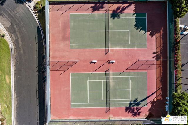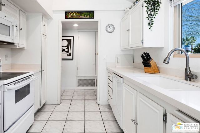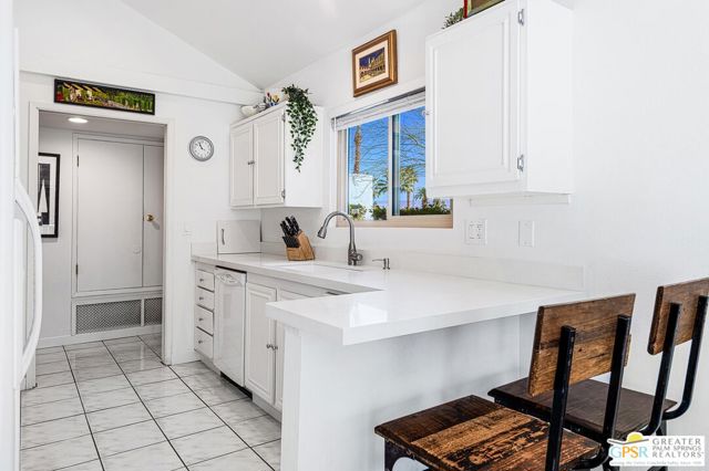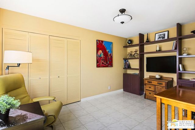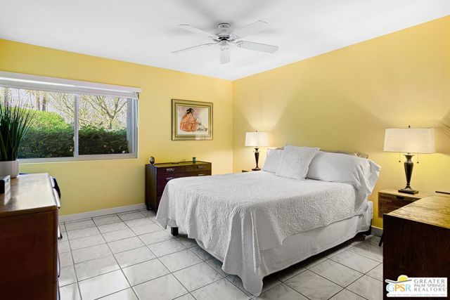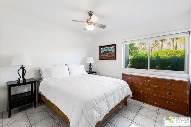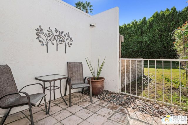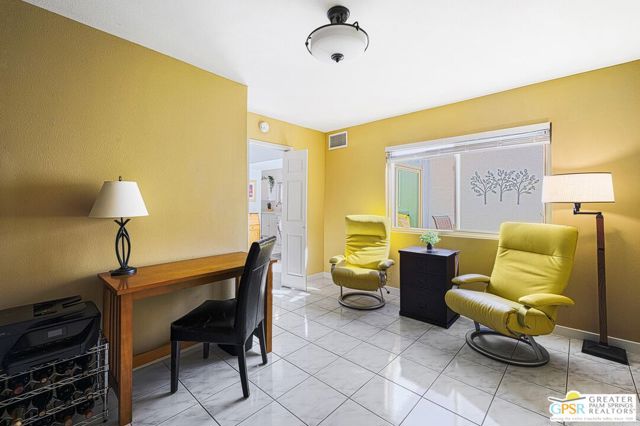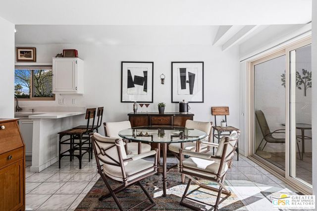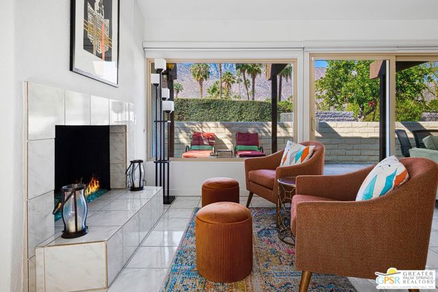 Incredible opportunity to own a Hugh Kaptor designed 3BR/2Ba residence in the heart of South Palm Springs! The living room features high vaulted ceilings with a fireplace and wall of glass overlooking your private southwest covered patio and impressive majestic mountain views that invite an abundance of natural light in an open layout perfect for relaxation or entertaining. New double pane windows and glass sliders throughout the home ensure energy efficiency, peace and quiet. The bright kitchen with new quartz countertops opens to the dining area which also opens through double pane glass sliders to an additional south facing private patio. The generous primary suite with ensuite bathroom and the guest bedroom, across the hall from the second bathroom which serves as your powder room when entertaining, both feature stunning direct San Jacinto Mountain views. The third bedroom is on the opposite side of the home and currently set up as an office/den. Washer/dryer is located conveniently in residence, and there is also a detached one car garage. Nestled within a beautifully maintained community known for its lush grounds, sparkling pool and spa, tennis/pickleball courts, and a dog park, this home offers the best of Palm Springs resort living. HOA includes cable, internet, roof and landscape maintenance. The property is within walking distance to restaurants, shopping, markets, and just a short drive to downtown and the Palm Springs airport.