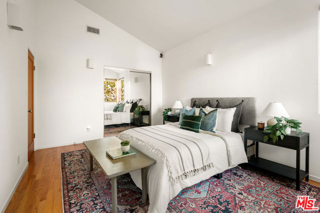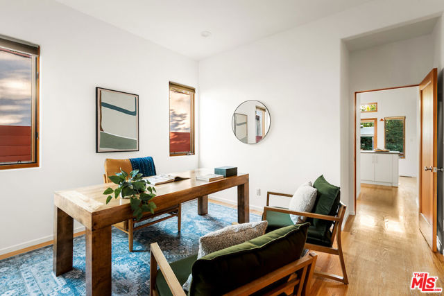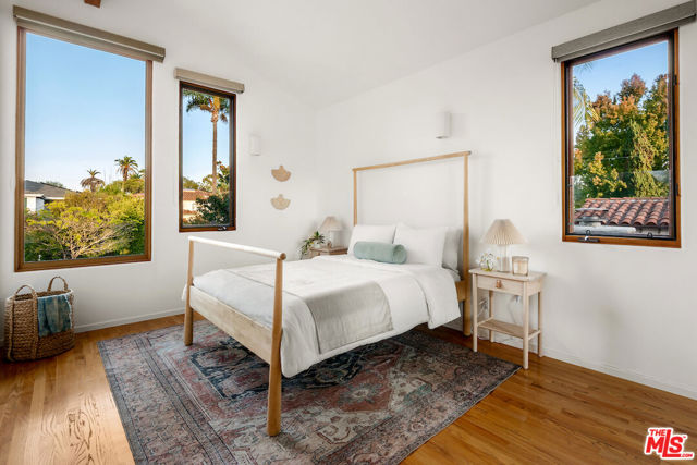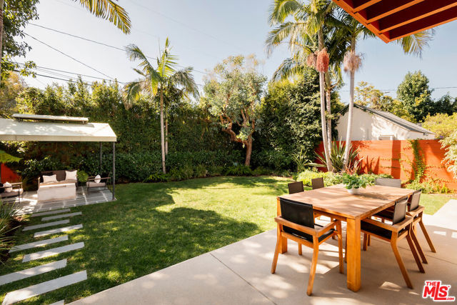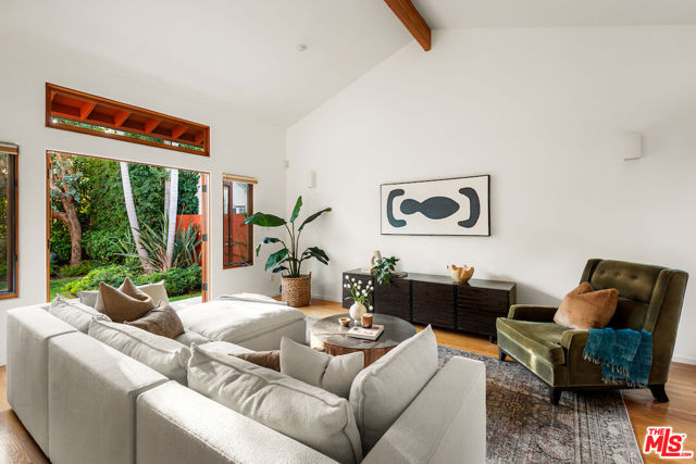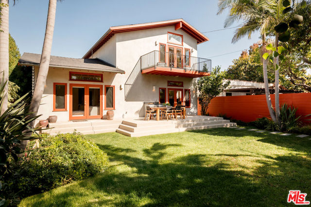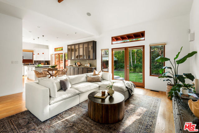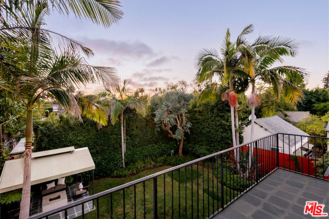 Architecturally designed and custom built contemporary Mediterranean with outstanding indoor outdoor flow, high volume vaulted ceilings with wood beams, warm wood flooring and walls of stone, the residence sits on a large lush lot in a great mid-block location. The home features an open floor plan, large living room with fireplace, a separate dining room with access to an outdoor patio, an open gourmet kitchen with six-burner Wolf range, an island, an eating area and built-ins, a family room with easy access to a spacious back patio, several seating/entertaining areas and large grassy enclosed back yard with mature landscaping and room for a pool. There is an office/bedroom plus one and a half baths on the first level. The second level has great light with high vaulted ceilings and skylights. The spacious primary bedroom suite has dual walk in closets, a spa-like bathroom and a large balcony. There are two additional large bedrooms with enormous windows and lots of light. The garage is oversized with direct entry into the house.