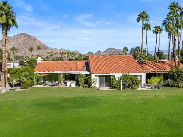 Magnificent! Southern view of the Santa Rosa Mountains, a great room design, and a totally upgraded chef's kitchen - this is everything you've been looking for! An expansive private courtyard with a sparkling fountain and desert planting expands your living space and welcomes guests into your stunning home! This ........ model has been artfully restyled to incorporate an open floor plan which features amazing views of the 11th fairway of the Dunes course and the mountains beyond. A stylish circular counter anchors the great room, affording easy entertaining and dining with a view. A built-in wine cooler is a welcome addition to any party! The kitchen has been enhanced with quartz countertops, stainless steel appliances, and custom cabinetry. The three large bedrooms offer the luxury of en suite baths, beautifully upgraded with quartz countertops and spa-like amenities. Each bedroom opens to a patio, to capture our glorious desert climate. The expansive patio sets the stage for al fresco dining, with a built-in BBQ, bar, large covered area and a firepit. Relax, recharge, take in the stunning view - come live the lifestyle you so richly deserve!