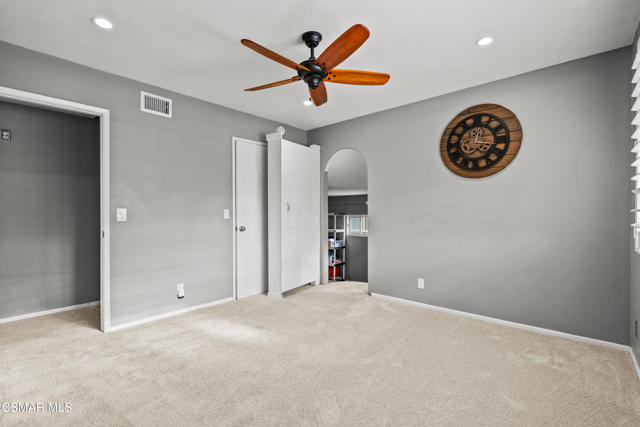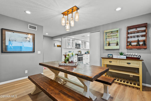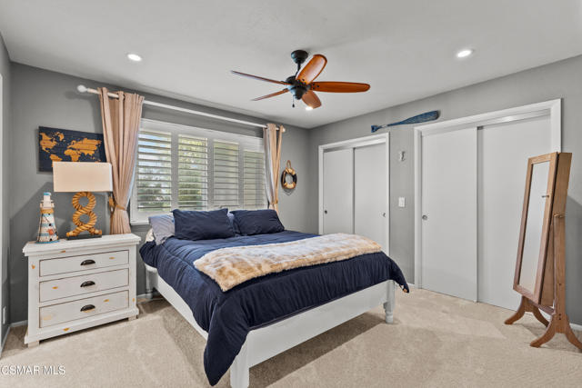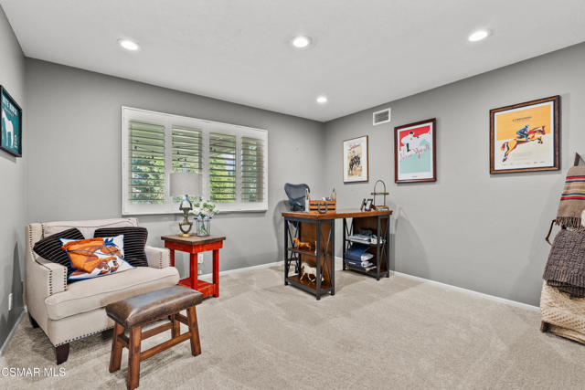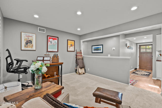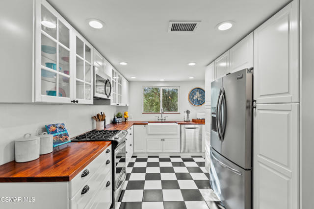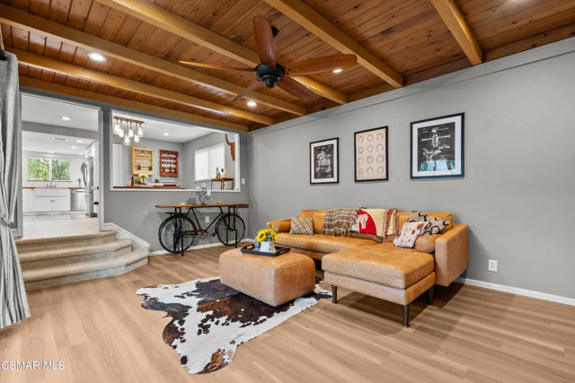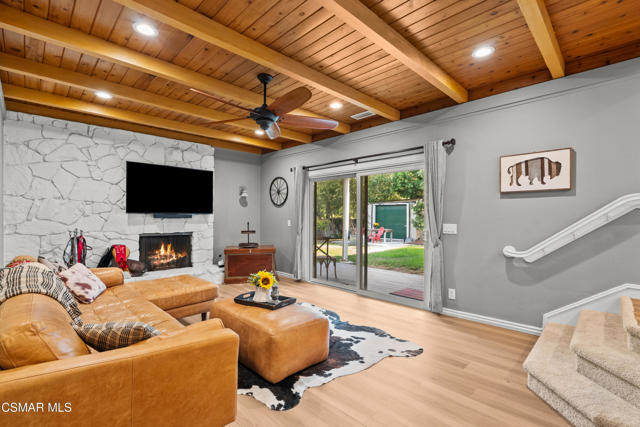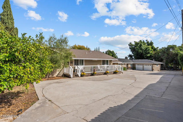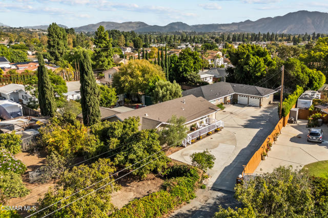 Custom-built, single-story ranch-style home in the highly sought-after Camarillo Heights neighborhood, nestled on a secluded private cul-de-sac road with hillside mountain views, on nearly a quarter-acre. This 3-bedroom, 2-bath residence boasts a modern open-concept office and a cleverly converted garage, now a secret hidden bonus room. The fully updated kitchen features contemporary finishes including butcher block counters, white enamel farmhouse sink, and stainless steel appliances, complemented by new flooring and carpet throughout. Enjoy the charm of open wood beam ceilings, smooth ceilings, recessed lighting, and modern ceiling fans. A newer air conditioner, dual-pane windows with plantation shutters enhance energy efficiency, paired with a tankless water heater and water softener. Cozy up by the grand stone fireplace in the inviting rear living room, savor vibrant Camarillo sunsets from the expansive west-facing front porch, or unwind year-round under the covered back patio, overlooking a spacious grassy yard with concrete walkways, a convenient shed, a fire pit, ample shade, and mature fruit trees. With no HOA fees, this move-in-ready retreat, blends charm and modern living.