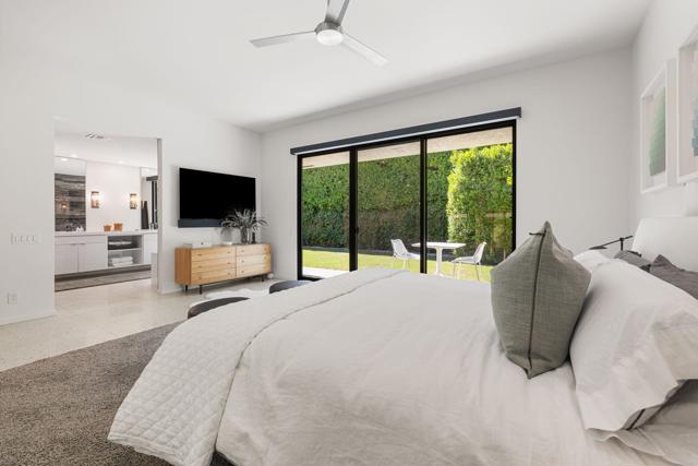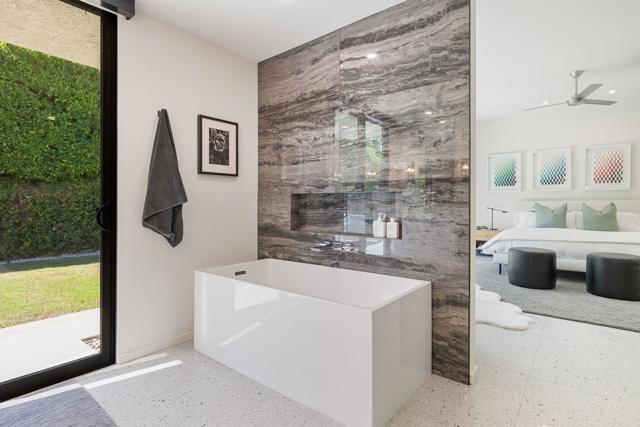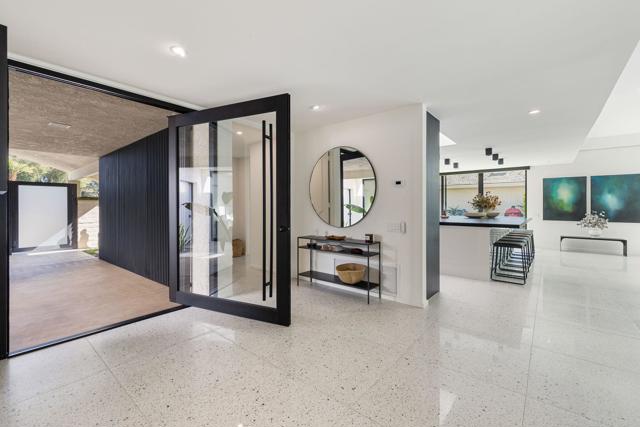 Welcome to this one-of-a-kind redesigned home in The Springs, where modern elegance meets ultimate comfort. The WOW factor starts at the impressive glass pivoting front door, setting the tone for the stunning interior that awaits. Gather your friends and family around the massive 12' x 7' honed quartz kitchen island, which seats 10--perfect for entertaining! This contemporary chef's kitchen boasts sleek white lacquer uppers and rich espresso lower cabinets, featuring top-of-the-line appliances including a 6-burner dual-fuel Wolf range, a 54'' Fisher Paykel built-in refrigerator, and a Gaggenau wine cooler.With large format Terrazzo porcelain tile flooring throughout, the home exudes a sleek desert vibe. The upgraded Level 5 smooth coat walls, Smart Home system with all AV equipment included, and power roller shades elevate the living experience to new heights. Each remodeled bathroom features designer-inspired finishes, while the primary suite is a true retreat, complete with a luxurious soaker tub and dry sauna.Step outside to discover your own private oasis. The expansive yard features new concrete sand finished pool decking, perfect for lounging and dining, along with a large private pool, spa, and fire pit--ideal for gatherings under the stars. This home is move-in ready and perfectly dialed in!
