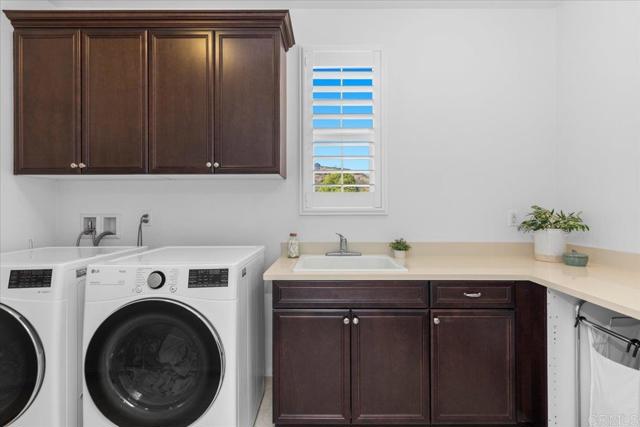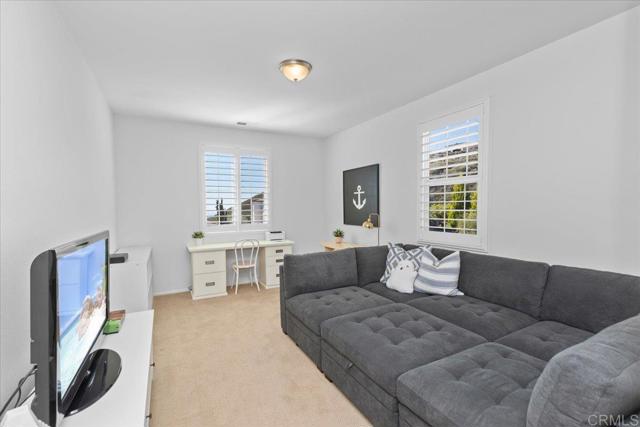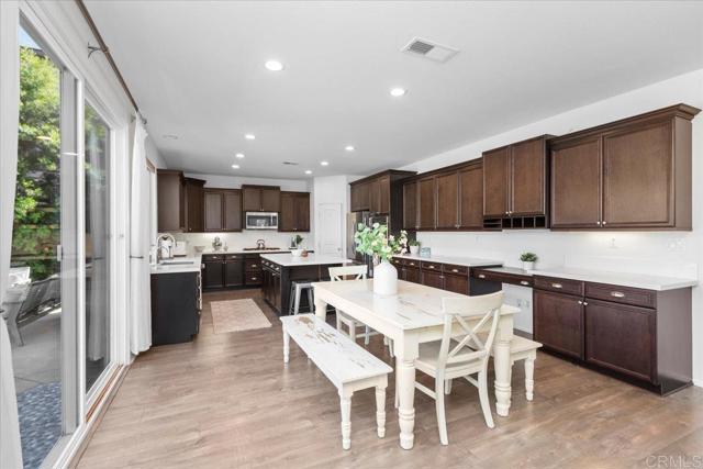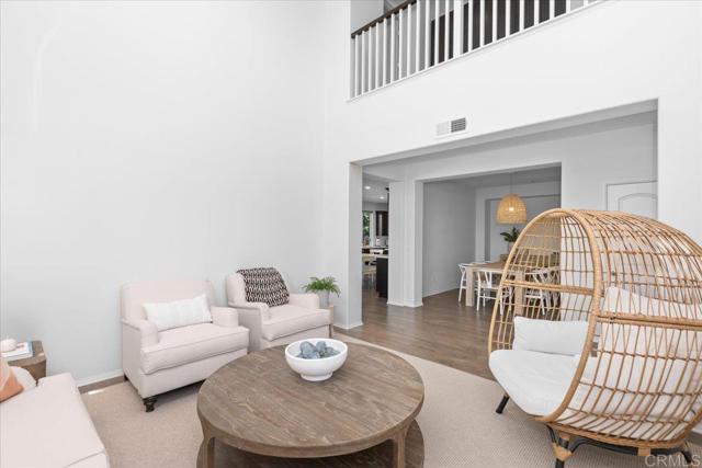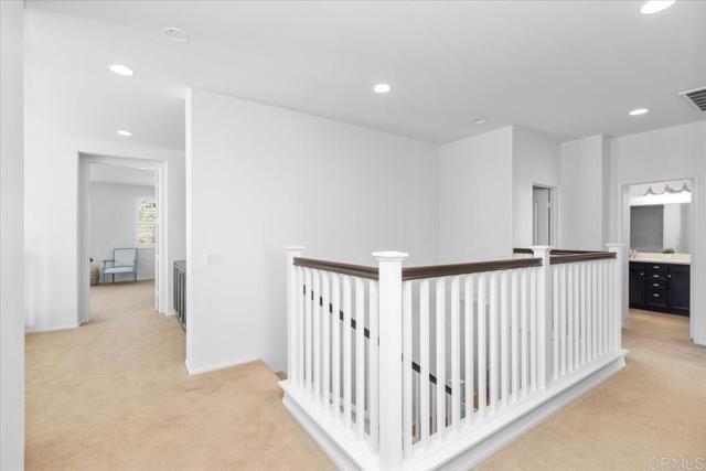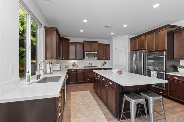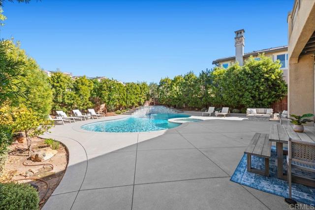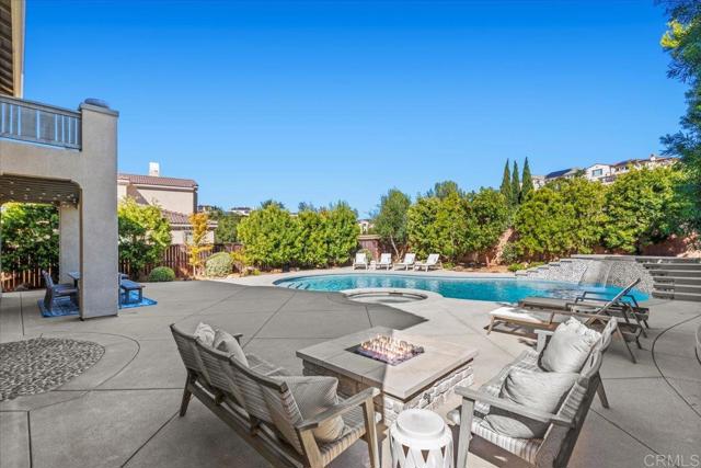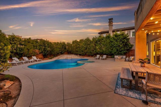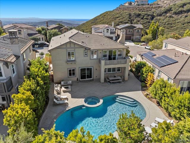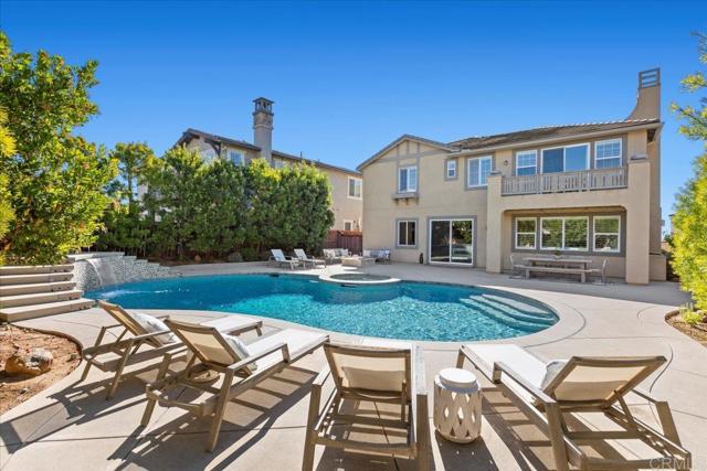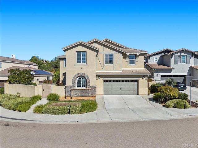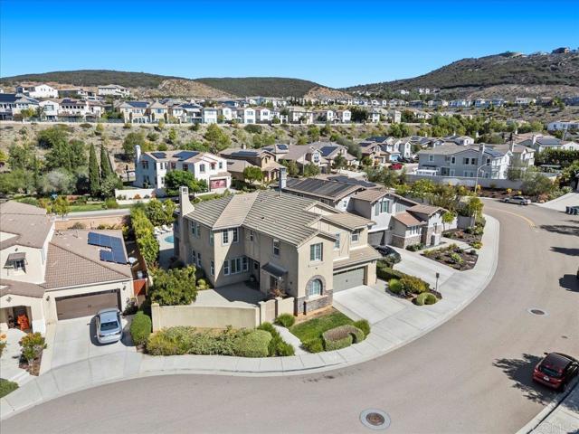 Absolute show-stopper in San Elijo Hills! Perfectly situated on a quiet cul-de-sac in the coveted Altaire community, this stunning five-bedroom, four-bath executive home offers the ideal blend of privacy, functionality, and resort-style outdoor living. The expansive 8,545 sq ft lot features a sparkling saltwater pool and spa, fire pit, and multiple lounging areas framed by mature shade and privacy trees—creating a perfect balance of luxury, comfort, and a true sense of home. A gated front courtyard welcomes you into a light-filled interior with soaring ceilings, plantation shutters, and beautifully updated plank flooring. The heart of the home showcases a spacious kitchen with quartz countertops, double oven, a large island, and a walk-in pantry, opening seamlessly to the family room and backyard for effortless entertaining. Upstairs (which even offers peek-a-boo views!) features four generously sized bedrooms, each with a walk-in closet, plus a large loft ideal for a playroom, office, or media space. A downstairs bedroom and full bath provide flexible living options for guests or multi-generational families. The backyard retreat is an entertainer’s dream, complete with an 8-foot-deep saltwater pool, fire pit, and outdoor spaces framed by mature landscaping and fruiting plum, peach, apricot, Meyer lemon, cherry, and nectarine trees. The yard is wired for a Sonos surround sound system, creating the perfect atmosphere for outdoor gatherings. Additional highlights include a three-car garage, highly rated Double Peak K–8 school, low Mello Roos, and a premier cul-de-sac location. - San Elijo Hills offers ballparks, soccer field, picnic & bbq area, playgrounds, dog park, community center...and all are within walking distance. Enjoy the pedestrian friendly town center, with fountain, shops and eateries along with the 18 miles of trails, 19 acre park, 1000 acres of open space. Seller to select services. Room dimensions & sq footage are approximate, per builder & assessor's record. Mello-roos is estimated. All MLS & marketing info is approximate & not guaranteed.