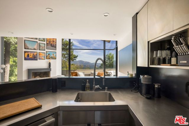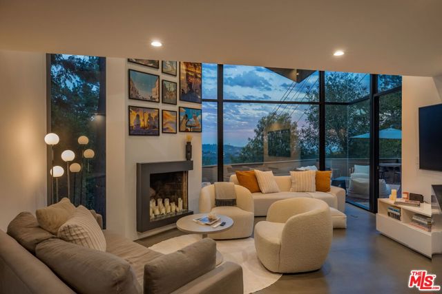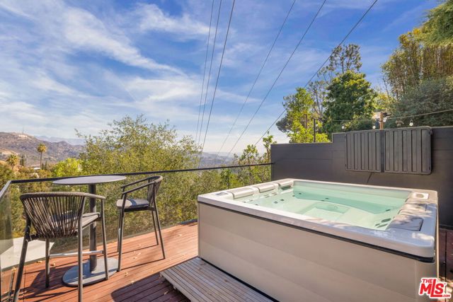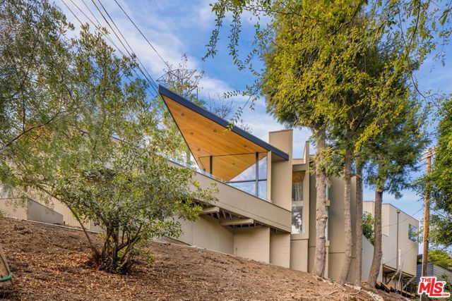 Dramatic Lautner-inspired architecture in the prestigious Outpost Estates. Proudly presenting the George Deutsch Residence. Deutsch worked with Lautner on the world-famous Wolff Residence (1963), quickly becoming enamored with the unique design of Lautner's masterpiece. 7187 Macapa is Deutsch's site-specific, 2/3 scale model of Wolff, Lautner's only homage to his teacher, Frank Lloyd Wright. George Deutsch built his dream home for himself. 7187 Macapa is sited on a rare double wide serenet street in the Hollywood Hills, which culminates in a cul-de-sac. The home is the product of a comprehensive multi-year restoration / modernization. Everything has been considered & meticulously renovated with custom finishes and thoughtful design. The living area boasts polished concrete floors, 16.5 foot ceilings, and walls of glass allowing for seamless indoor/outdoor living. The kitchen has been fitted with Miele appliances and custom blackened and stainless steel cabinetry. Upstairs, the private primary suite, features a considerable walk-in closet, custom wet room concept with teak flooring, rainfall showerhead, ceiling mounted tub filler, and freestanding Badeloft tub. With impeccable design and thoughtfully designed spaces, this property is the perfect retreat from city life for the most discerning collector. Newer Ipe multi-level decks offer abundant space for entertaining and taking in sunsets. Outdoor amenities include a lounge area, fire pit, a jacuzzi, and landscaped terraces. The garage has been converted into a fully equipped ADU. All this, only moments from Runyon Canyon hiking trails, West Hollywood, the Studios, and 101 Freeway.