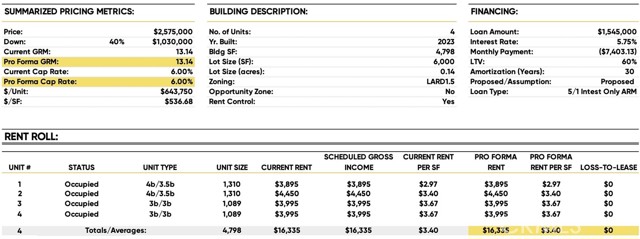 234 N Burlington Ave | A Fully stabilized 2023 construction fourplex delivering a true 6.00% cap rate at $2,575,000. This rare income property offers immediate, predictable cash flow with zero lease-up risk: ideal for end-of-year and 1031 exchange buyers seeking strong returns in a core Los Angeles location. Each unit features modern 3- and 4-bedroom layouts with open floorplans, designer kitchens, in-unit laundry, and premium finishes that command top rents. Eight total parking spaces, separate utility meters, and all new systems ensure minimal operating costs and maximum efficiency. Located just blocks from Echo Park Lake, Silver Lake, and Downtown LA, the property attracts high-earning tenants and benefits from continued submarket growth driven by limited SB 8 supply and consistent rental demand. This is one of the few stabilized assets in LA offering verified 6% performance with clear long-term appreciation upside.