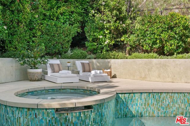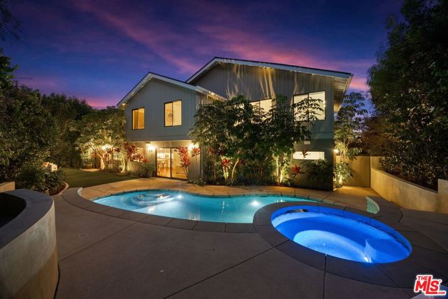 This stunning 5-bedroom, 4-bathroom Lake Hollywood residence has been completely reimagined by renowned designers Vaughan Benz, blending modern sophistication, family functionality, and timeless California style. Nestled just below the iconic Hollywood Sign on a quiet cul-de-sac, the home sits on a wide, sidewalk-lined street with ample parking - an ideal setting for families and gatherings. A private gated courtyard introduces the property with lush greenery, and tranquil seating areas before opening to a light-filled two-story layout. Inside, North American walnut hardwood floors, custom lighting, and tailored finishes create an inviting, contemporary atmosphere. The expansive family room serves as the heart of the home, flowing seamlessly into a chef's kitchen equipped with a Wolf range, a wine fridge, walk-in pantry, and a generous center island with casual eat-in dining. Perfect for everyday living and entertaining, this space connects effortlessly through walls of glass to the resort-style backyard. Step outside to a garden sanctuary designed by landscape designer Steve Silva - a private oasis with sparkling pool and spa featuring a waterfall, built-in fire pit, fruit trees, herb garden, and low-maintenance turf lawn. Whether hosting friends or relaxing under the stars, this outdoor retreat was made for connection and calm tranquility. Upstairs, the luxurious primary suite offers sweeping views, an oversized walk-in closet, and a spa-inspired bath with Apaiser soaking tub, dual vanities, glass shower, and Seura TV mirror. Four additional bedrooms and three beautifully designed baths provide generous space for family and guests. Additional highlights include a built-in stereo system, a spacious laundry room with custom cabinetry, and a direct-entry two-car garage. Located minutes from the 101, major studios, the Hollywood Bowl, and scenic Lake Hollywood trails, this newly remodeled home offers the perfect balance of luxury, lifestyle, and Los Angeles living beneath one of the city's most legendary landmarks.