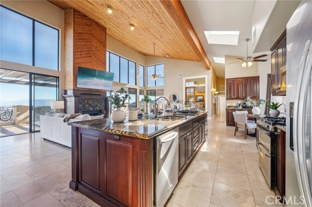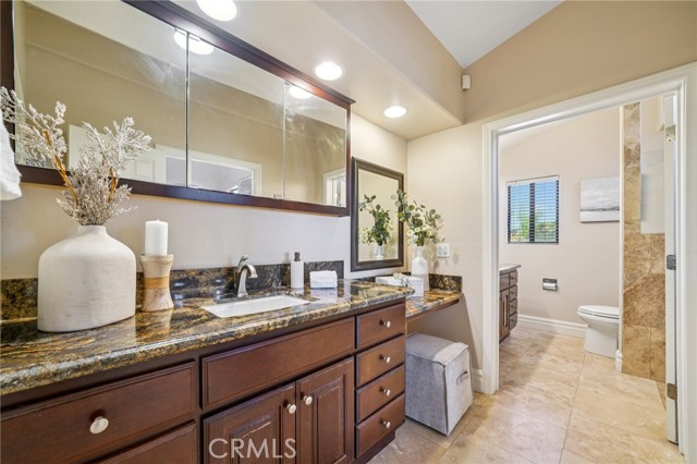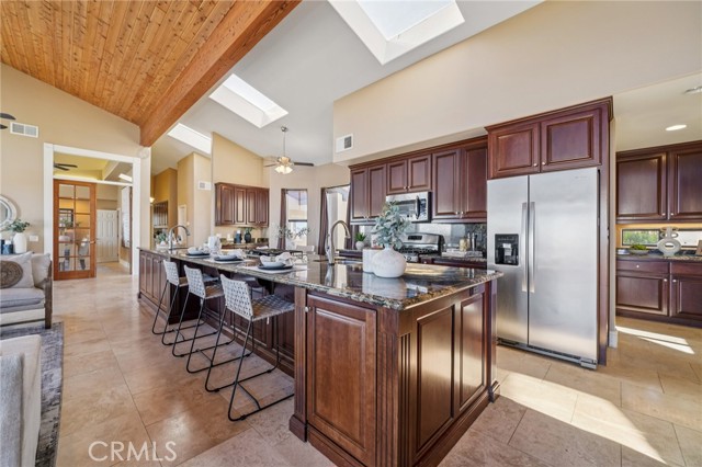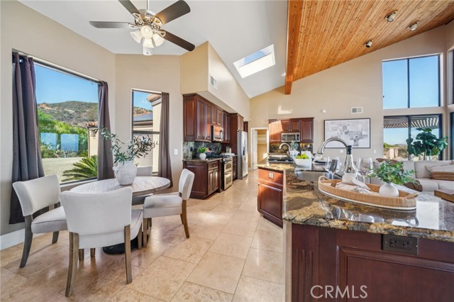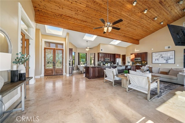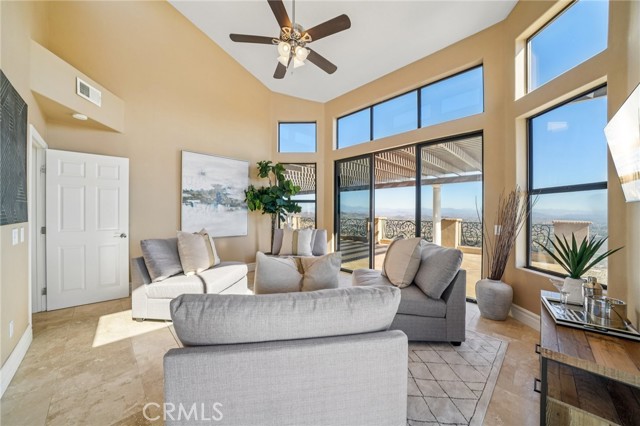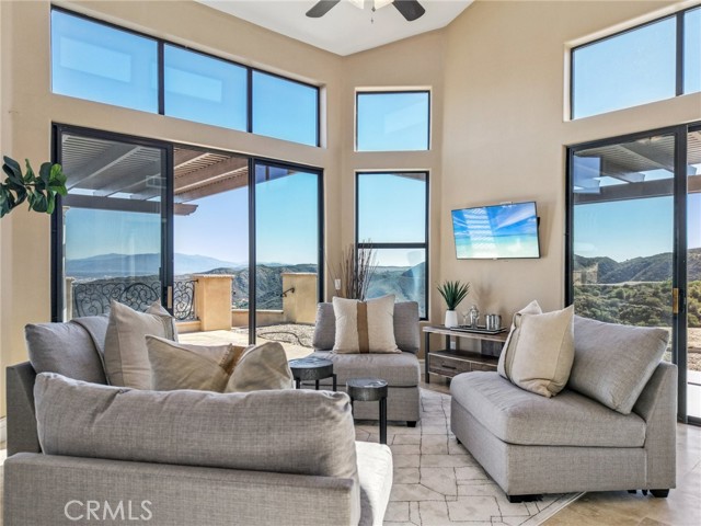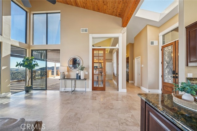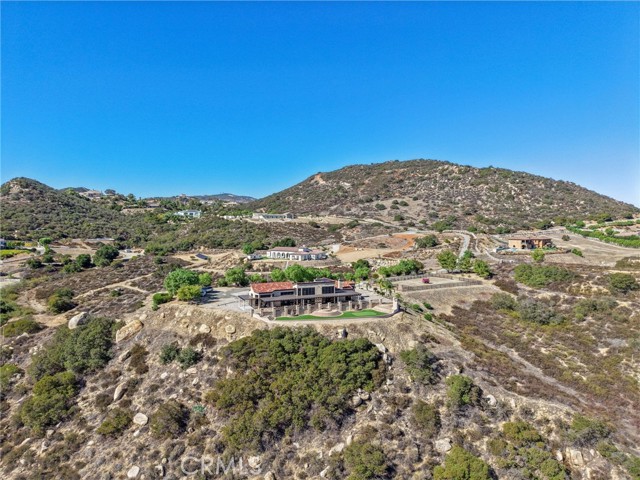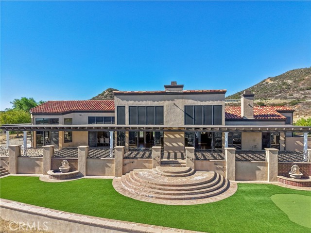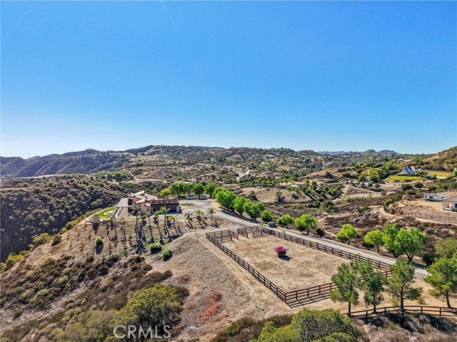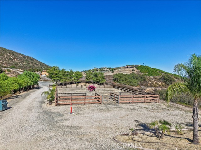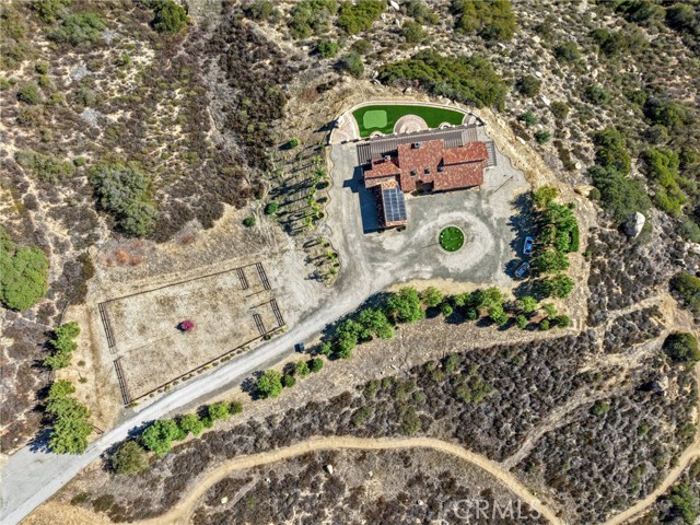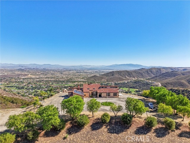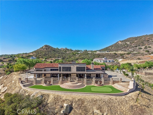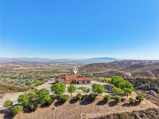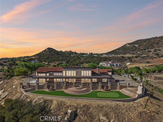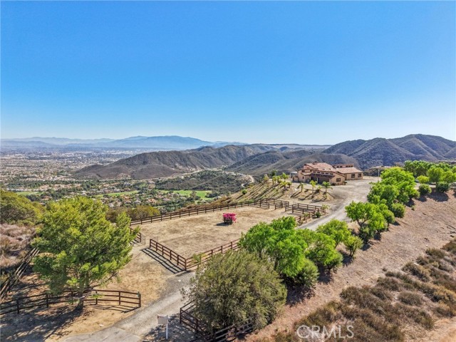 SINGLE-STORY LA CRESTA ESTATE on 10+ private acres with breathtaking panoramic views of the Bear Creek Golf Course, Santa Rosa Plateau, Temecula/Murrieta Valleys, Mount San Jacinto, and sparkling city lights. A private gated driveway sets a grand arrival to this serene, luxury retreat. Enjoy Semper Solaris solar backed up by two Tesla Powerwalls, plus 33 guava trees—including strawberry, white, lemon, and pineapple varieties—with room to expand your orchard or plant a vineyard. The expansive great room boasts dramatic ceilings, picture windows, and seamless indoor–outdoor living. The entertainer’s kitchen showcases an 18-ft granite island, premium appliances, two sinks, two stovetops, two microwaves, and two dishwashers, with elegant custom cabinetry and abundant storage. Flexible layout with 4 bedrooms plus formal dining/office, and potential for a separate-entry suite. The spa-inspired primary bath features a luxurious double walk-in shower. The bedrooms feature upgraded porcelain tile flooring, combining style, comfort, and easy maintenance. Recent upgrades include new skylights, new roof underlayment, exterior re-stucco and paint, replaced capstones on the terraces, new patio with architectural pillars and an Elitewood Ultra heavy-duty cover with Kynar 500 coating, and new outdoor lighting fixtures. Outdoor living spans over 5,000 sq. ft. of terraced space with an outdoor fireplace, putting green and flag area with AstroTurf, and ample parking for guests and vehicles. The property is horse-ready with stalls, arena, and access to extensive horse trails, plus space for a barn, guest house, or other amenities. Additional features include two heating and cooling units for zoned comfort. Luxury, privacy, usable land, and unforgettable views—this rare La Cresta estate combines elegant living with the natural beauty of Southern California.