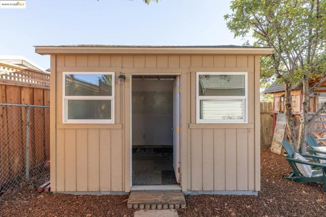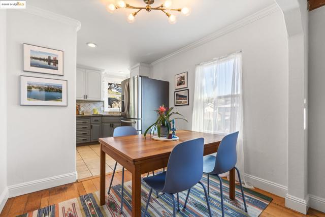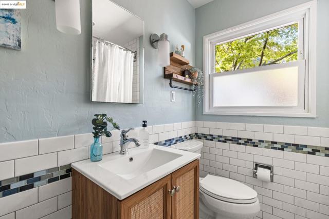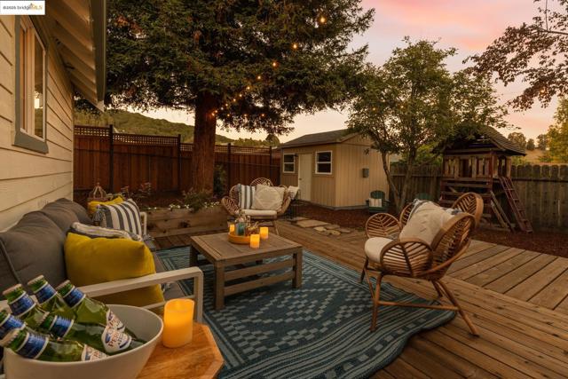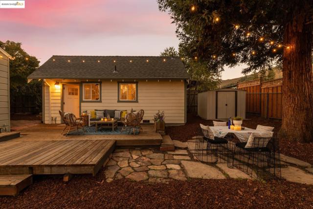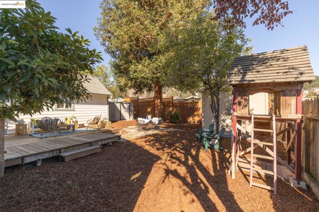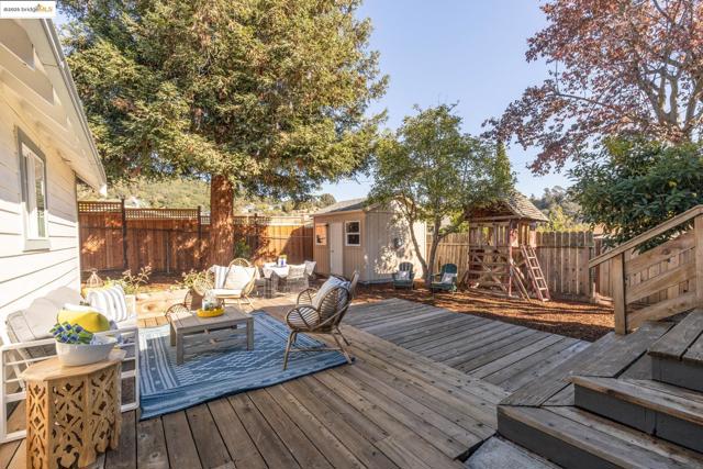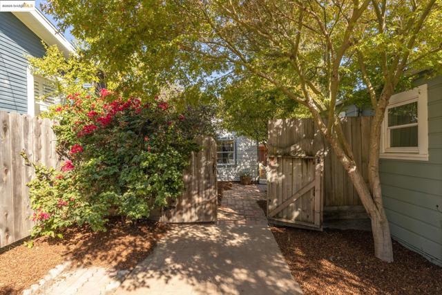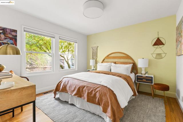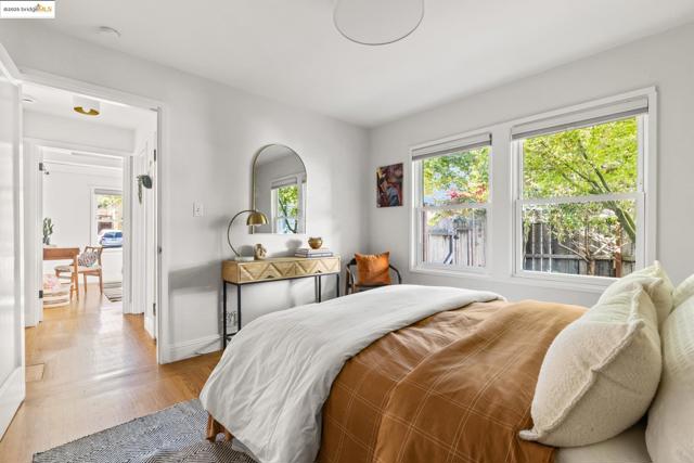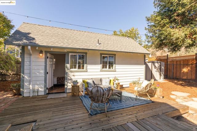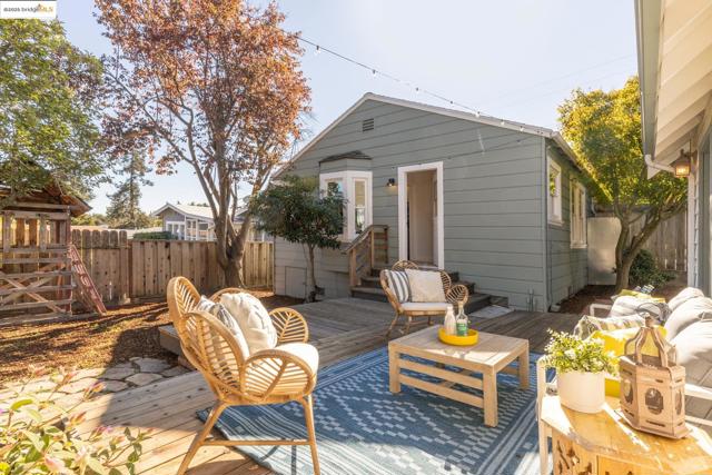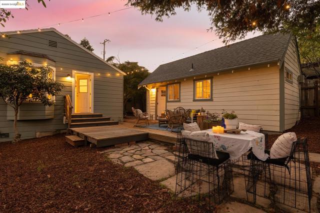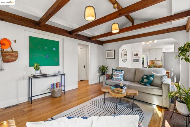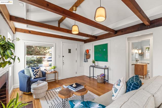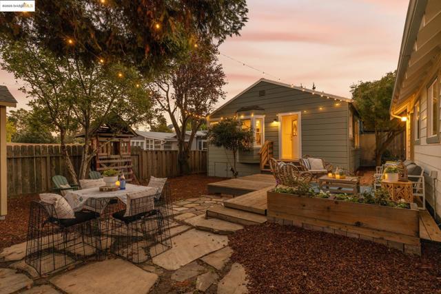 Welcome to this sunny California one-level bungalow with a fabulous detached guest house on an extraordinary lot. A lush front garden and welcoming porch set the tone for the bright interior of the main home, featuring exposed wood beam ceilings, hardwood floors, and fireplace. The dining area flows into a stylish kitchen with granite counters, gray and-off-white cabinetry, and a cozy breakfast nook with bay windows. Two comfortable bedrooms share a remodeled bath with subway tile and soaking tub. Convenient and spacious laundry room with workspace. Outside to find the detached one-level guest house with kitchenette and full bath; ideal for family, friends, or a home office. The oversized backyard boasts a patio & multiple gathering and play areas! Do not miss a semi-finished shed - which adds flexible space for a maker’s space or workshop. Long driveway for lots of off-street parking! EV charger, owned solar. Convenient to I-580, minutes to King Estate Open Space Park, Redwood Regional Park, Lake Chabot, and the Oakland Zoo. This is a special urban retreat!