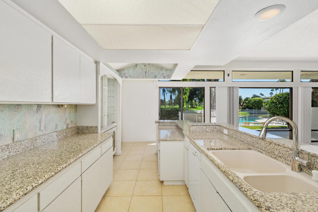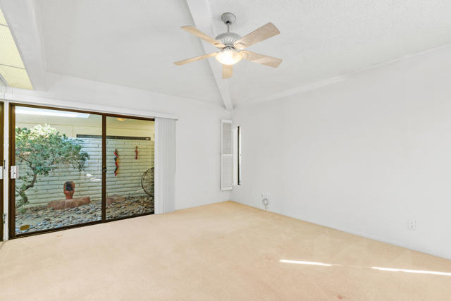 This home has a distinct 1970s vibe, offering a time capsule experience for those seeking a unique living environment. Reimagine it or renovate, the choice is yours! Approximately 2,028 square feet, this three-bedroom, three-bathroom condominium features a spacious exterior and lush landscaping, creating an inviting entryway. The open layout allows for ample natural light, showcasing the scenic outdoor views from the property. The spacious kitchen boasts granite countertops, and the exposed brick walls throughout add a unique and charming touch. The primary bedroom and additional bedrooms provide ample space, with each room offering bright lighting and ceiling fans. The bathrooms feature generous counter space and abundant natural light, ensuring comfort and functionality.The home's spacious outdoor area is well-maintained, with an inviting back patio perfect for relaxation just steps from the shared pool. Also equipped with built in BBQ and your very own drive up golf cart garage.