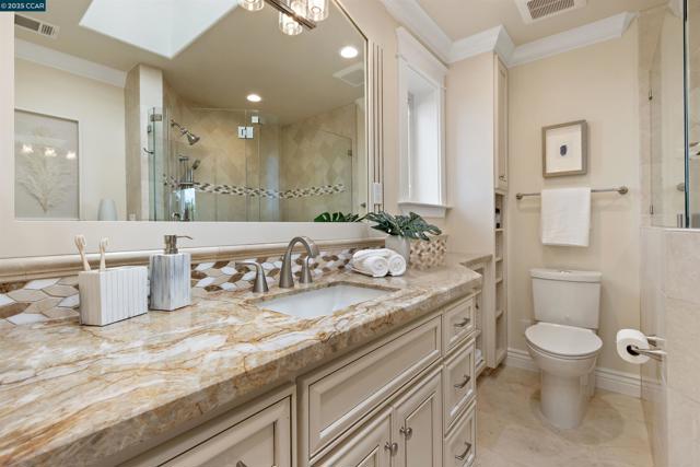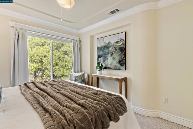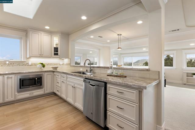 Best View in Rossmoor! Experience refined living with panoramic views of Mt. Diablo, the rolling hills of Rossmoor & downtown Walnut Creek from this extensively remodeled 2-bedroom, 2-bath home in Rossmoor’s 55+ community. Step inside to beautiful wood floors in the entry and kitchen, complemented by skylights, recessed lighting, and dual-pane windows that fill the home with natural light. The open-concept kitchen is designed for both entertaining and everyday living, featuring custom cabinetry, stone counters, stainless steel appliances, under-cabinet lighting, and windowed upper cabinets that flow seamlessly into the dining area. The living space is anchored by a cozy electric fireplace with elegant built-in cabinetry, while a versatile enclosed room offers the perfect spot with built-in office or hobby space. The spa-inspired primary bath showcases tile flooring and a large stall shower, while the second bath includes tile flooring and a walk-in jetted tub/shower for relaxation. Additional highlights include luxury vinyl plank flooring, plush new carpet, a conveniently located carport, and an extra storage unit. Enjoy Rossmoor’s vibrant gated lifestyle with golf, tennis, pickleball, bocce, hiking, fitness center, theater, dog park, hobby rooms, and 200+ clubs.