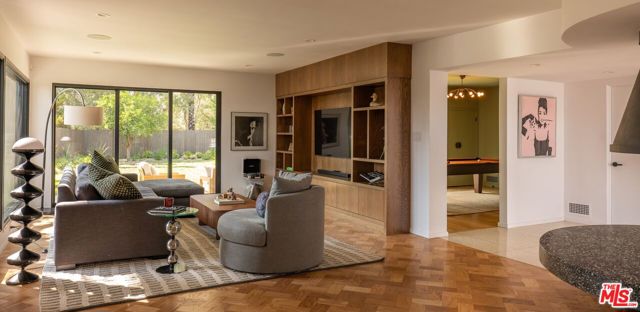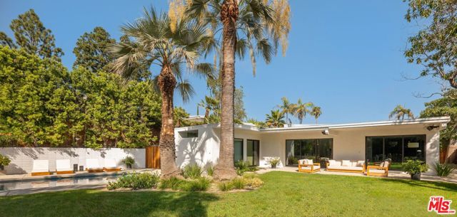 A CLASSIC LA TURN-KEY MID-CENTURY, RIVALING THE TIMELESS APPEAL OF THE ICONIC CASE STUDY HOMES. Set on an expansive three-quarter-acre west-facing lot, the single-story residence seamlessly marries breathtaking canyon views with an effortless indoor-outdoor lifestyle. The home has been thoughtfully reimagined for contemporary living while preserving its authentic mid-century soul. Original brass-bordered terrazzo floors and rich herringbone hardwood create a foundation of timeless elegance, while expansive walls of glass bathe the interiors in natural light and frame serene canyon vistas. A dramatic skylight adds another layer of illumination, and the iconic round black terrazzo fireplace serves as a striking focal point that anchors the living space. Spanning approximately 3,100 square feet, the residence offers four bedrooms and three-and-a-half bathrooms, complemented by thoughtful entertaining spaces. The spacious primary suite features a walk-in closet and a luxurious bathroom with a steam shower, creating a true spa-like retreat. The dining area includes a sleek wet bar perfect for hosting, while the family room showcases custom built-in cabinetry that seamlessly blends form and function. A dedicated game room and spacious mudroom/laundry complete the interior layout. The outdoor spaces are equally impressive, featuring a resort-style pool and spa, professional BBQ area, and expansive flat grassy yard - all designed for both intimate gatherings and grand-scale entertaining. A two-car garage with direct access and a circular motor court with ample parking. This is a rare, turnkey offering in prime Bel Air - an architectural gem where classic mid-century design meets modern luxury in a truly exceptional canyon setting.