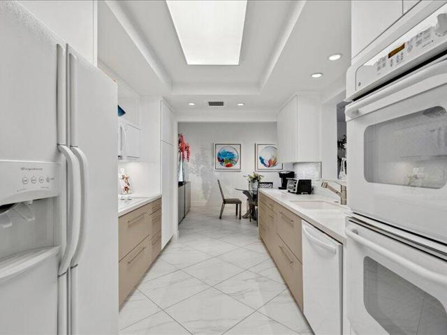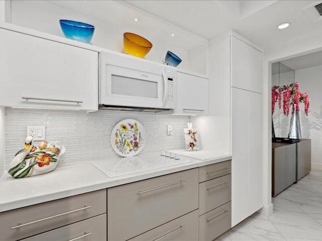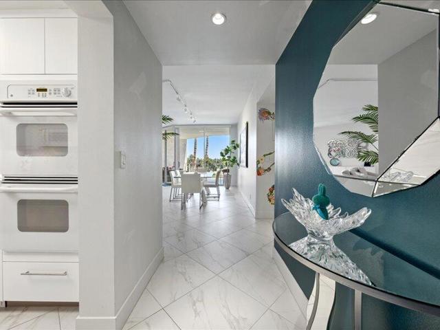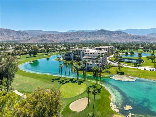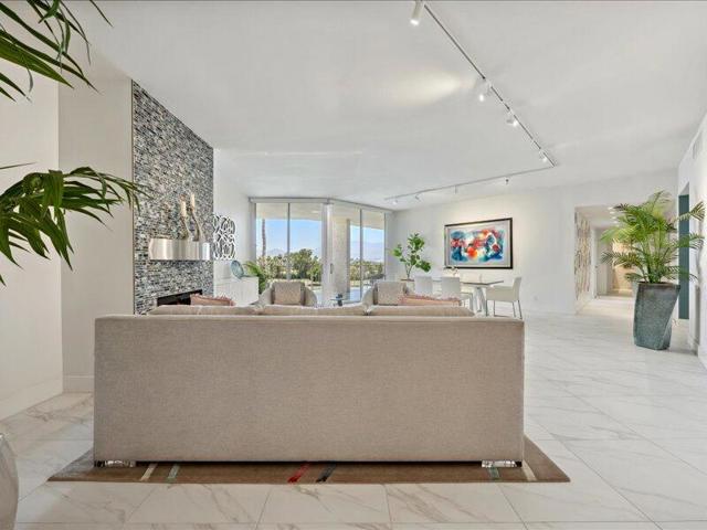 This remodeled home features stylish, contemporary design and offers tranquil lake, mountain, and golf course views from every room. It includes attractive marble-look tile flooring throughout, custom lighting, a living room with striking glass-tiled fireplace and 9-foot floor-to-ceiling windows leading to spacious terrace perfect for relaxing. The spacious main bedroom suite has walk-in closet, built-in custom cabinetry and desk area, and ensuite bath with quartz counters, double sinks and walk-in shower. The flexible guest room serves as a den with a Murphy bed and terrace access. The kitchen boasts Euro-style cabinets, quartz waterfall counters, glass tile backsplash, and double ovens. There is also a spacious laundry room with second refrigerator.Simply pack your toothbrush, as this home is already furnished with high-quality contemporary pieces from ''Eriks Furniture'' all included.The HOA fees cover 24-hour guard-gate, Spectrum cable TV, Wi-Fi Internet along with water, trash, gas and the maintenance of landscaping and common areas, providing a low-maintenance easy lifestyle. It is conveniently located close to shopping, dining, theaters, galleries, and casinos, and has easy access to Eisenhower Medical Center. Desert Island is a unique high-rise condominium community nestled on a lush green 25-acre island, surrounded by a sparkling lake and immaculate 18-hole championship golf course. Homeowners enjoy the open park-like grounds with walking paths, fruit trees, benches, tennis and pickleball courts, heated swimming pools and spas, pedal boats, fishing and guard gate entry. Buyer to verify square footage