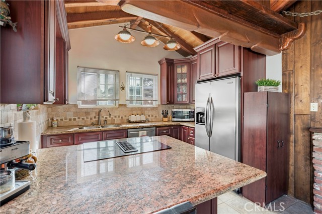 Welcome to 5016 Falcon Avenue, a warm and inviting Long Beach retreat that perfectly blends rustic charm, traditional comfort, and modern upgrades throughout. Step inside to discover a cozy living area, with private living quarters and a full bathroom thoughtfully separated from the home’s main entertainment spaces. This residence has been fully upgraded with dual-pane windows, a new A/C and heater (installed two years ago), newer water heater, copper plumbing, and well-preserved oak and tile flooring. The spacious, permitted living room addition showcases soaring wood-beamed ceilings, natural wood paneling, and a brick fireplace, creating a welcoming atmosphere for both relaxation and entertaining. Large sliding glass doors bathe the room in natural light, offering seamless indoor-outdoor flow. The beautifully remodeled kitchen features granite countertops, custom cabinetry, stainless steel appliances, and a breakfast bar peninsula—ideal for gathering with family and friends. Exposed beams and designer lighting add a touch of craftsmanship and warmth to this stunning culinary space. Outside, the property features minimal, drought-friendly landscaping and a garage extension that’s perfect for a workshop, office, gym, or potential ADU conversion. The two-car garage is complemented by two additional gated parking spaces and a bonus driveway that can accommodate up to three more vehicles or RV parking. With thoughtful finishes, abundant charm, and modern conveniences, this home offers a rare combination of character and comfort in the highly desirable Bixby neighborhood of Long Beach.