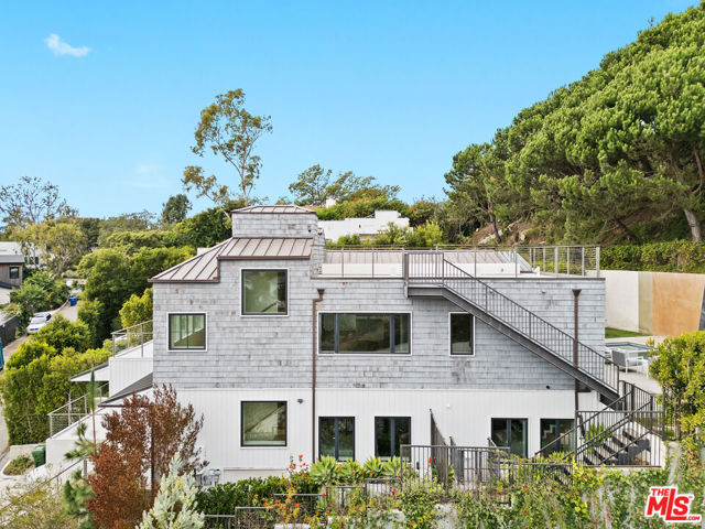 No need to rebuild, this home is ready now! Perched on a quiet street above the Palisades Village, this stunning Cape-Cod inspired residence built in 2019 offers sweeping views of the Pacific Ocean and the city skyline. Thoughtfully designed across three expansive levels, this stunning contemporary masterpiece features 5 bedrooms, 7 bathrooms, and effortlessly blends refined interiors with seamless indoor-outdoor living. Crafted for modern living, this smart home includes a spacious media room with wet bar, a sparkling pool and spa, and an expansive rooftop deck showcasing spectacular ocean vistas. The gourmet kitchen flows into both the private backyard and the elegant formal dining and living areas, complete with a fireplace and a sunlit terrace. The luxurious primary suite is a tranquil retreat, boasting panoramic ocean views from its private patio, a cozy fireplace, an oversized walk-in closet, and a spa-inspired bathroom with steam shower and soaking tub. Each additional bedroom is en suite, offering privacy and comfort. Additional highlights include an oversized two-car garage, a private elevator, full laundry and utility rooms, and smart-home technology throughout. Located in the coveted Alphabet Streets of Pacific Palisades, this exceptional home is just moments from the shops, restaurants, and charm of the Palisades Village.