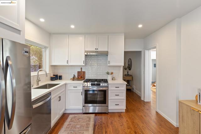 Fully remodeled in Fall 2025, 558 North is the quintessential California bungalow—where timeless charm meets modern updates. With just over 1,200 sq. ft.* of beautifully finished living space, this 2-bedroom, 1-and-a-half-bath home strikes a perfect balance between vintage character & contemporary comfort. Step inside & you’re greeted by sunlight, a generous picture window, & details of the original fireplace. Outside, a storybook tree offers privacy; inside, chestnut-hued hardwood floors stretch throughout, grounding every room in warmth & flow. The dining room offers an elegant setting for everyday meals or special gatherings, w/a built-in cabinet featuring etched glass doors that nod to the home’s vintage soul. Beyond, the kitchen has been completely reimagined with new cabinetry, stainless steel appliances & subway tile (2025). The inviting eat-in area opens onto a deck, creating indoor-outdoor flow & easy access to the garden below—perfect for entertaining or unwinding after a long day. Light & airy, the primary bedroom includes an en suite half bath, while the second bedroom enjoys a view of the garden. Downstairs, a versatile basement & laundry area provide level access to the outdoors—ideal for use as a mudroom or extra storage. Close to Bushrod Park, dining and transit.