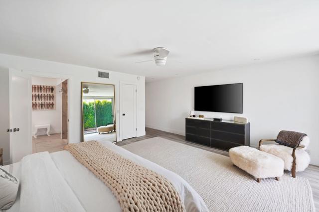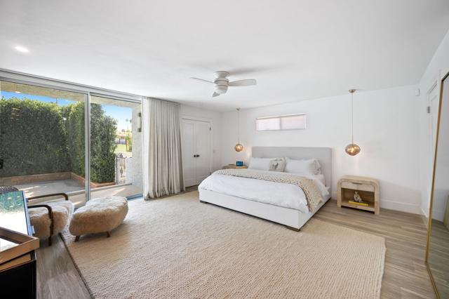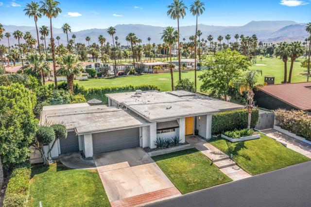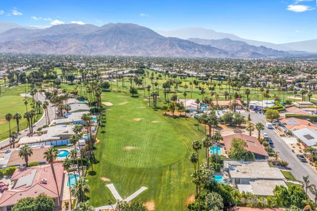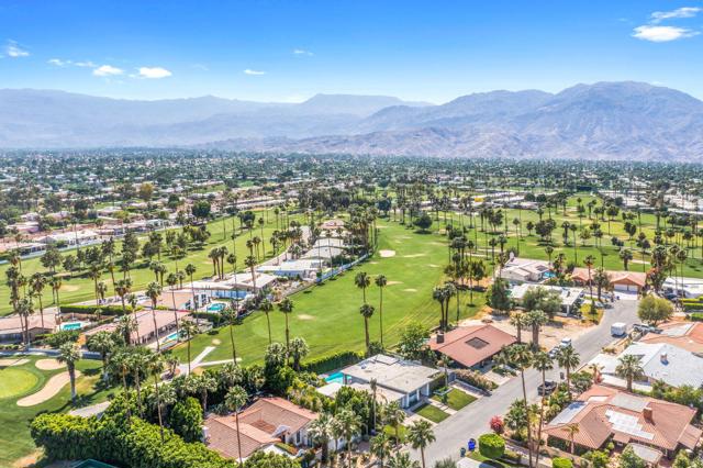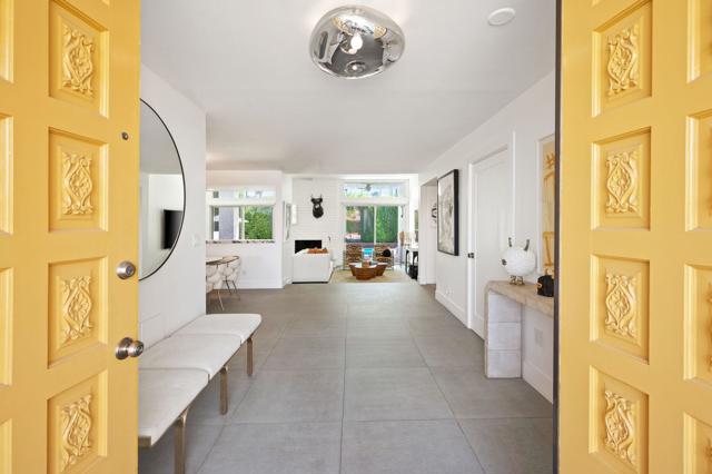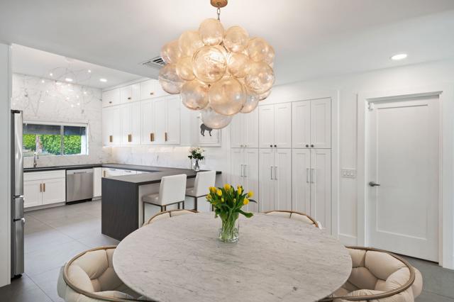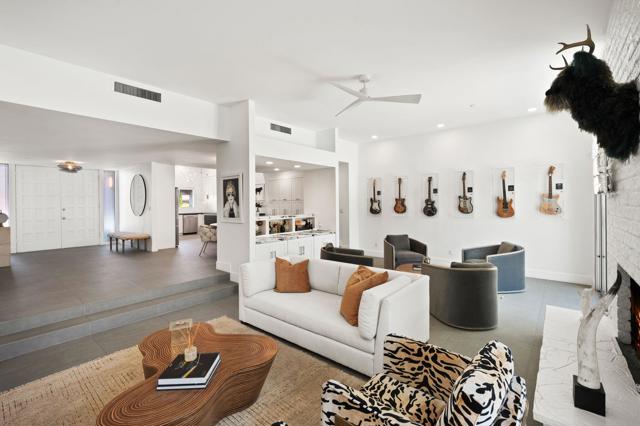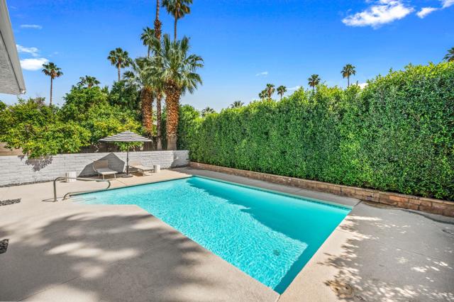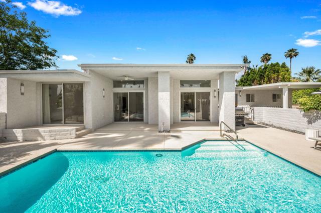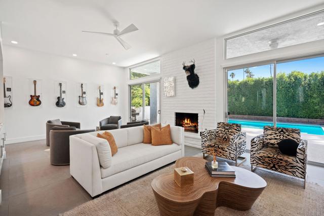 Designed by acclaimed New York designer Deux Ellis, this South Palm Desert residence is a true statement of modern desert living. Located along Shadow Mountain Golf Course, the home blends timeless design with thoughtful details and luxurious finishes throughout.Inside, warm stone and wood flooring meet Italian leather marble countertops and Restoration Hardware fixtures, creating an elevated yet comfortable atmosphere. The open kitchen with stainless steel appliances and bar seating flows seamlessly into a sunken living room with a charming brick fireplace and wet bar ideal for entertaining or relaxing evenings in. Expansive windows and sliders fill the home with natural light and open to the south-facing backyard, where the sparkling pool takes center stage against the mountain backdrop.Each bedroom offers direct patio access for effortless indoor-outdoor living, while the separate office provides flexibility for work, art, or wellness space. Outside, enjoy multiple seating areas, a covered patio, and lush landscaping with mature citrus trees, all designed for privacy and relaxation.Additional highlights include a two-car garage plus golf cart space, designer lighting by Tom Dixon and Oly Studio, and no HOA fees. Just minutes from El Paseo's shopping and dining and within the Washington Charter School District, this home embodies the best of desert living.