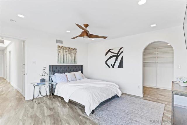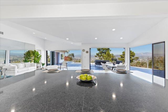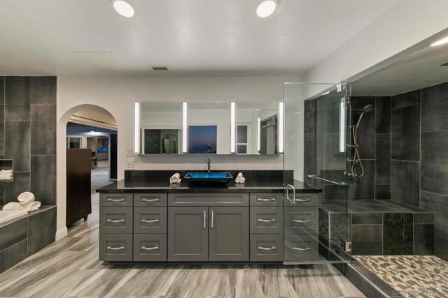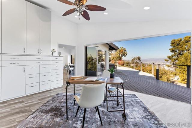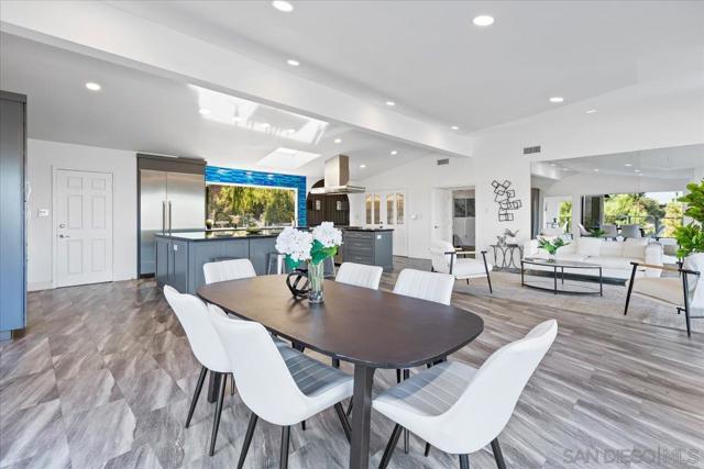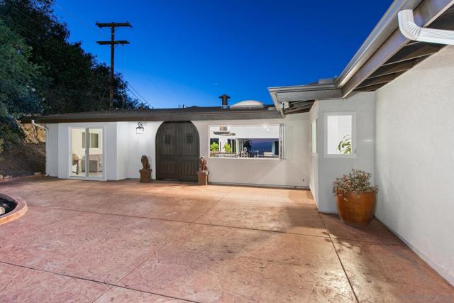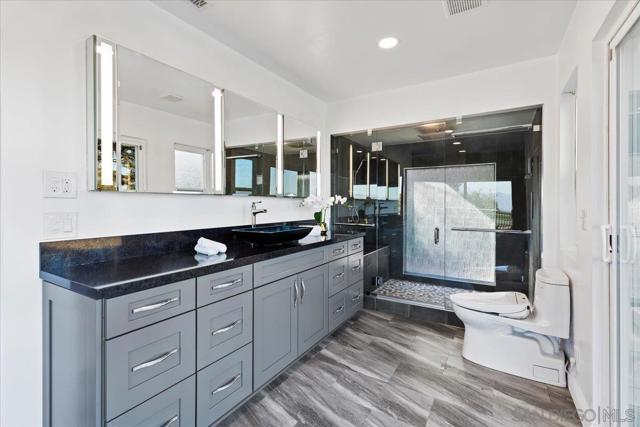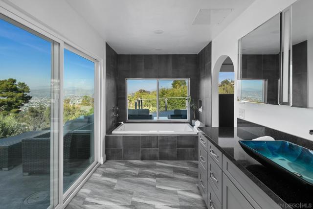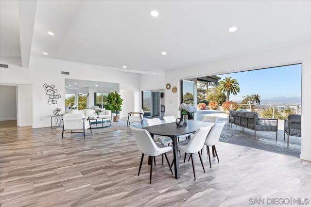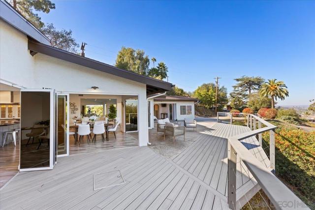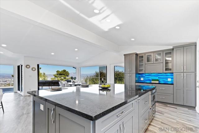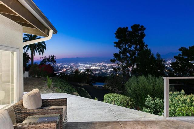 Tucked at the end of a quiet cul-de-sac on an expansive 0.63-acre lot in prestigious Mount Helix, this stunning single-level home captures sweeping mountain and twinkling city-light vistas, refined upgrades, and effortless indoor-outdoor living. A private courtyard with custom-stamped concrete introduces striking double entry doors, unveiling a voluminous living space where floor-to-ceiling glass panels fold open to the surrounding natural landscape. The open concept design flows into an elegant dining area and designer chef’s kitchen appointed with upscale soft-close custom wood cabinetry, quartz countertops, custom tile accents, premium Thermador appliances, a walk-in pantry and an oversized island. A dramatic family room with soaring ceilings extends to an impressive custom-built Trex deck—artfully crafted to harmonize with the mature trees and embrace panoramic views, creating a spectacular backdrop for both everyday living and elevated entertaining. The serene primary retreat offers a custom walk-in closet and a spa-inspired ensuite featuring a jetted soaking tub, walk-in shower with bench seating, bidet, quartz surfaces and refined lighting. Thoughtful enhancements and modern comforts abound, including owned solar, Trane HVAC, a new roof and gutters, Tesla charger, fresh stucco, new garage door, skylight, recessed lighting and luxury vinyl plank flooring throughout. The expansive grounds create a private outdoor haven with a flat lawn for play and relaxation, an 8-person therapeutic spa and outdoor shower, and an extended driveway with generous parking for RVs, toys and guests—plus convenient rear property access. Additional conveniences include a dedicated laundry room with custom storage and a garage offering abundant organization. All just minutes to shopping, dining, top-rated schools, and major freeways, this exceptional residence presents a rare opportunity to enjoy a peaceful, luxurious and rejuvenating lifestyle in one of Mount Helix’s most sought-after settings.