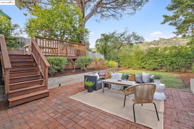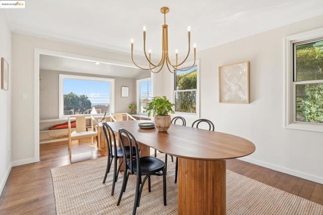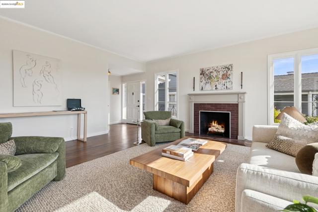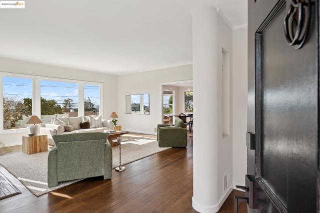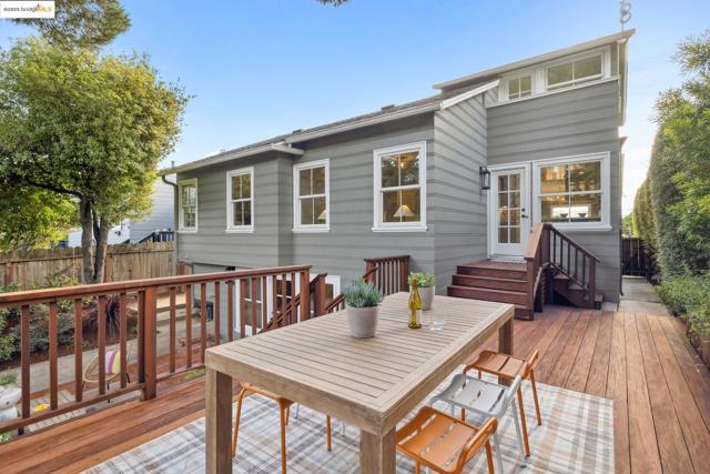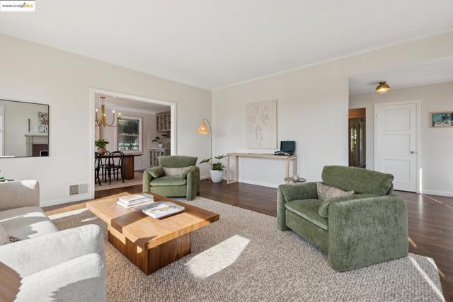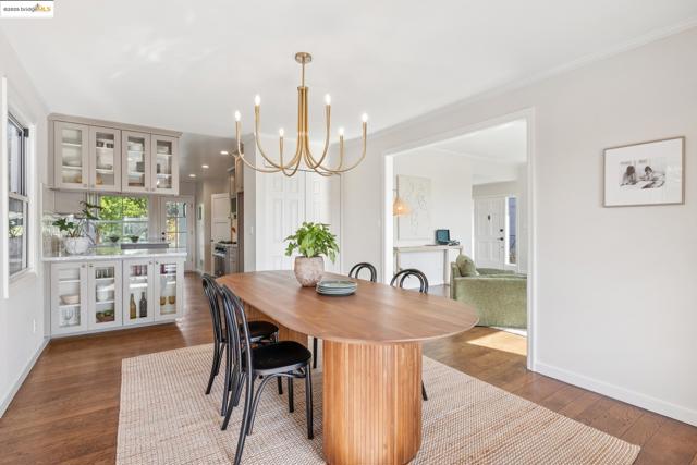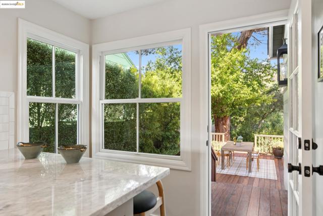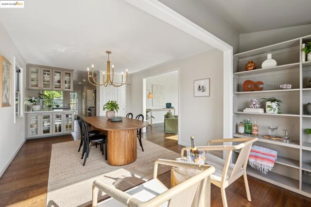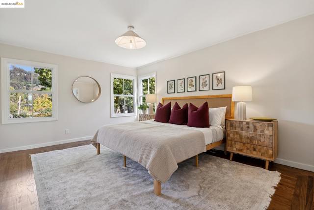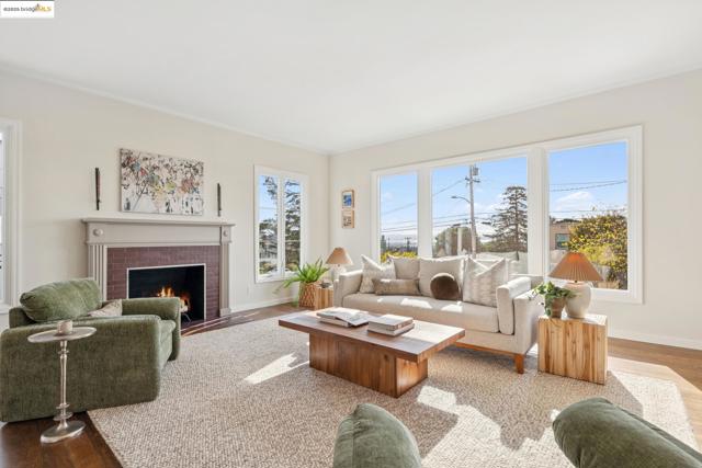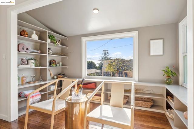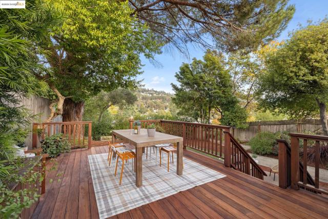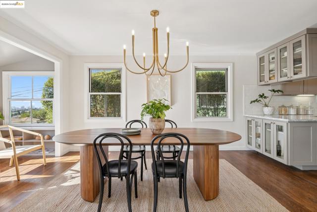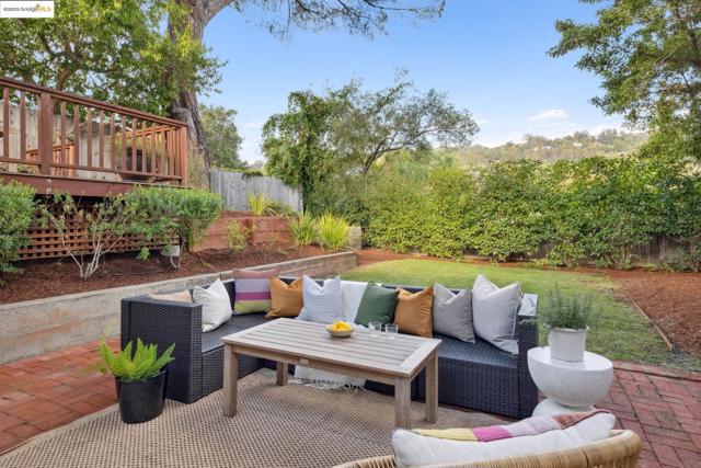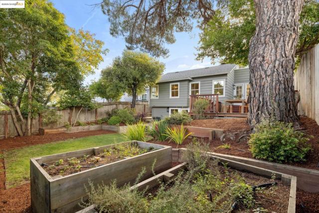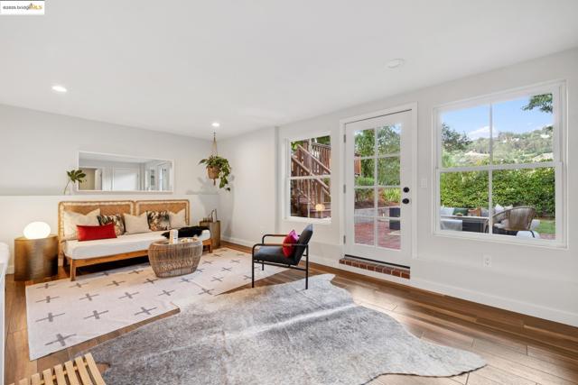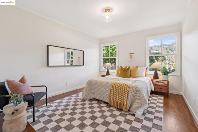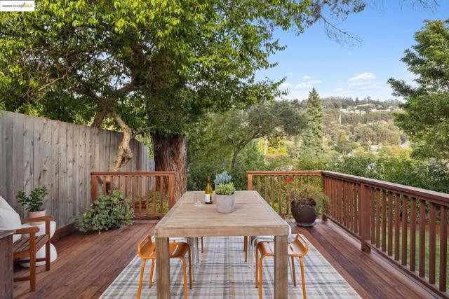 Rare Oakland Hills home checks every box. Midcentury charm w/ modern updates & fantastic Bay views. 3-level retreat w/4 bedrooms, flexible living areas, & seamless indoor-outdoor flow- minutes to top-rated Redwood Heights Elementary. Main level opens to bright living room w/ high ceilings & big windows framing views of San Francisco & Bay. Dining room adjoins the living room, connects to cozy reading nook & flows to updated kitchen. Refinished hardwood floors, custom details & built-ins preserve timeless character yet enhance everyday functionality. Reimagined w/ designer lens, kitchen pairs marble c-tops w/ b-fast bar & SS appliances, incl Bertazzoni gas range, new dishwasher. Glass door opens to deck & backyard. True primary ensuite bath, 2nd bedroon & hall bath complete this level. Upstairs, a spacious bedroom retreat w/ spectacular Bay views & opens to private balcony. Light-filled lower level accessed from laundry / office or garage, makes great family room or inlaw/ guest suite w/ full bath, closet, storage & direct access to brick patio & level lawn. More features - laundry area w/ sink, cabinetry, built-in desk, 2-car garage, & organized storage. Landscaped backyard w/ zones- entertaining, relaxation, gardening & play. Walk to Jordan Park. Close to Montclair, Parks & more