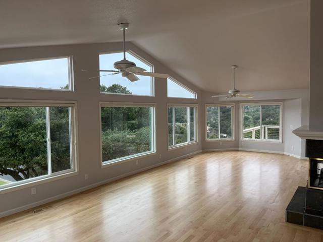 This is the one! Newly refinished maple hardwood floors, soaring ceilings, and a wall of windows showcasing endless views create a spectacular Great Room ambiance that is spacious and inviting. Secluded yet not remote, this beautiful Prunedale-area retreat offers a convenient single-level floor plan with a Primary bedroom suite and 2 secondary bedrooms. Step outside to enjoy peaceful outdoor dining or relaxing conversation on the brand-new, expansive back deck which peers down over serene green vistas. The large lower-level bonus room with access to its own private patio and adjacent half bathroom offer possibilities for a second family room, workshop, man cave retreat, or potential 4th bedroom. Nestled in a small, well-maintained community of 14 similar homes, this gem is move-in ready and still offers room to add your personal touches. HOA is only $461 annually and is used to maintain the newly refinished roads.