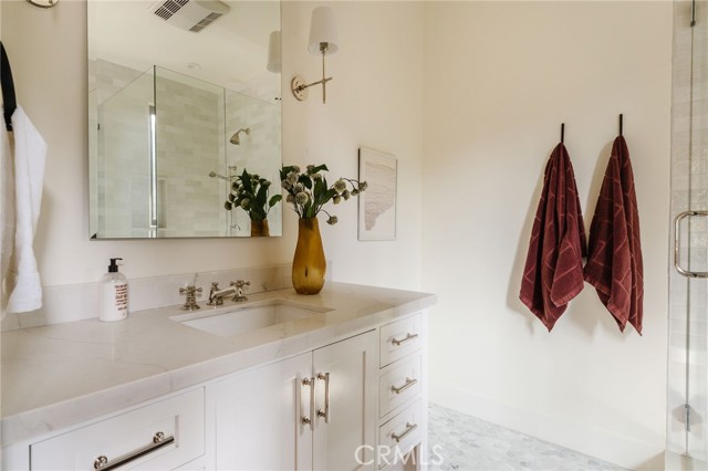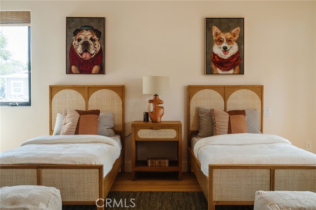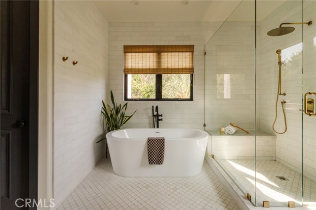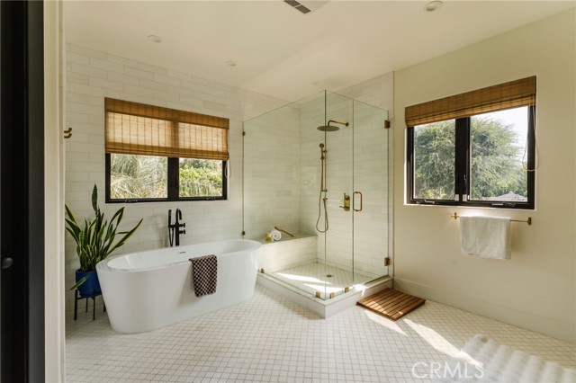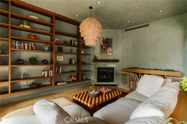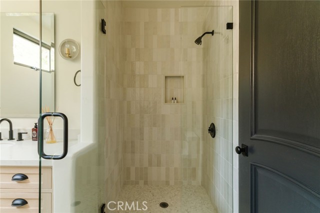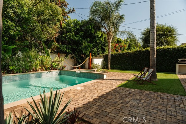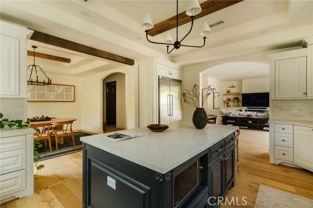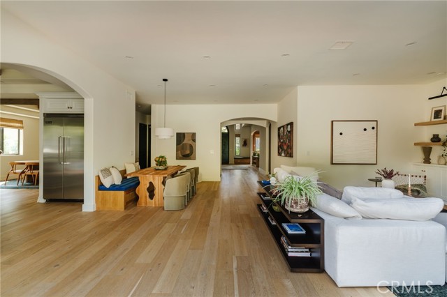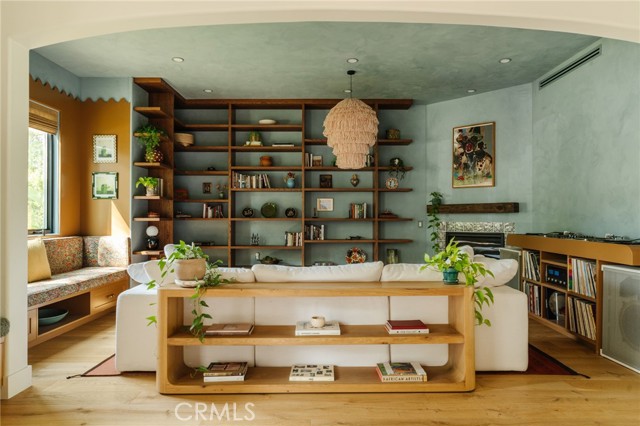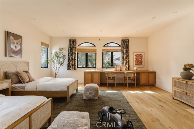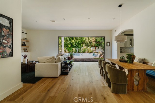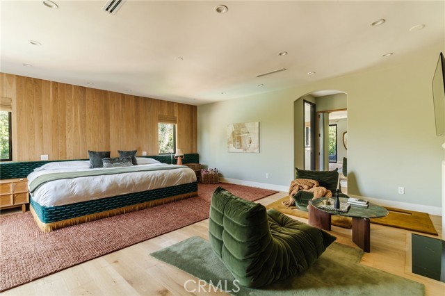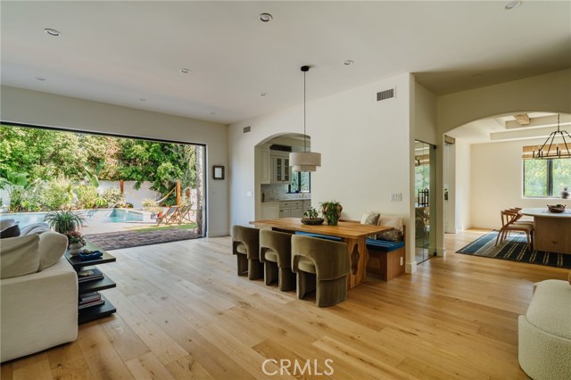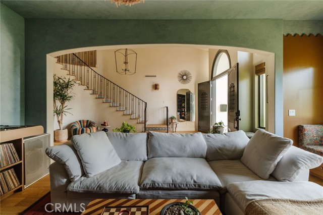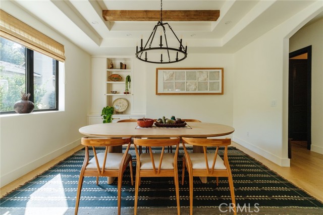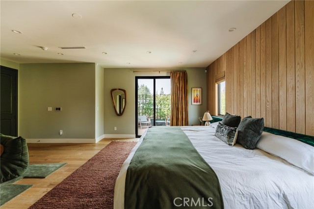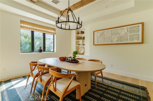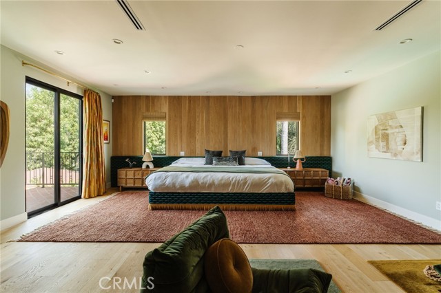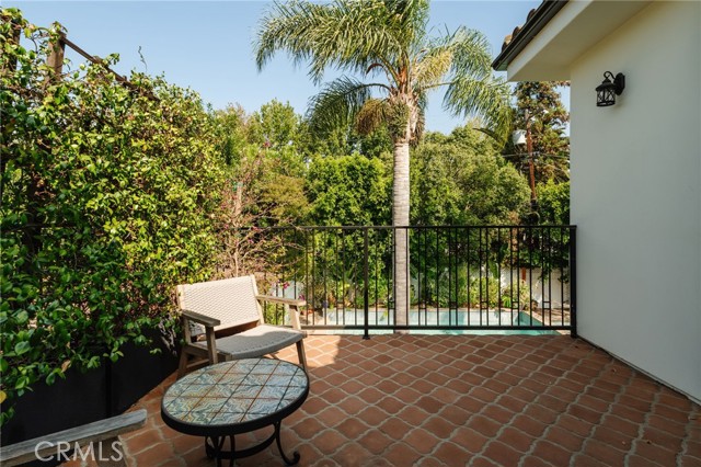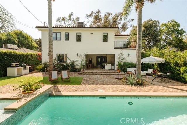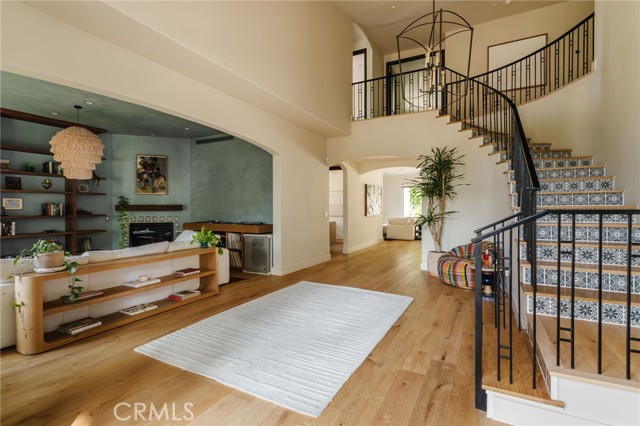 Tucked away in a prime Sherman Oaks neighborhood, this contemporary Mediterranean estate has been fully updated, blending sophisticated designer finishes with unique and personal touches. Designed by notable Architectural Digest Top 100 interior designer, Mandy Cheng, this property is a statement. Upon entering, you’re greeted by double doors that lead into a grand foyer with soaring double-height ceilings, setting the tone for the home’s spacious and inviting atmosphere. One of the home’s standout features is the formal living space/library room, designed to offer a peaceful escape. It houses custom-built shelves and nooks for reading, making it the perfect space for relaxation and creativity. The open-concept main living space includes a family room with a sleek fireplace surrounded by custom built-ins, stunning warm colors, a beautiful chef’s kitchen outfitted with top-of-the-line Viking appliances, and both formal and informal dining areas perfect for hosting family and friends. With floor-to-ceiling glass doors that pocket, this creates the perfect indoor-outdoor entertainment space, flowing into your nearly 8,000 square foot lush backyard. The first floor also includes a laundry room, a bedroom, a full bathroom, and a powder room. Upstairs, you’ll find two luxurious primary suites. The larger of the two features an intimate fireplace, private balcony, spacious walk-in closet, and a spa-like bathroom complete with a soaking tub, rainfall shower system, and double vanity. Additionally, two generously sized bedrooms with custom closets offer ample space for family or guests.