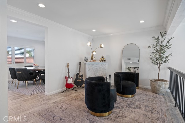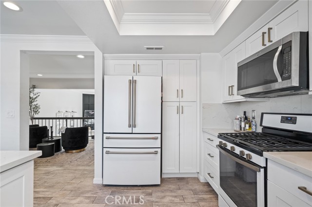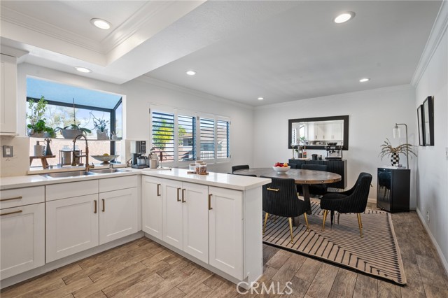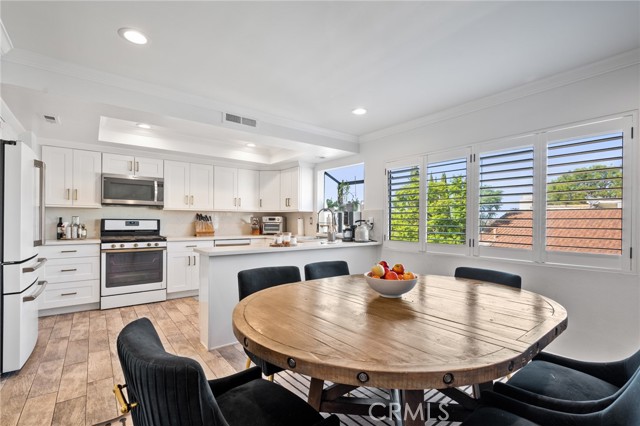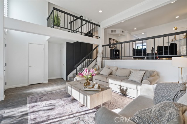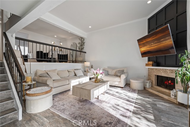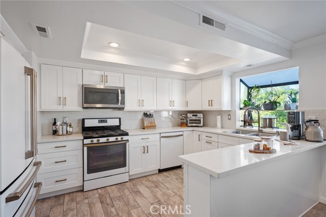 Stylish and spacious 3-bedroom, 2.5-bath residence ideally located near shopping, dining, and conveniences. The open split-level layout features a bright living room with soaring vaulted ceilings, an elegant black-accent fireplace wall, and wide-plank flooring flowing to a private front patio overlooking the community pool. The remodeled kitchen showcases shaker cabinetry, quartz countertops, brass hardware, and stainless appliances, opening to a chic dining area with plantation shutters. The primary suite offers dramatic vaulted ceilings, a custom accent wall, and a beautifully remodeled bath with dual marble vanities. Additional highlights include crown molding, recessed lighting, and a direct-access two-car garage. Located within the highly rated Palos Verdes School District, this home combines quality, comfort, and incredible Peninsula value.
