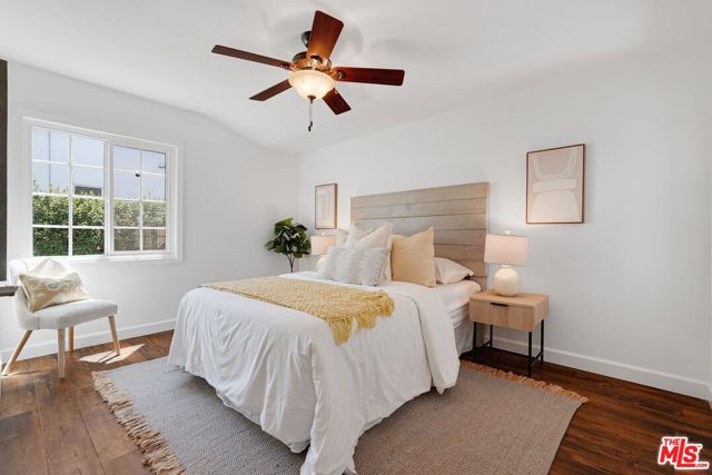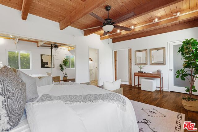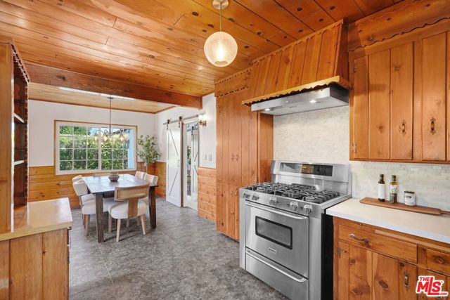 Located just steps from the vibrant shops and restaurants of Ventura Boulevard, this charming single-story ranch blends modern updates with classic character. The spacious living room welcomes you with a cozy wood-burning fireplace and seamlessly flows into a warm, country-style kitchen featuring stainless steel appliances, a walk-in pantry, and an inviting dining area. The private primary suite offers a renovated bathroom and generous closet space, while three additional bedrooms - one with a skylight - share a stylishly updated full bath. Designed for entertaining, the backyard is a true retreat, surrounded by mature privacy hedges and highlighted by a stone patio and a stunning lap pool and spa with a cascading waterfall feature. Additional features include exposed wood-beamed ceilings that add architectural charm, ceiling fans in all bedrooms for year-round comfort, a convenient laundry closet, and a two-car garage equipped with an electric vehicle charging adapter. This move-in-ready gem perfectly combines comfort, style, and convenience in one of Woodland Hills' most desirable neighborhoods.