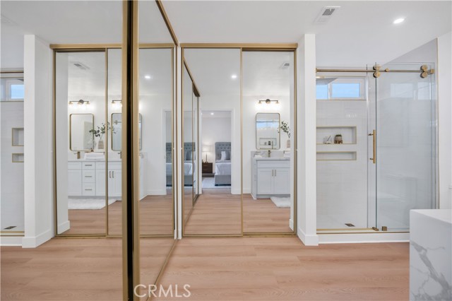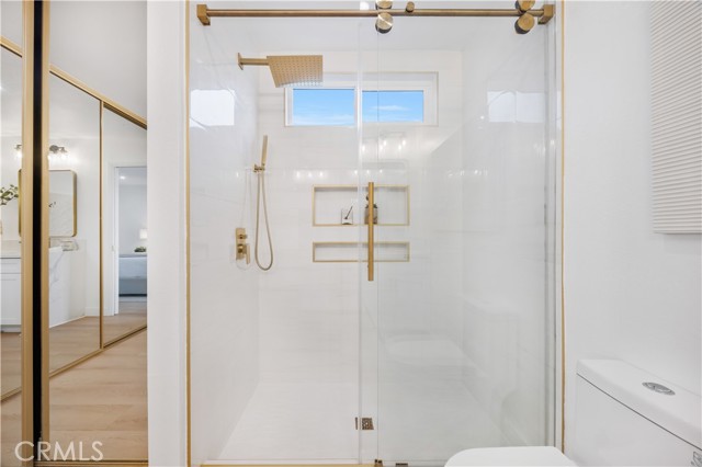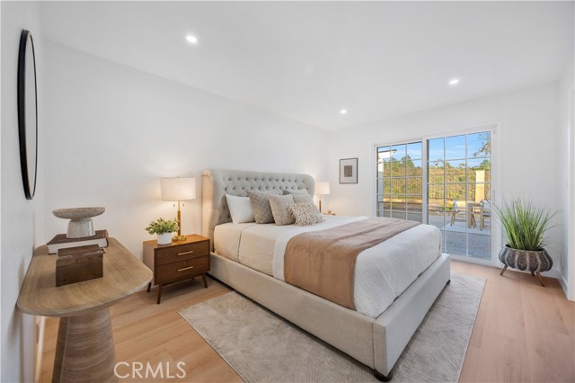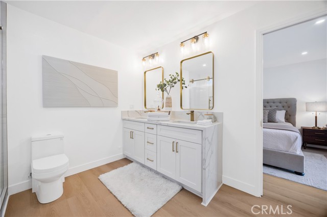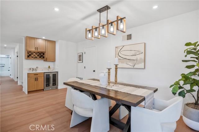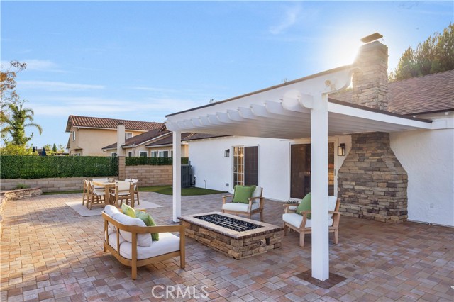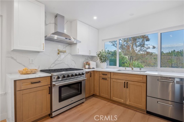This beautifully renovated single story home sits on a quiet cul de sac in Mission Viejo and perfectly blends modern upgrades with style and functionality. Every detail has been thoughtfully designed, from energy efficient systems to designer finishes, making it a truly move in ready residence. Inside, high end waterproof hybrid laminate flooring flows seamlessly throughout, accented by modern baseboards, fresh paint, updated outlets, switches, hardware, and energy efficient LED recessed lighting. The fully remodeled gourmet kitchen showcases custom white and oak Shaker cabinetry with soft close drawers, quartz countertops with a full height backsplash and waterfall edges, ceiling height cabinets, touchless sink with pot filler, and professional grade appliances including a 36" 6 burner Thor gas range, Thor drawer microwave, Thor wine fridge, GE Profile double drawer dishwasher, Samsung refrigerator, and sleek range hood. An elegant farmhouse chandelier and updated fireplace bring warmth to the family room, while new hallway cabinetry and a high capacity washer dryer with overhead storage add convenience. The primary suite offers a spa like retreat with a walk in shower featuring oversized shampoo niches, double vanities with quartz counters, soft close cabinetry, and upgraded fixtures. All bathrooms have been fully remodeled with modern cabinets, countertops, faucets, mirrors, and low flow toilets. Each bedroom has new flooring, baseboards, paint, and lighting for a fresh, modern feel. Additional smart home features include a Nest thermostat, Ring camera doorbell, and a full PEX repipe for added peace of mind. The private backyard is fully enclosed, perfect for pets and children, and offers serene mountain views with no neighbors behind. A stylish maintenance free privacy fence with lush greenery enhances the outdoor living space. The finished two car garage has been freshly drywalled, painted, and upgraded with epoxy flooring. Residents also enjoy exclusive access to Lake Mission Viejo, featuring sandy beaches, swimming, boating, fishing, a clubhouse, and year round events. With no Mello Roos, a low HOA, and a prime location, this turnkey single story is a rare opportunity in one of Mission Viejo’s most sought after neighborhoods.
