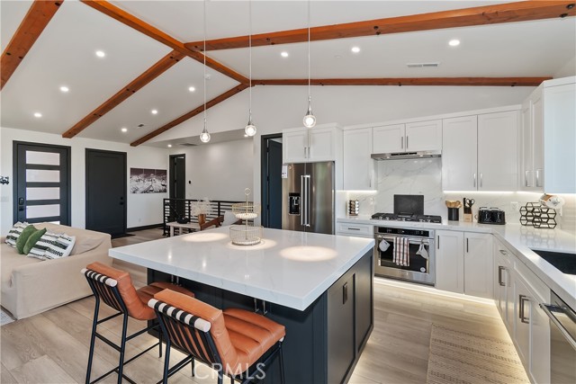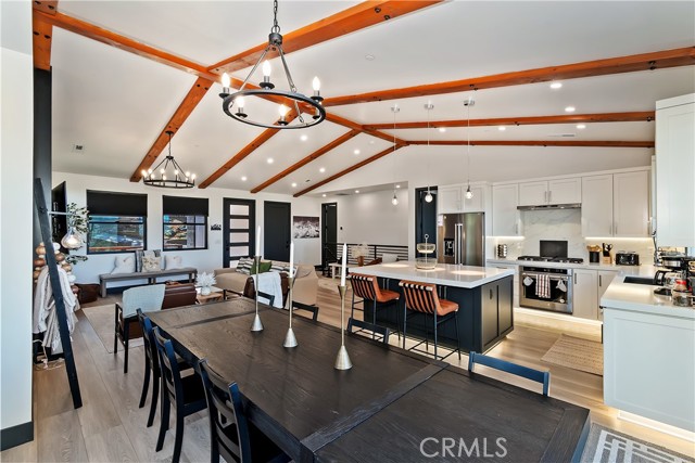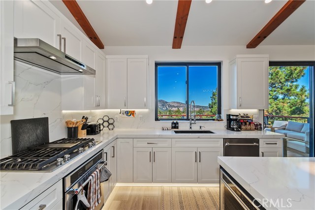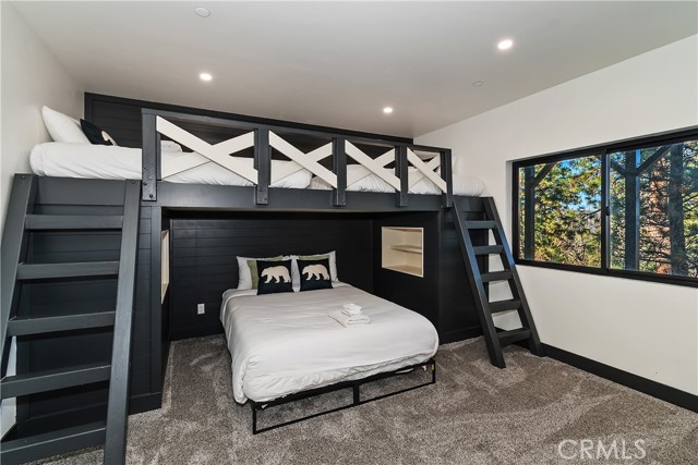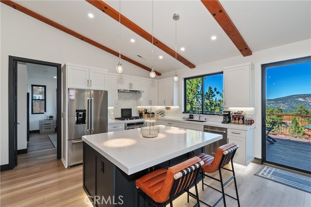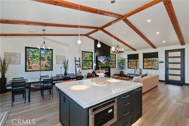 LIKE NEW WITH A VIEW! Wait until you see the views from this stunning, 2024-built four-plus-bedroom, four-bathroom home situated atop quiet Moonridge. Features include a Chef's Kitchen complete with SS KitchenAid appliances, including a gas range/oven combo, a dishwasher, a Sharp below-counter microwave oven drawer, quartz countertops, and a large kitchen island with ample custom cabinetry throughout. The home features three fireplaces, marble bath enclosures, and custom accent lighting that will surely make life like the Jetsons. It also includes a convenient street-level attached garage on the main level, which features the open living room, kitchen, and dining area, as well as a half bathroom and an en-suite primary bedroom with a full bath. Plenty of room to romp with an additional sleeping area featuring built-in bunk bed lofts in the spacious game room. A full-size laundry room includes a full-size refrigerator and a deep sink. Enjoy the incredible mountain views from all three levels, especially from the massive main deck, which seems like an extension of the main living area.