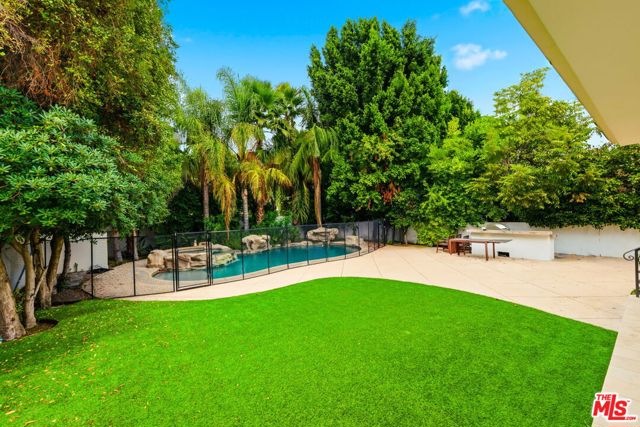 Nestled in one of Encino's most sought-after neighborhoods, this stunning modern Spanish residence perfectly blends timeless architecture with contemporary design. Behind private gates, a lush tropical setting frames this immaculate two-story home featuring four bedroom and four bathrooms. The open, light-filled floor plan showcases warm wood floors, elegant archways, and high ceilings throughout.The chef's kitchen is a true centerpiece, equipped with a large center island, Sub-Zero and Wolf appliances, granite counters, and abundant storage seamlessly connecting to a spacious family room with built-in surround sound and fireplace. The main level includes a guest suite, while upstairs the primary retreat offers a fireplace, private terrace, dual walk-in closets, and a spa-like bathroom with jetted tub and steam shower.Step outside to your private resort oasis with a sparkling pool, cascading waterfalls, elevated spa, and built-in BBQ ideal for entertaining or relaxing under the California sun. Located moments from Ventura Blvd, top dining, and Encino Charter Elementary, this is Encino living at its finest.
