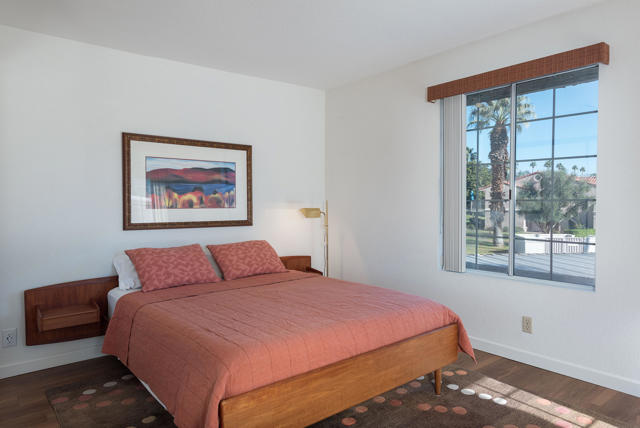 - Top floor updated 2BR/2BA condo at the highly sought after Phase 4 development of the Mesquite Country Club in South Palm Springs- This top floor west facing corner unit is ideally located in the community to take advantage of full on Mountain views and natural sunlight- The formal living room with vaulted ceiling enjoys direct access though sliding glass doors to a large private deck to further enjoy the view and allow for indoor/outdoor entertaining- Classic kitchen with newer appliances awaits your personal touch- Large primary bedroom with an ensuite bath with double vanity and excellent closet space also has sliding glass doors directly to a large view deck- The good sized guest bedroom has it's own private patio- The separation of bedrooms and baths allow for maximum privacy for guests- Beautiful newer vinyl flooring throughout, travertine flooring in the bathrooms and solid pine doors with heavy bronze hardware give the home a sophisticated feel- Private stacked washer & dryer- Private covered parking spot with plenty of guest parking- On fee land - property is not on leased land - HOA amenities include tennis and pickleball courts, swimming pools and spas- Adjacent to the Prescott Preserve with hiking trails, the land is currently being restored to a beautiful native desert habitat - HOA Dues: $508/mo. (includes garbage, water, insurance, cable TV, internet, professional management and more)- Built in 1984 and 1175 sq ft (per Realist Property Detail - not verified by sellers or agent) - Mesquite Country Club is conveniently located minutes from downtown and the airport